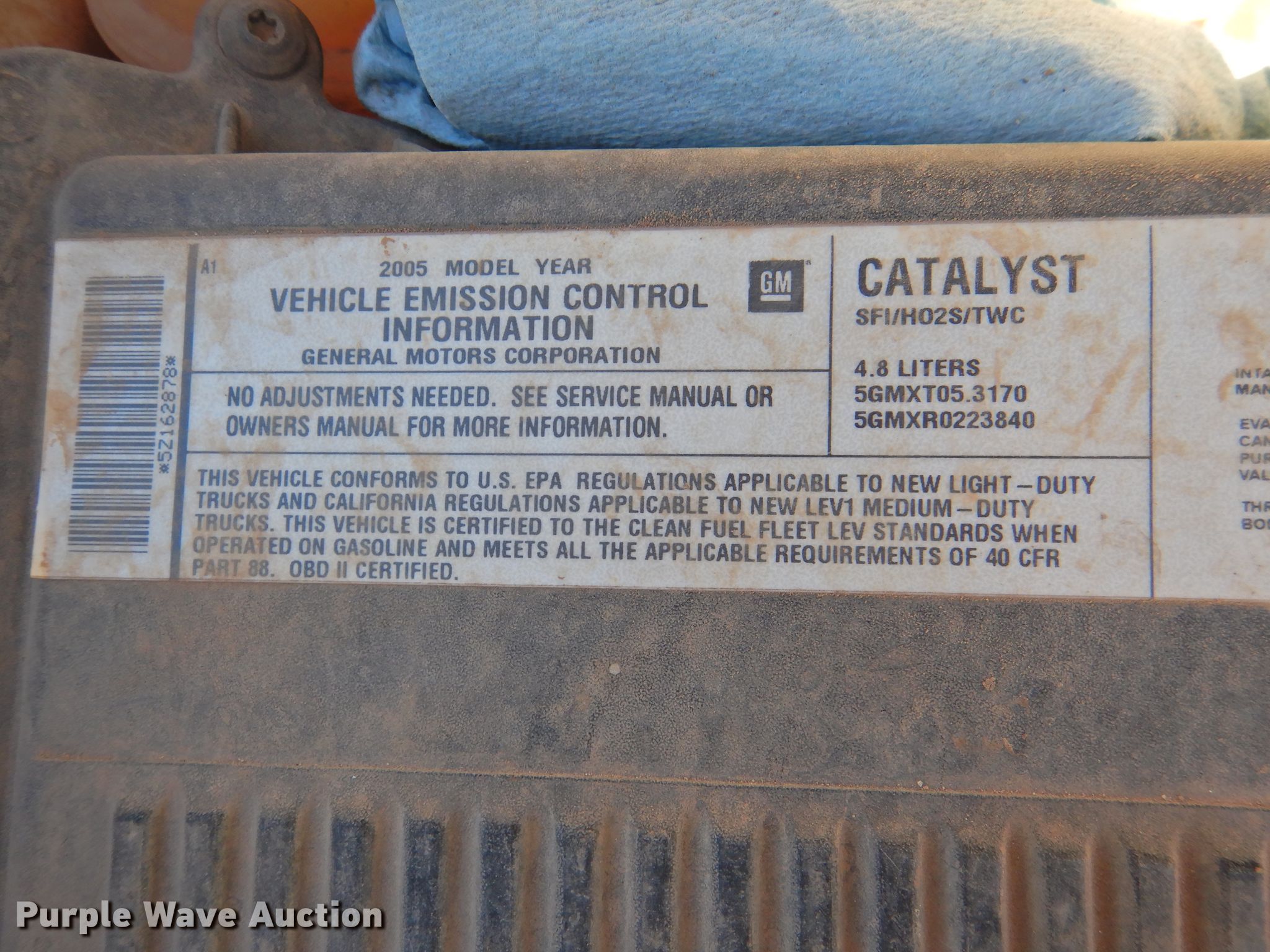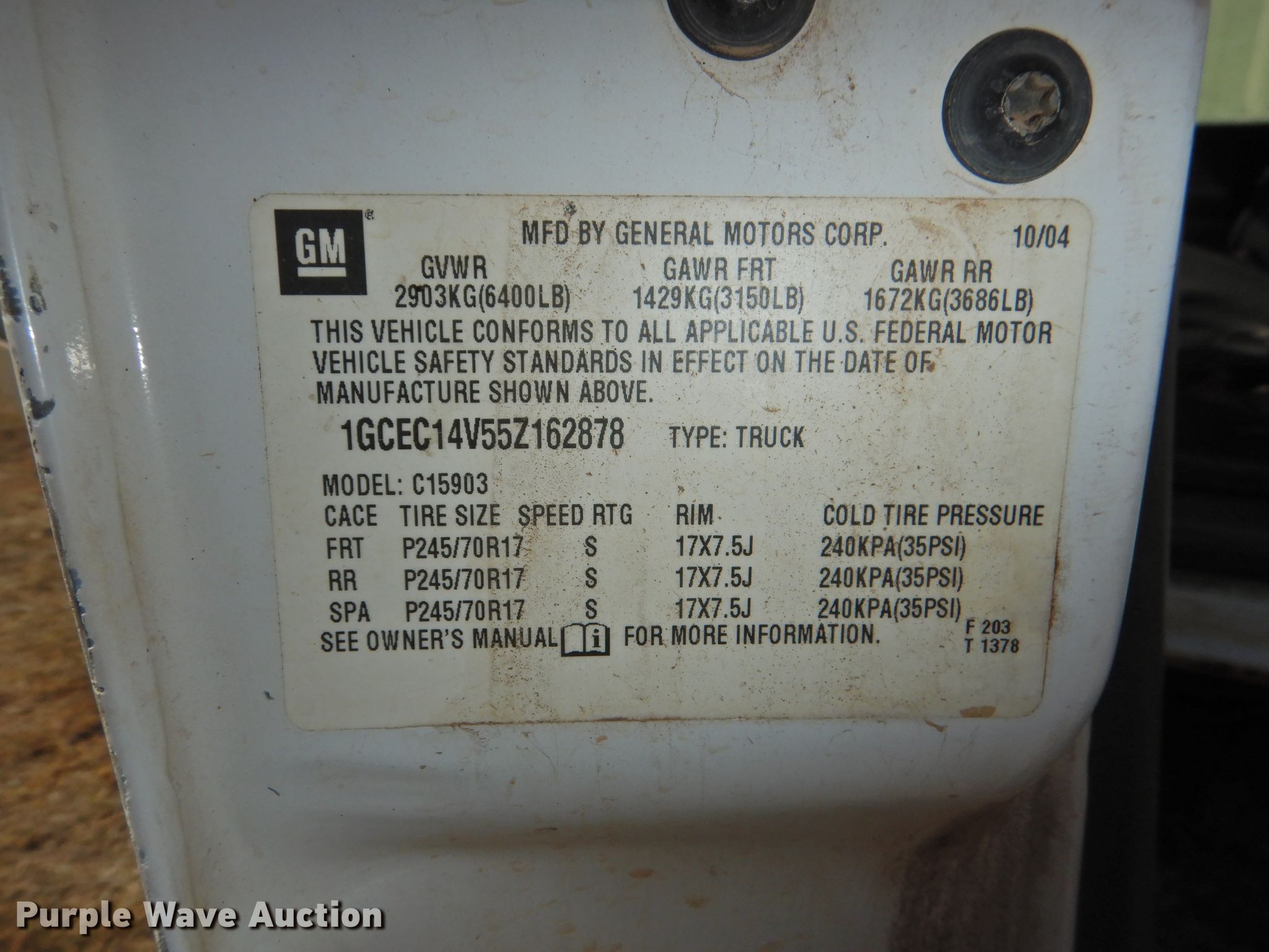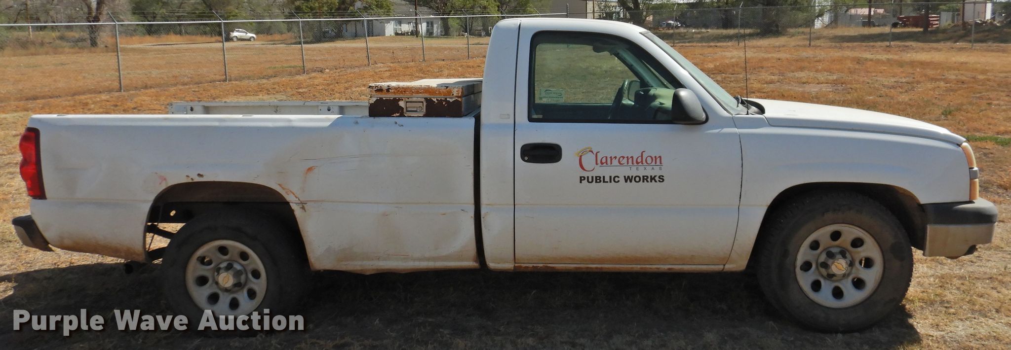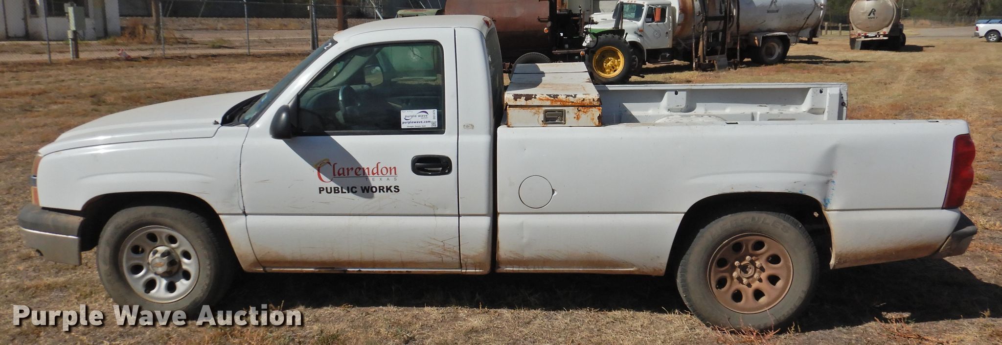 2005 Chevrolet Silverado 1500 pickup truck. 127,546 miles on odometer. Engine Displacement: 4.8L V8 OHV 16V, Cylinders: 8, Fuel type: Gas. Transmission Automatic. Interior AC, Heat, Cruise control. Tires Size: 245/70R17. Notes Dash warning indicator: Check engine, Air bag, Engine misfire, Heat and AC controls missing, Tailgate missing. Texas title. 1GCEC14V55Z162878. City of Clarendon. Clarendon, TX 79226