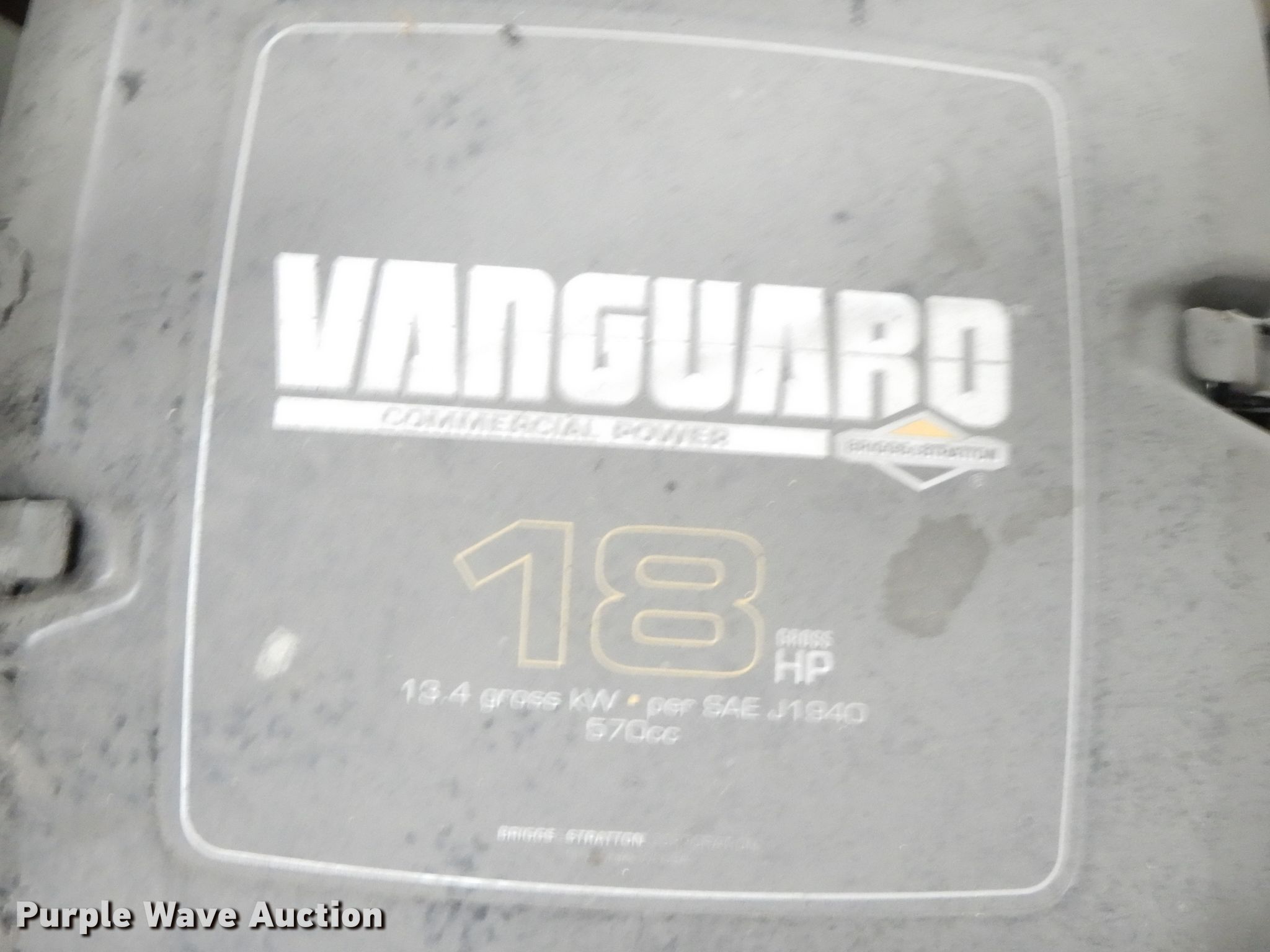 Grazer G2097V lawn mower. 829 hours on meter, Serial: 95GT04D003. Engine Vanguard, Displacement: 570cc, Cylinders: 1, Fuel type: Gas, HP: 18. Transmission Hydrostatic. Operational Mower deck Width: 60". Tires Front: 11 x 4.00-5, Rear: 18 x 8.50-8. Notes Dead Battery. City of Thayer. 105 Preston St. Thayer, KS 66776