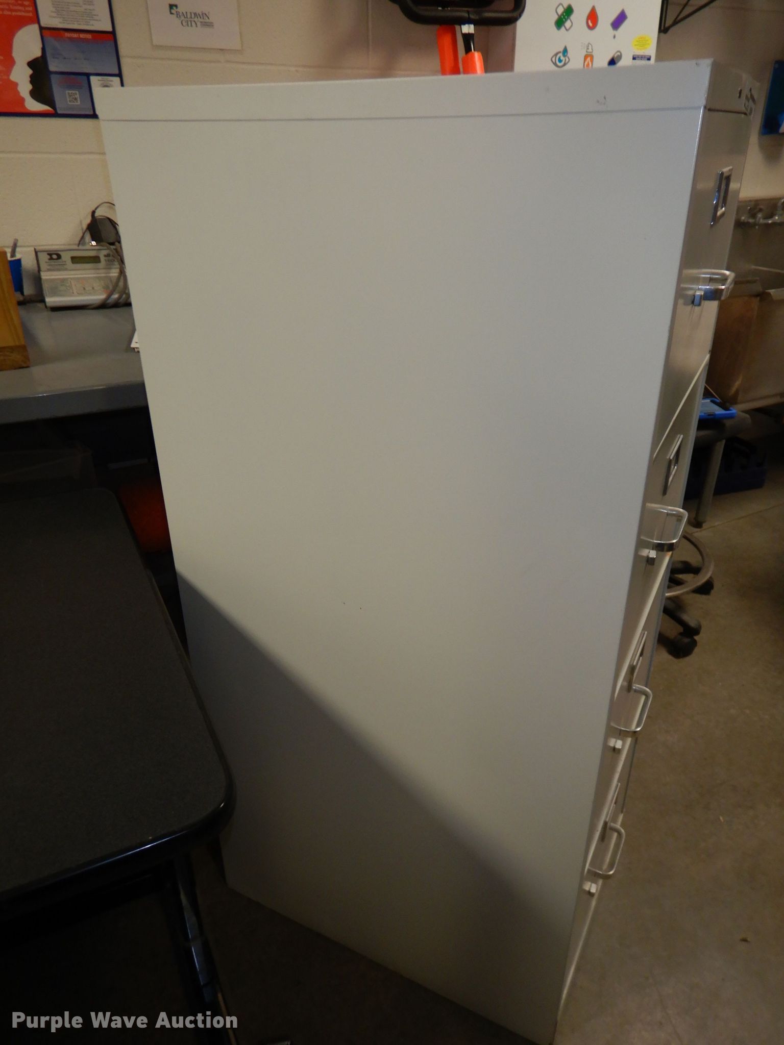 Purple Wave is selling a used Furniture in Kansas. This item is a Furniture with the following: Four drawer metal filing cabinet, Three drawer wood filing cabinet, Wood table, 4' x 30"