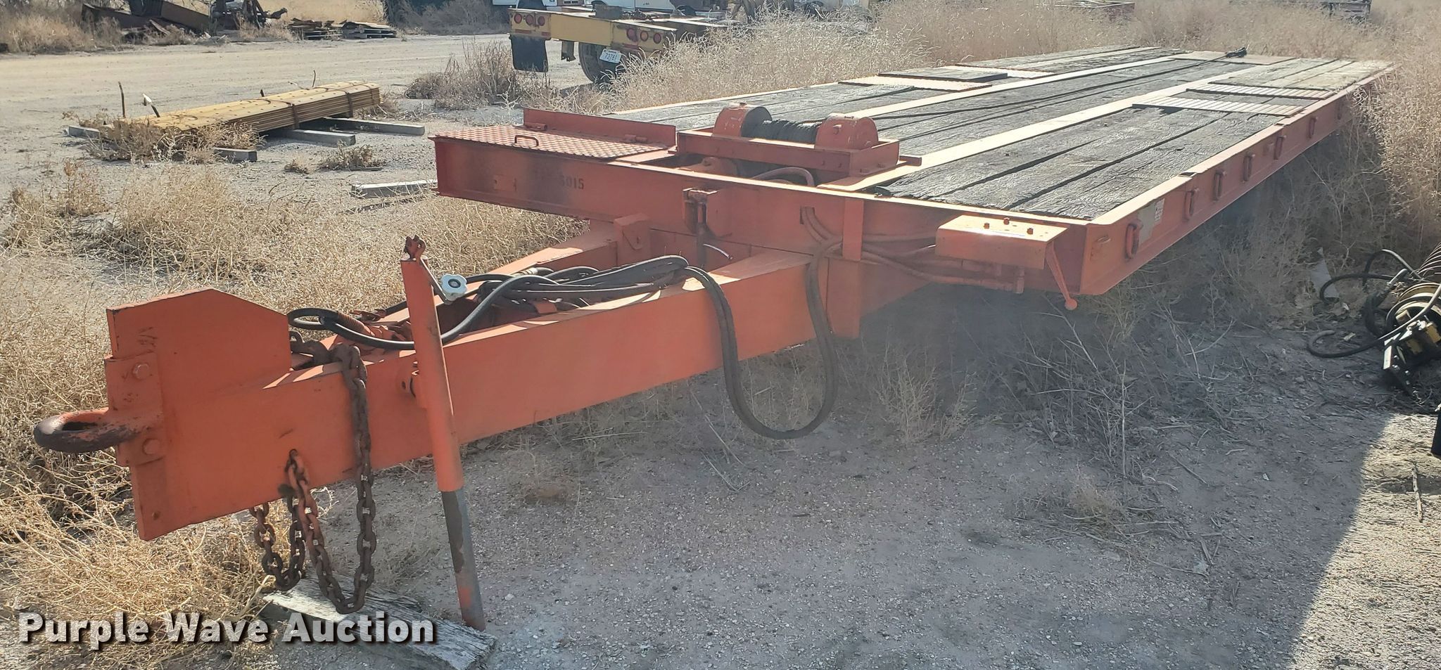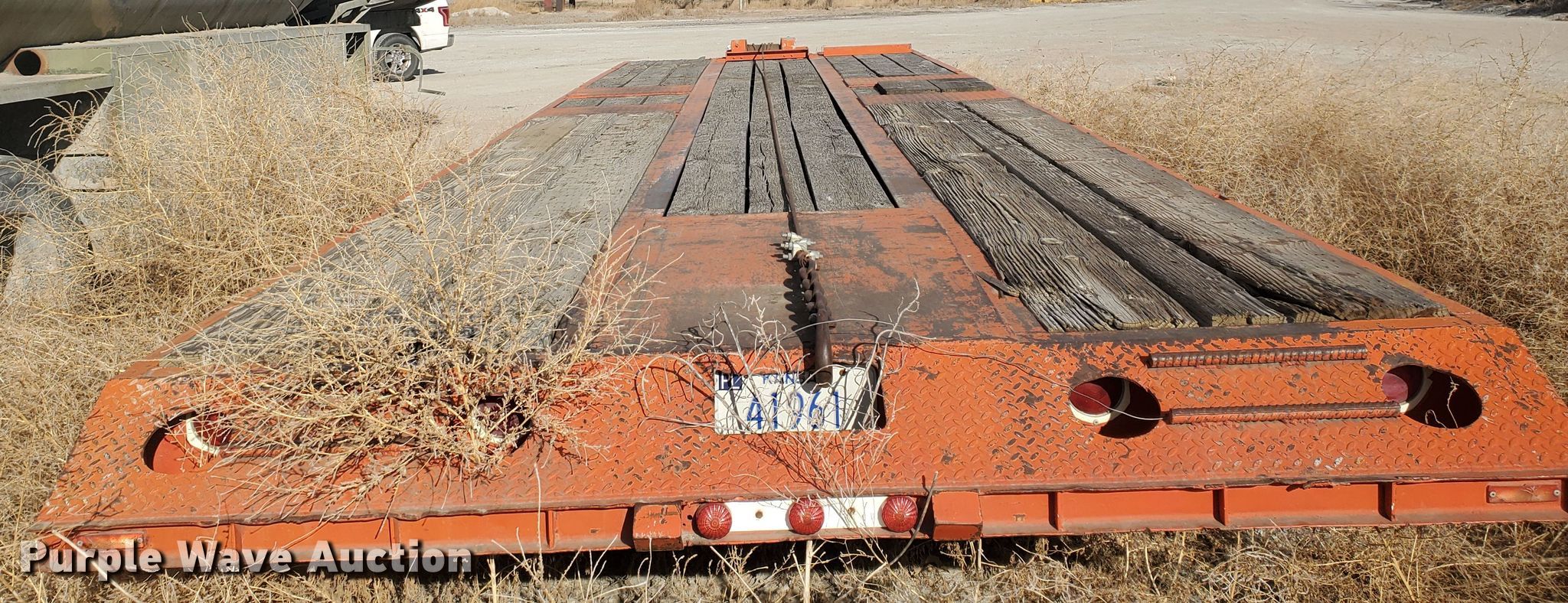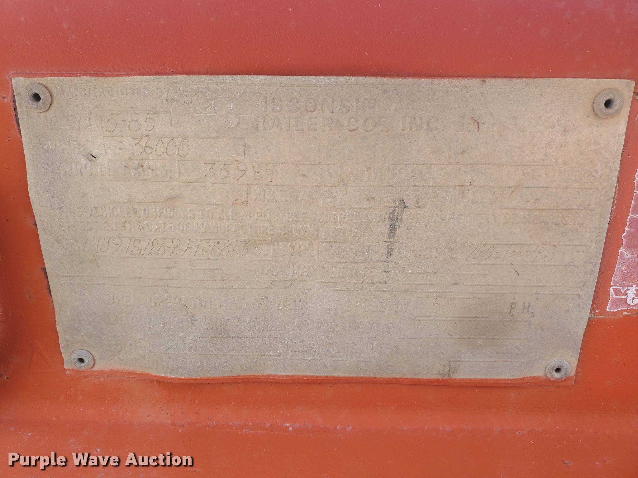 Purple Wave is selling a used Equip. Trailer in Kansas. This item is a 1985 Wisconsin tilt deck equipment trailer with the following: 37.5'L overall, 30'L x 102"W deck, 3' deck height, Wood deck, Ramsey winch, Manual hydraulic controls, Single leg landing gear, Spring suspension, Air brakes, Tandem axle, Steel wheels, 10R17.5 tires, GVWR 36,000 lbs