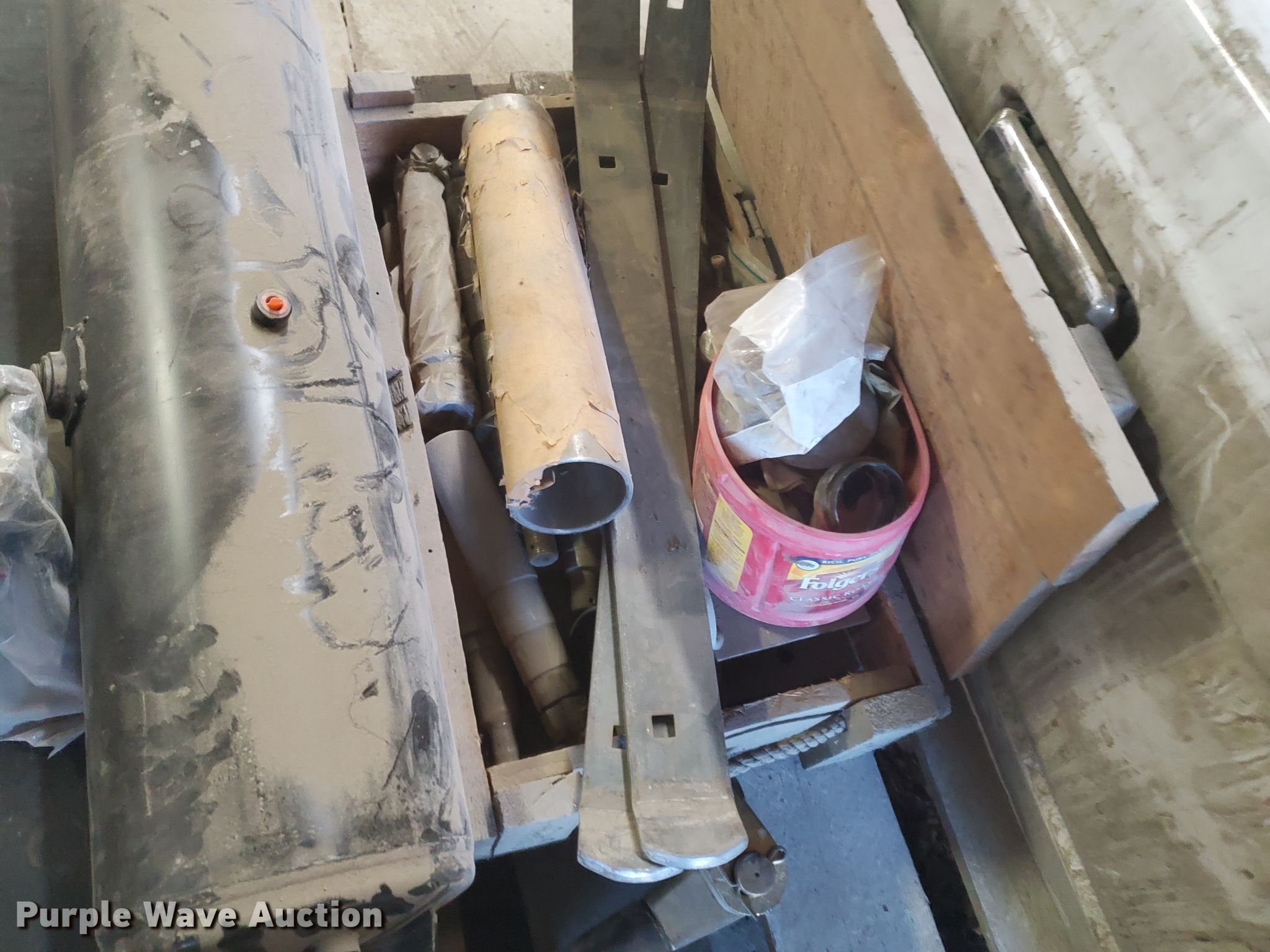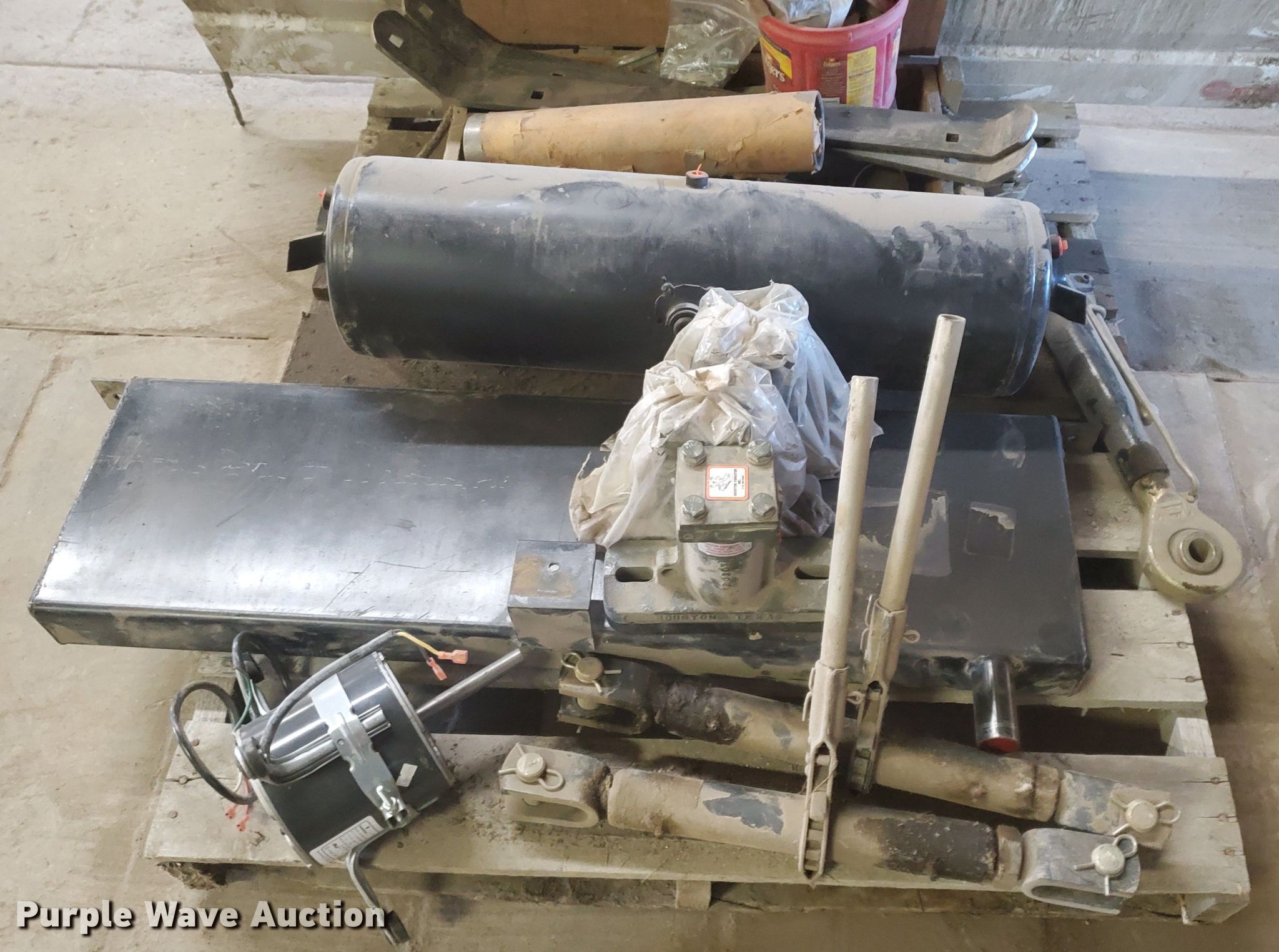 Purple Wave is selling a used Tools in Kansas. This item is a Tools with the following: Electric motor, Ratcheting binders, Air tank, Hydraulic reservoir, Ford pickup tailgate, Axle spindles