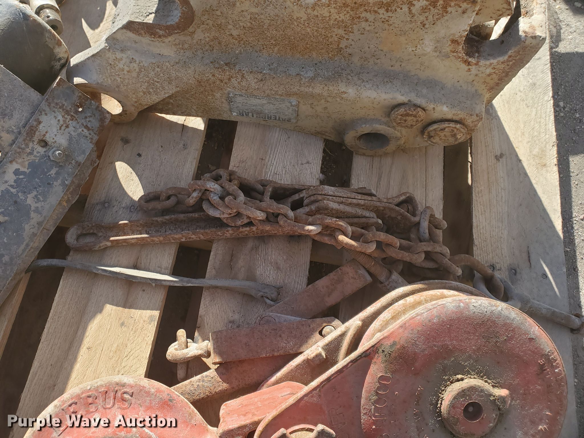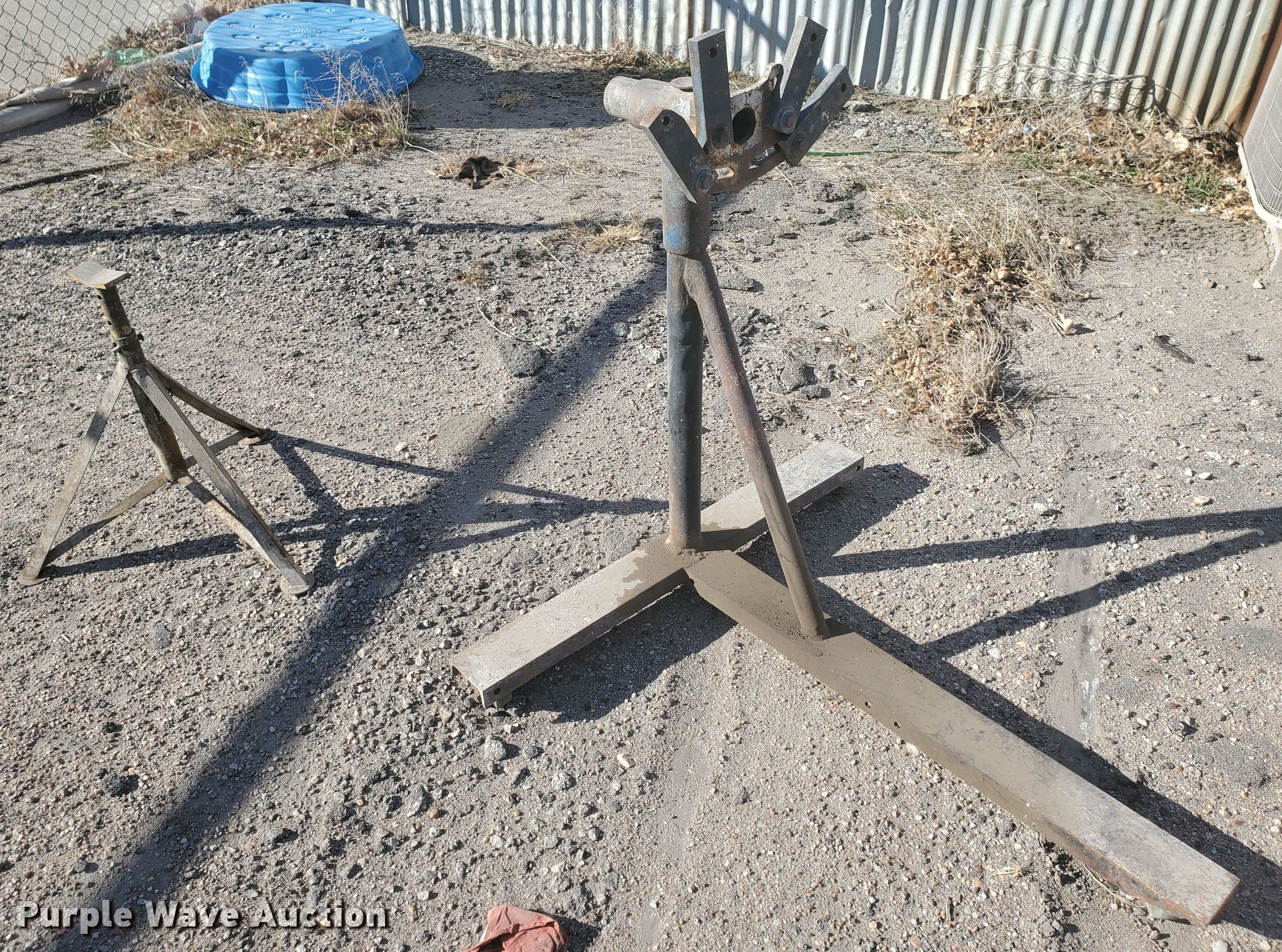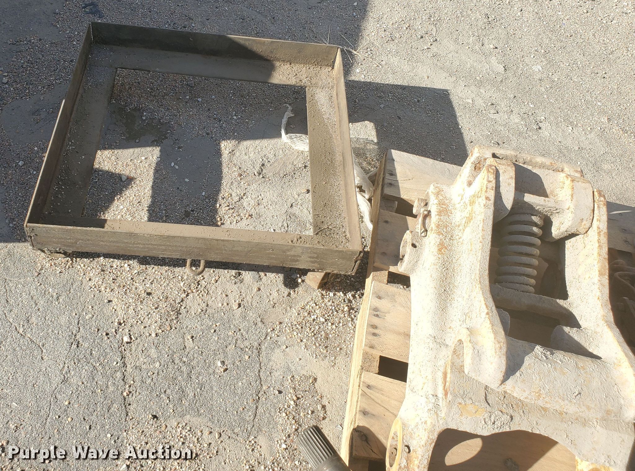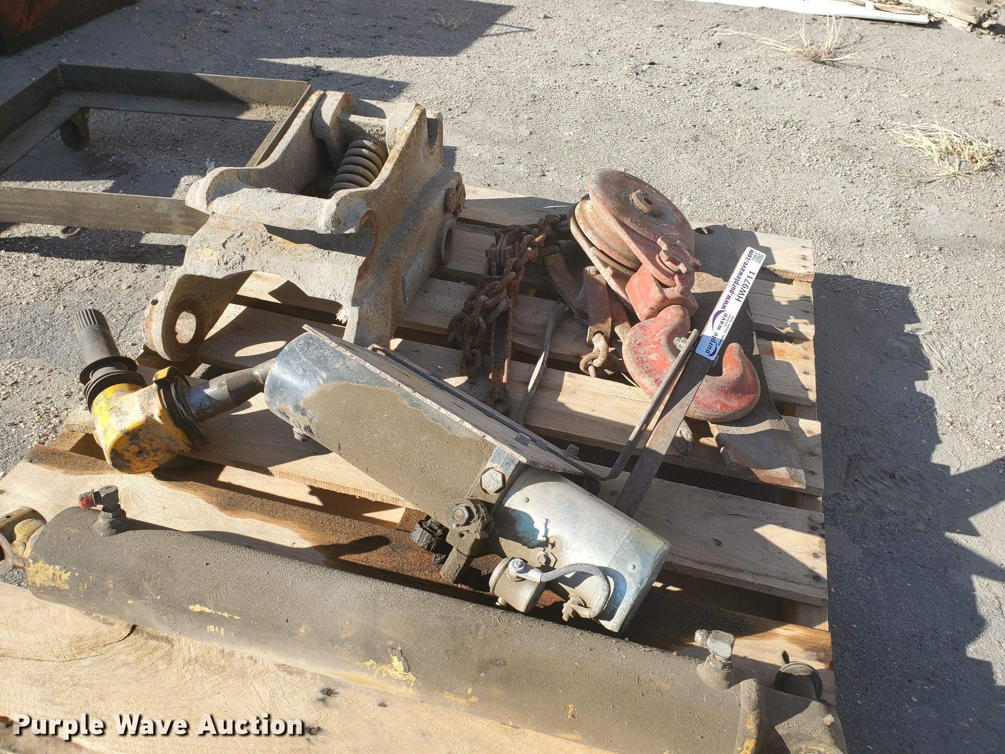 Purple Wave is selling a used Tools in Kansas. This item is a Tools with the following: Caterpillar quick coupler, Hydraulic pump, Hydraulic cylinder, Hook, Post driver, Engine stand, Jack stand