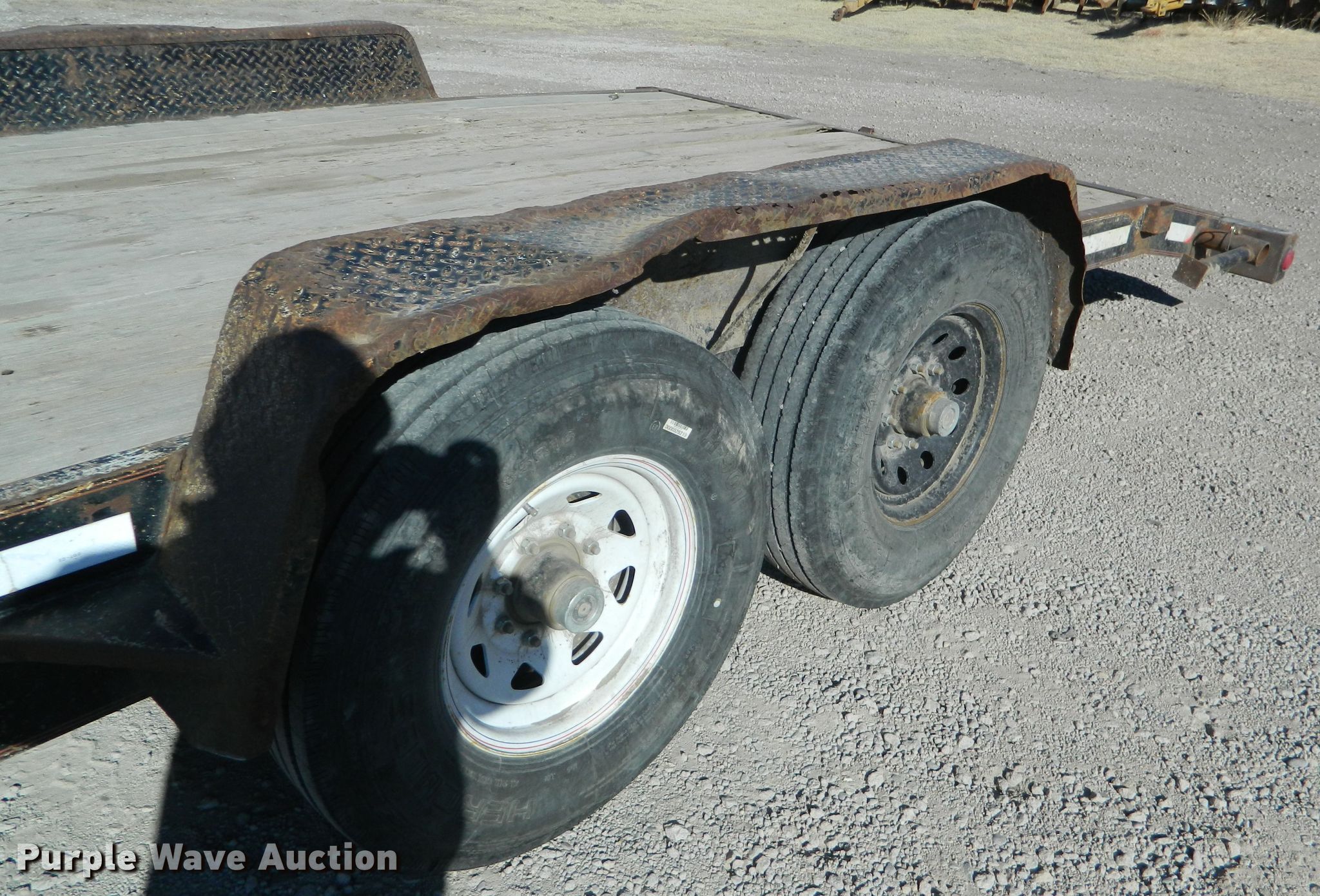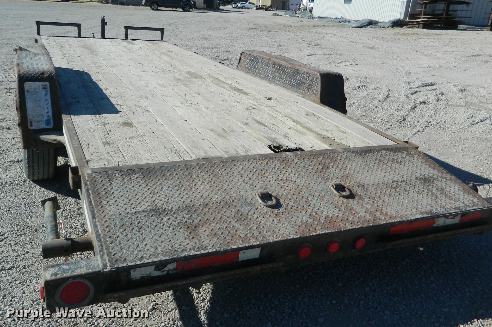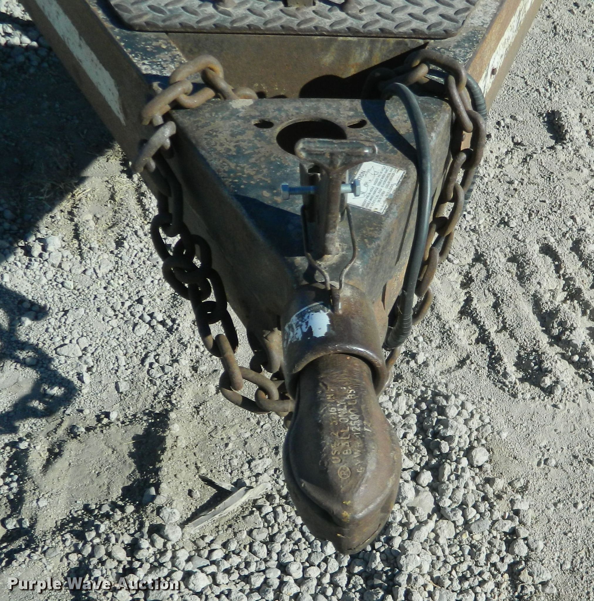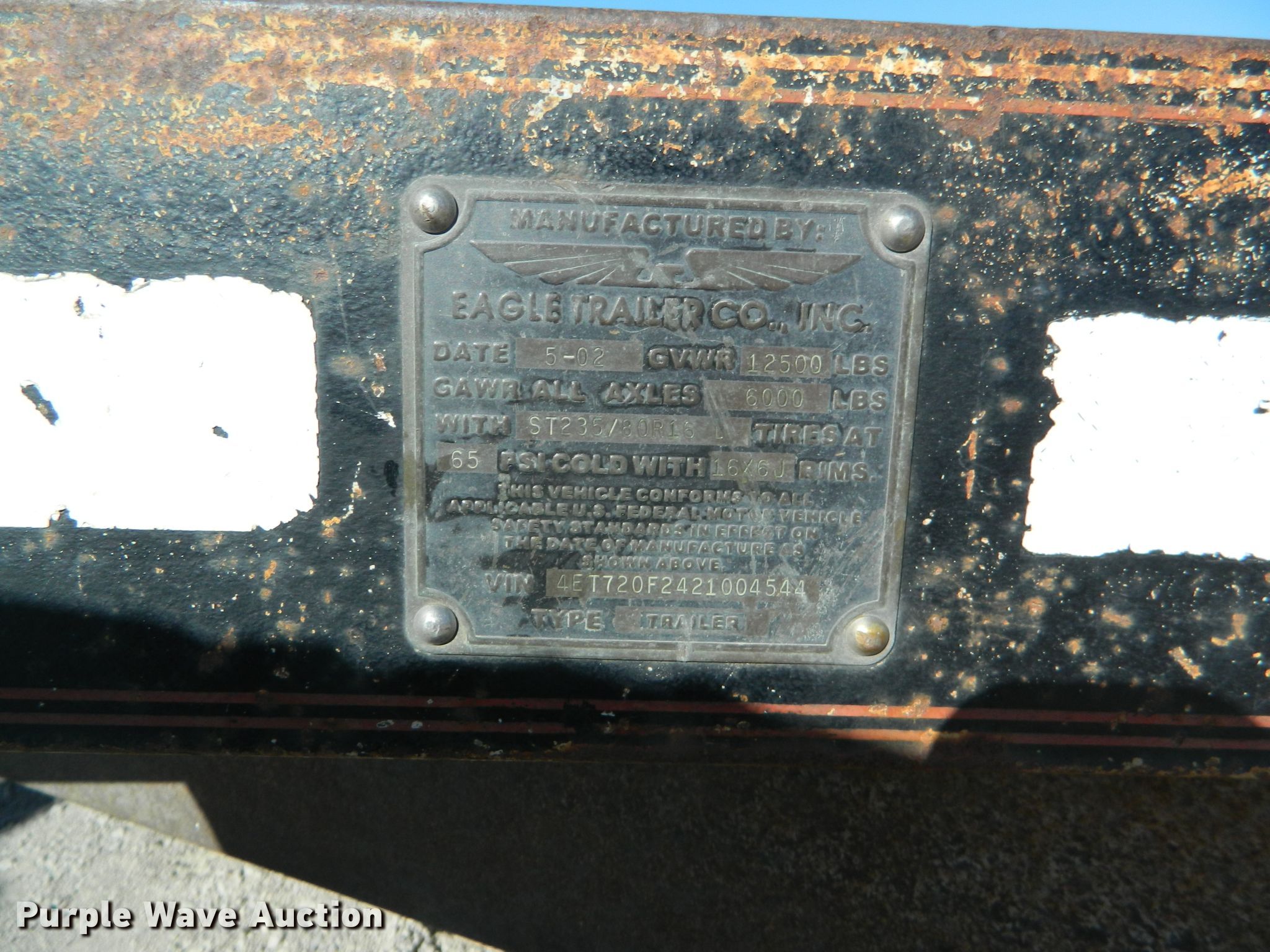 Purple Wave is selling a used Car or Utility Trailer in Kansas. This item is a 2002 Eagle utility trailer with the following: 22'6"L x 103"W overall, 18'L x 82"W deck, 5'L ramps, Wood deck, 2 5/16" ball hitch, Spring suspension, Electric brakes, Tandem axle, Steel wheels, 235/85R16 tires, GVWR 12,500 lbs, GAWR 6,000 lbs, Chains and boomers not included