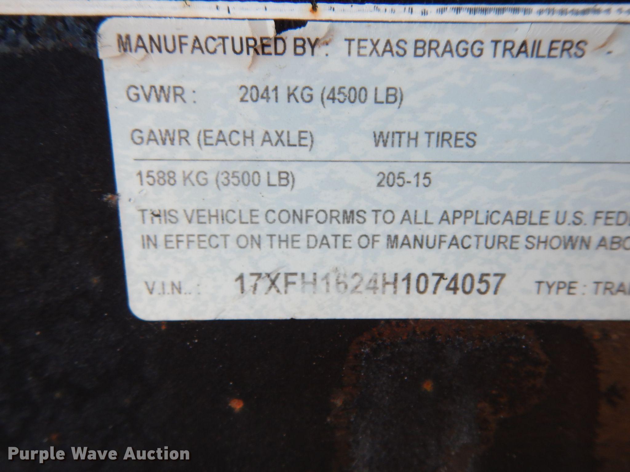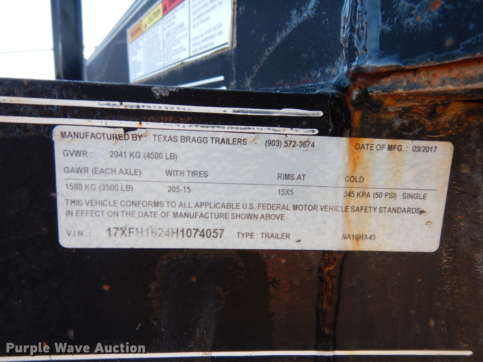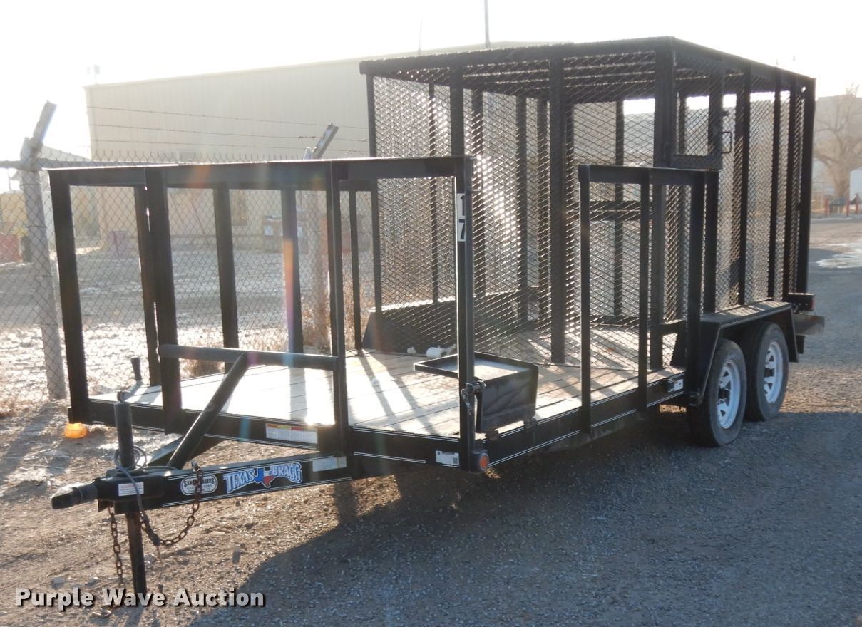Purple Wave is selling a used Car or Utility Trailer in Texas. This item is a 2017 Texas Bragg utility trailer with the following: 20'L x 8'W overall, 5'8" side height, Single leg landing gear, Tandem axle, ST205/75D15 tires, GVWR 4,500 lbs, GAWR 3,500 lbs