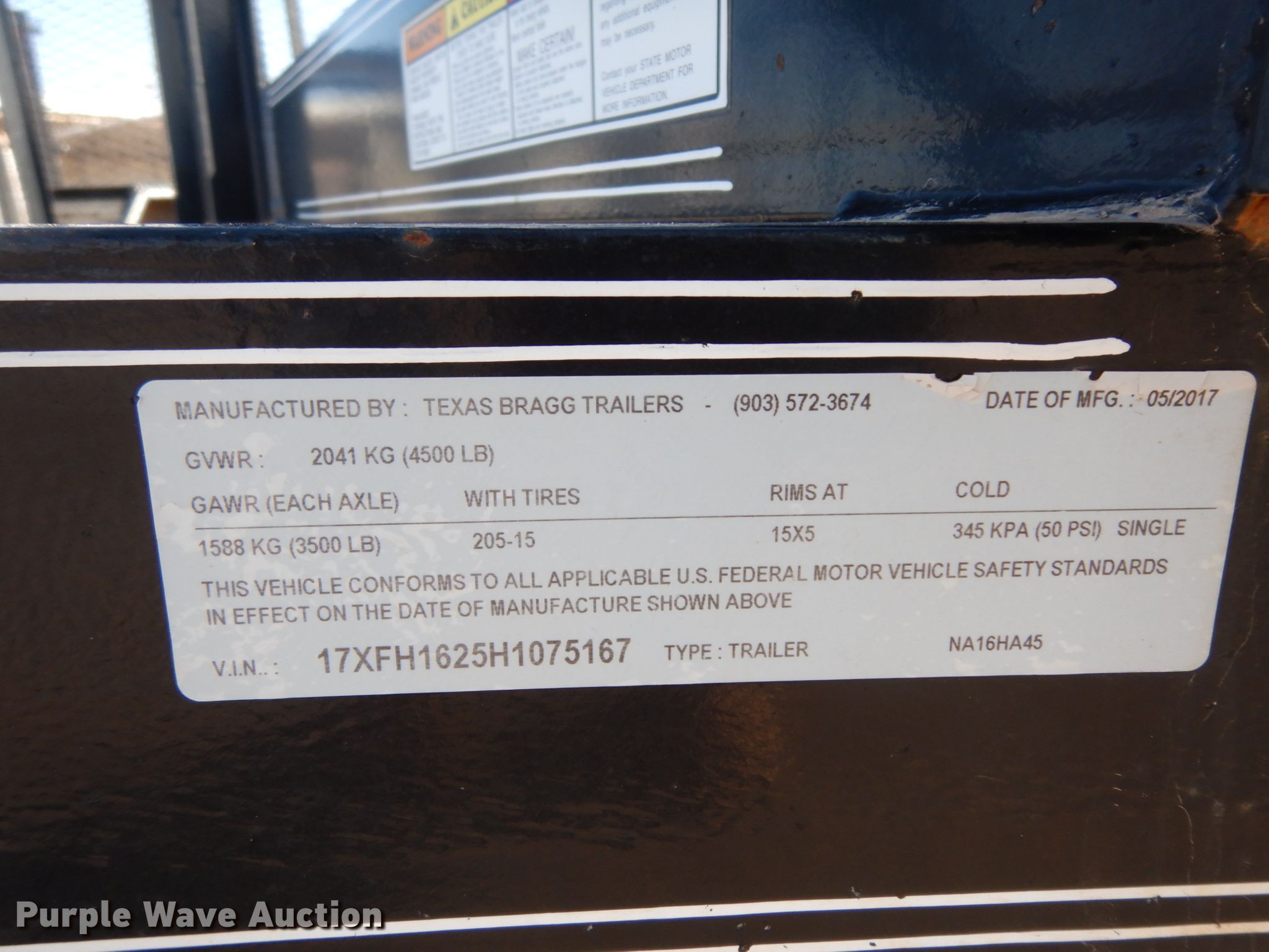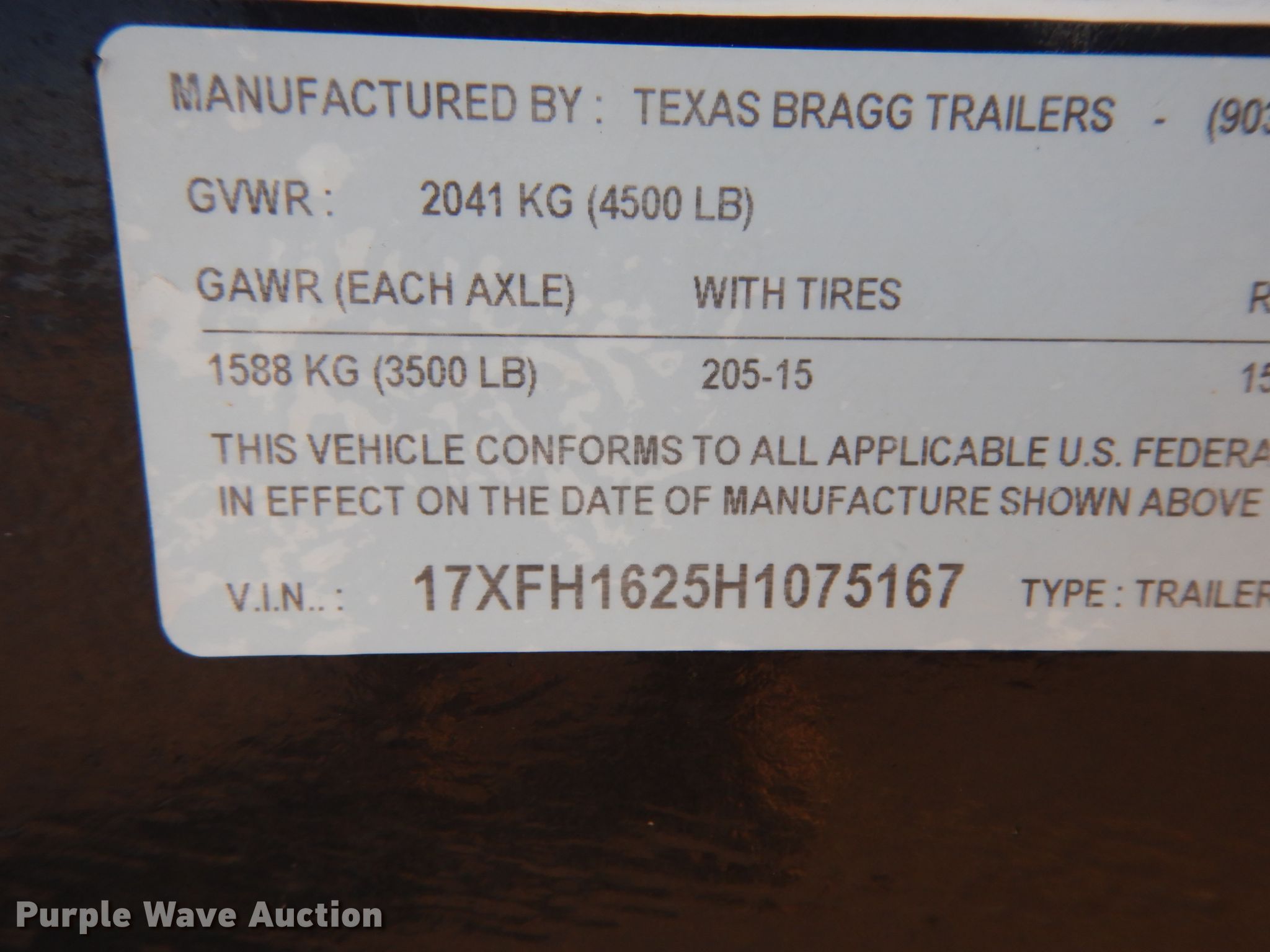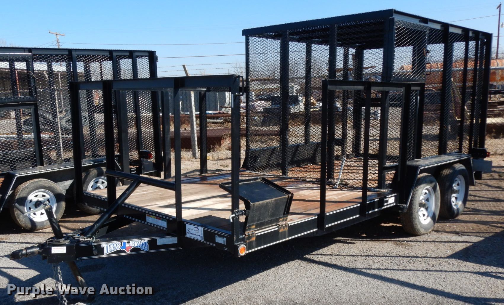 Purple Wave is selling a used Car or Utility Trailer in Texas. This item is a 2017 Texas Bragg utility trailer with the following: 20'L x 8'W overall, 5'8" side height, Single leg landing gear, Spring suspension, Tandem axle, 205/75R15 tires, GVWR 4,500 lbs, GAWR 3,500 lbs