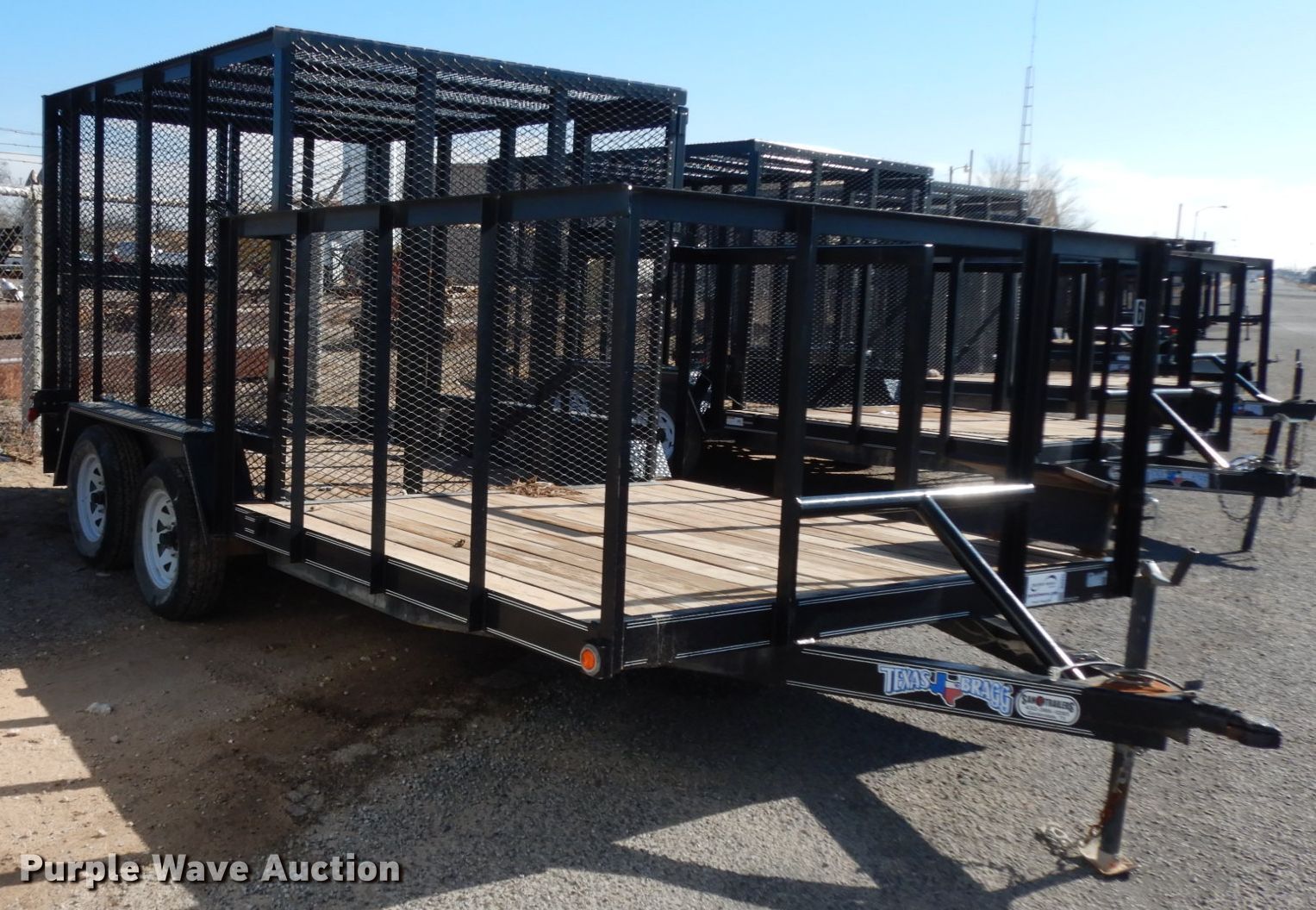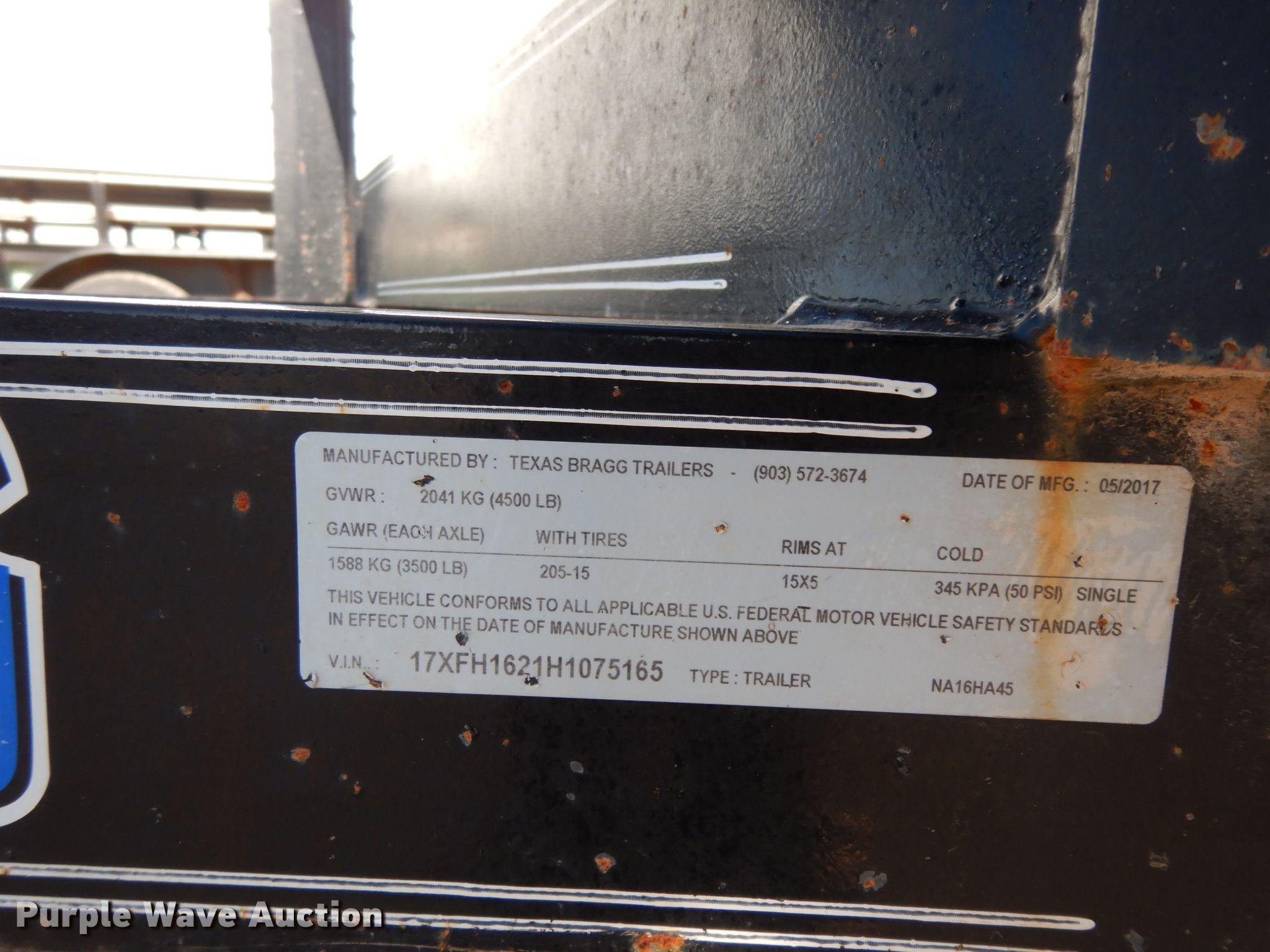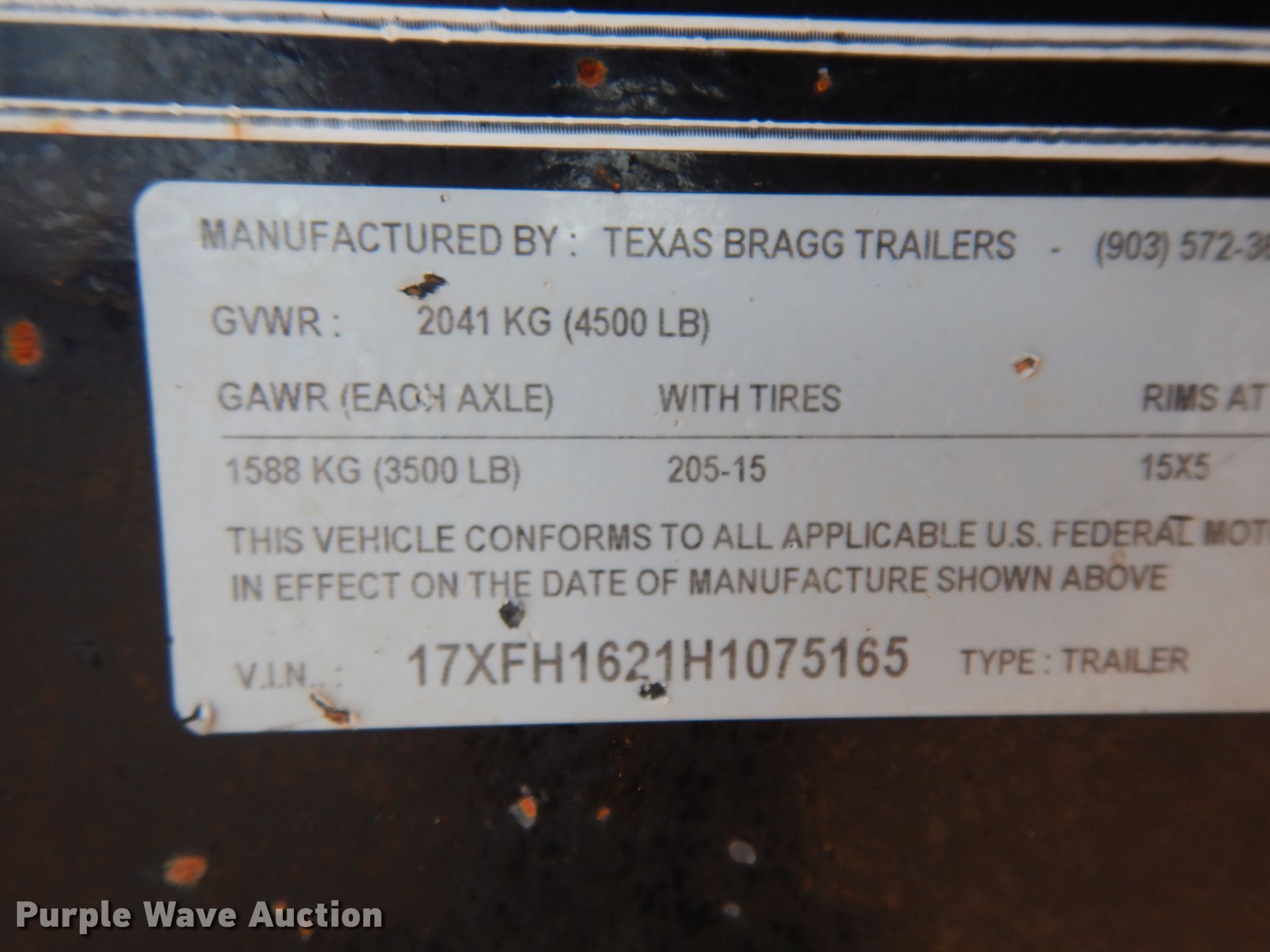 Purple Wave is selling a used Car or Utility Trailer in Texas. This item is a 2017 Texas Bragg utility trailer with the following: 20'L x 8'W overall, 5'8" side height, Single leg landing gear, Spring suspension, Tandem axle, 205/75R15 tires, GVWR 4,500 lbs, GAWR 3,500 lbs