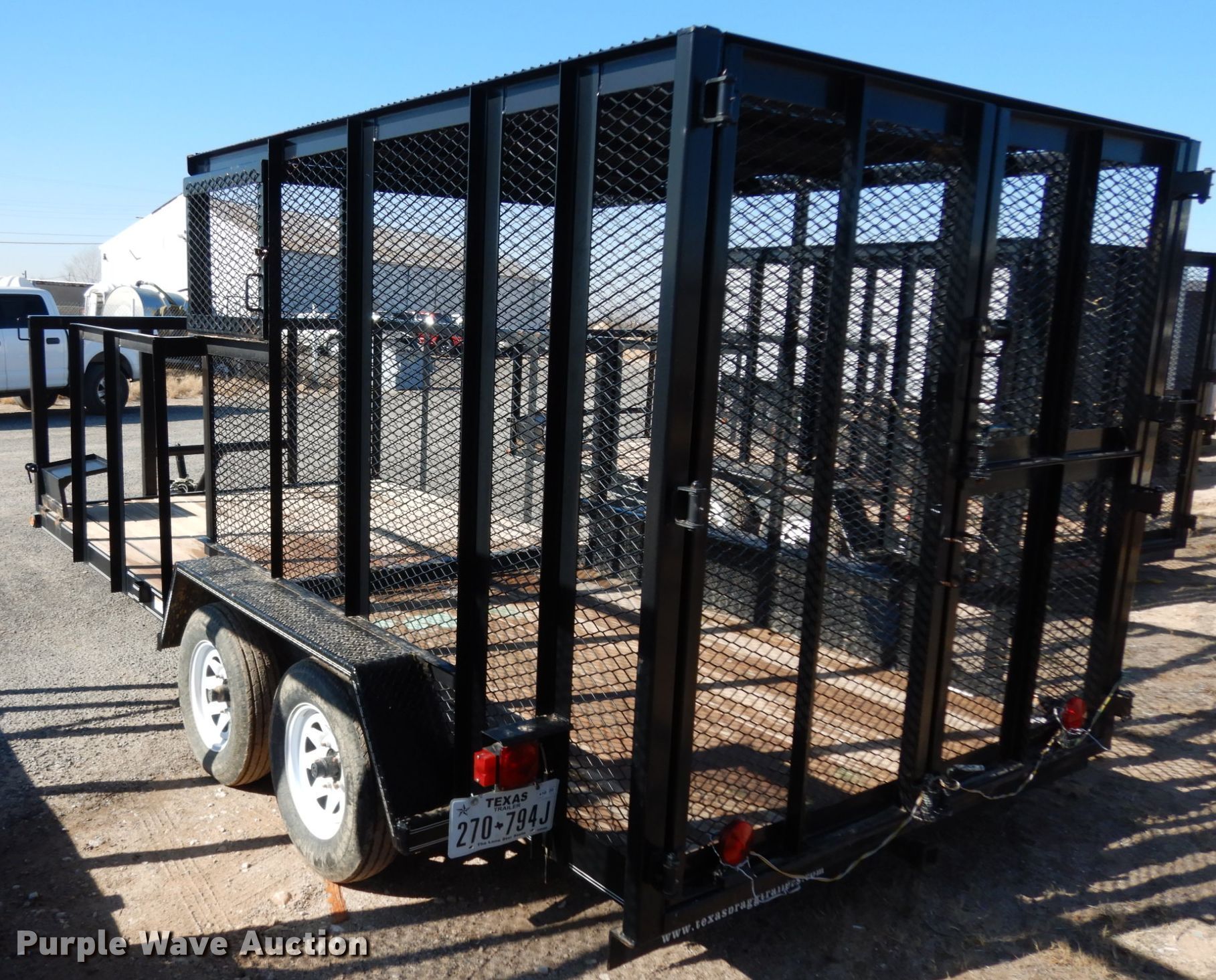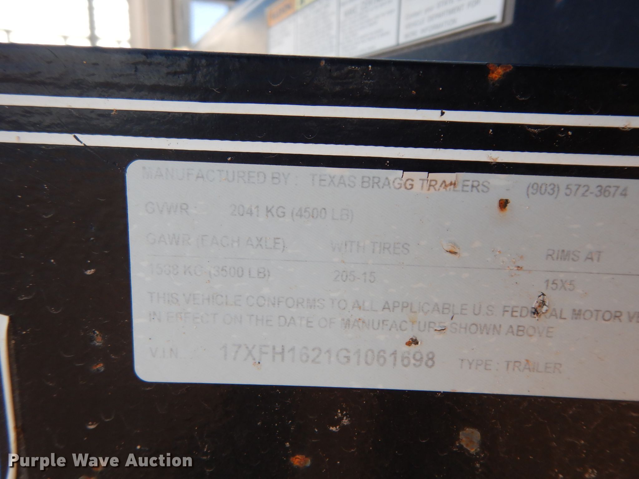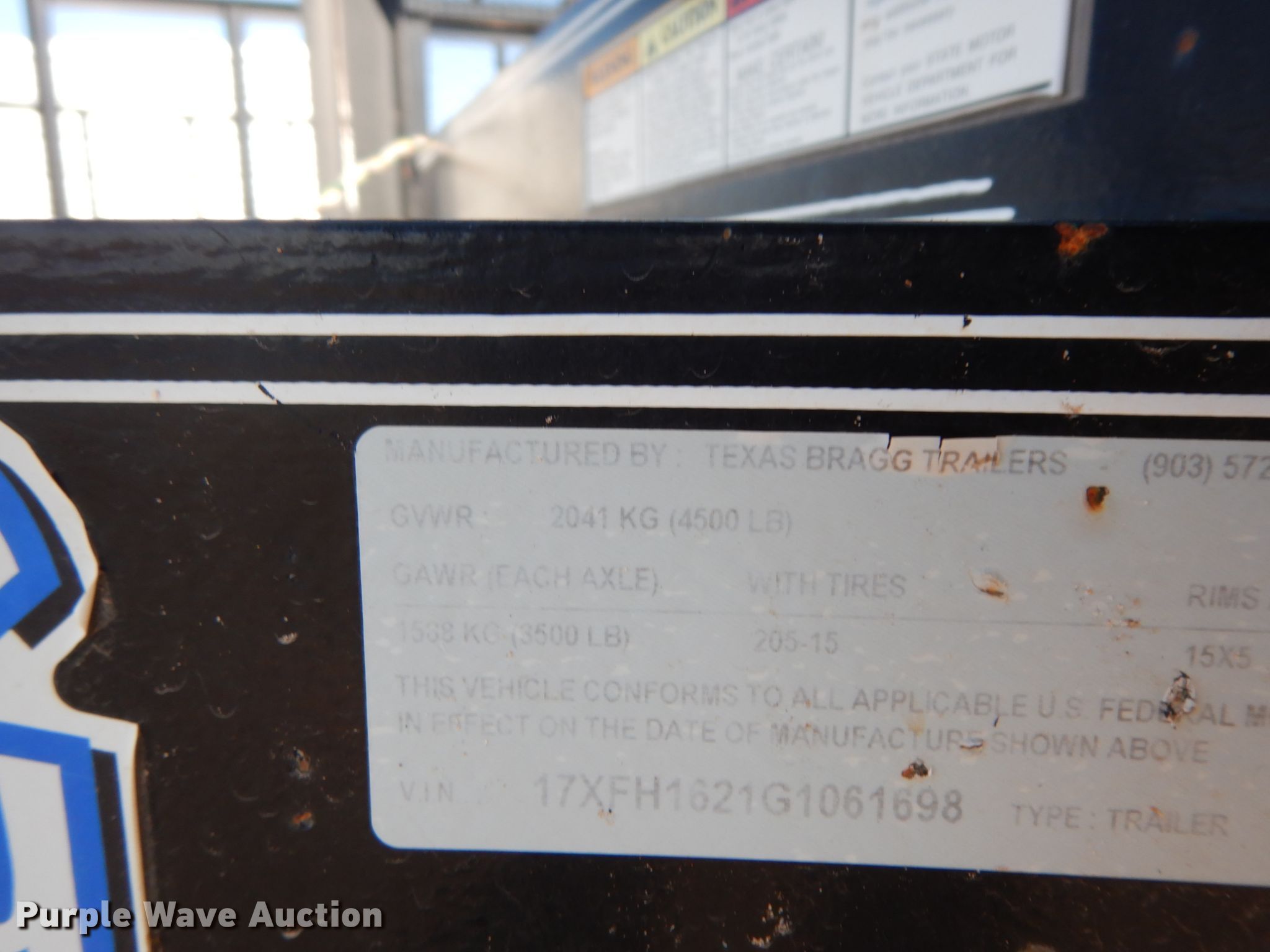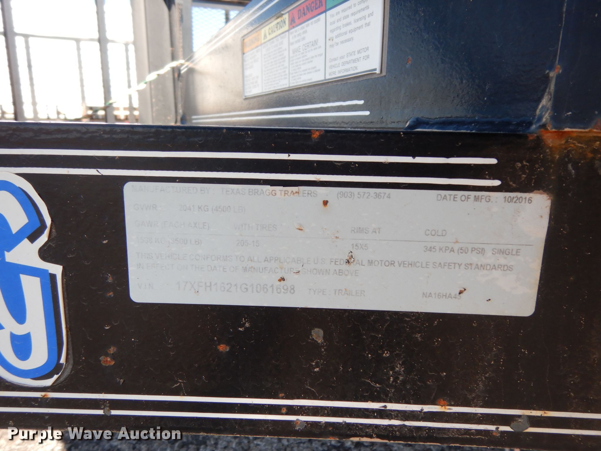 Purple Wave is selling a used Car or Utility Trailer in Texas. This item is a 2016 Texas Bragg utility trailer with the following: 20'L x 8'W overall, 5'8" side height, Single leg landing gear, Spring suspension, Tandem axle, 205/75R15 tires, GVWR 4,500 lbs, GAWR 3,500 lbs