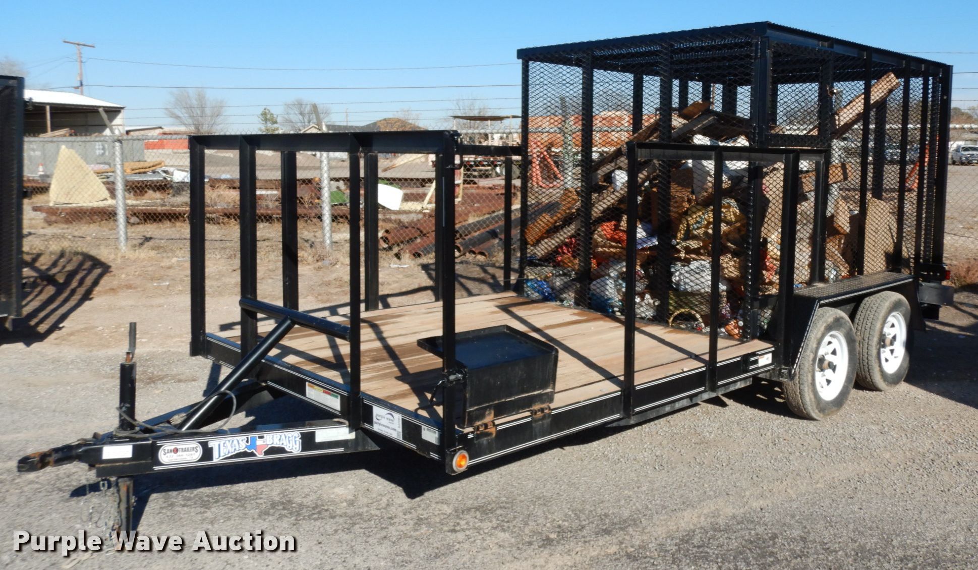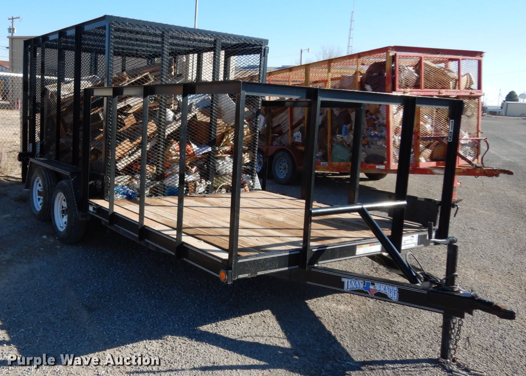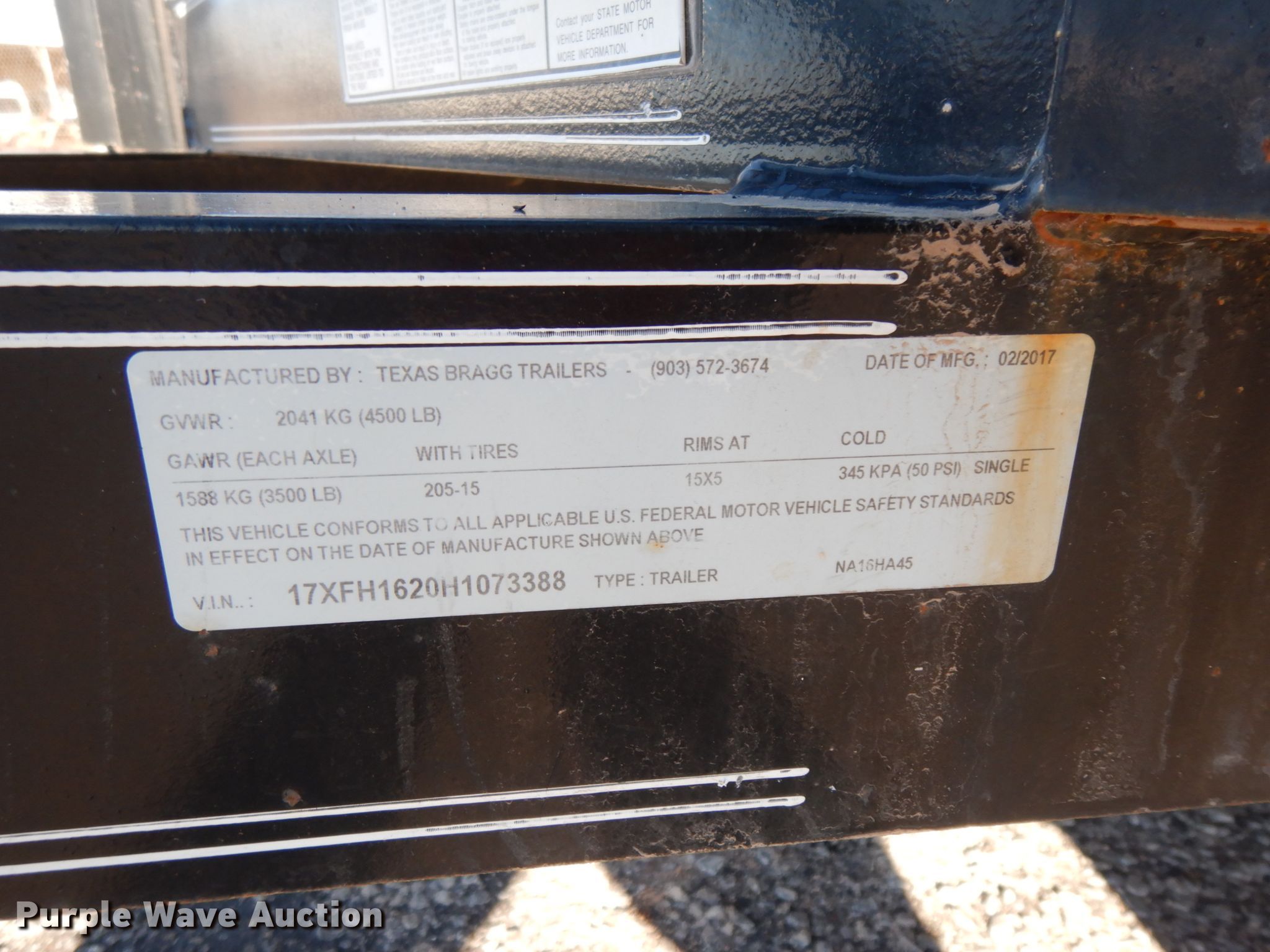 Purple Wave is selling a used Car or Utility Trailer in Texas. This item is a 2017 Texas Bragg utility trailer with the following: 20'L x 8'W overall, 5'8" side height, 2" ball hitch, Single leg landing gear, Spring suspension, Tandem axle, 205/75D15 tires, GVWR 4,500 lbs, GAWR 3,500 lbs
