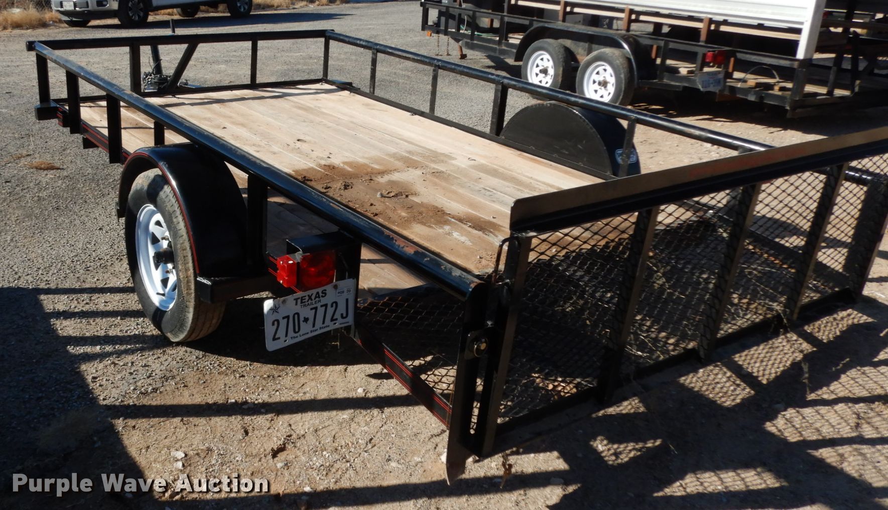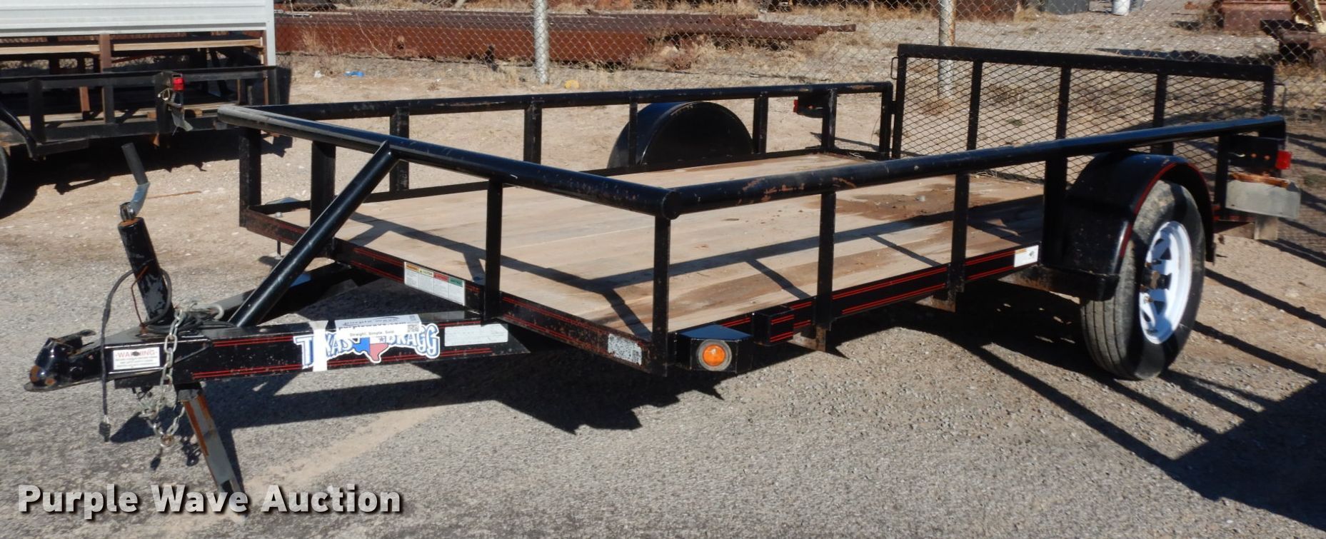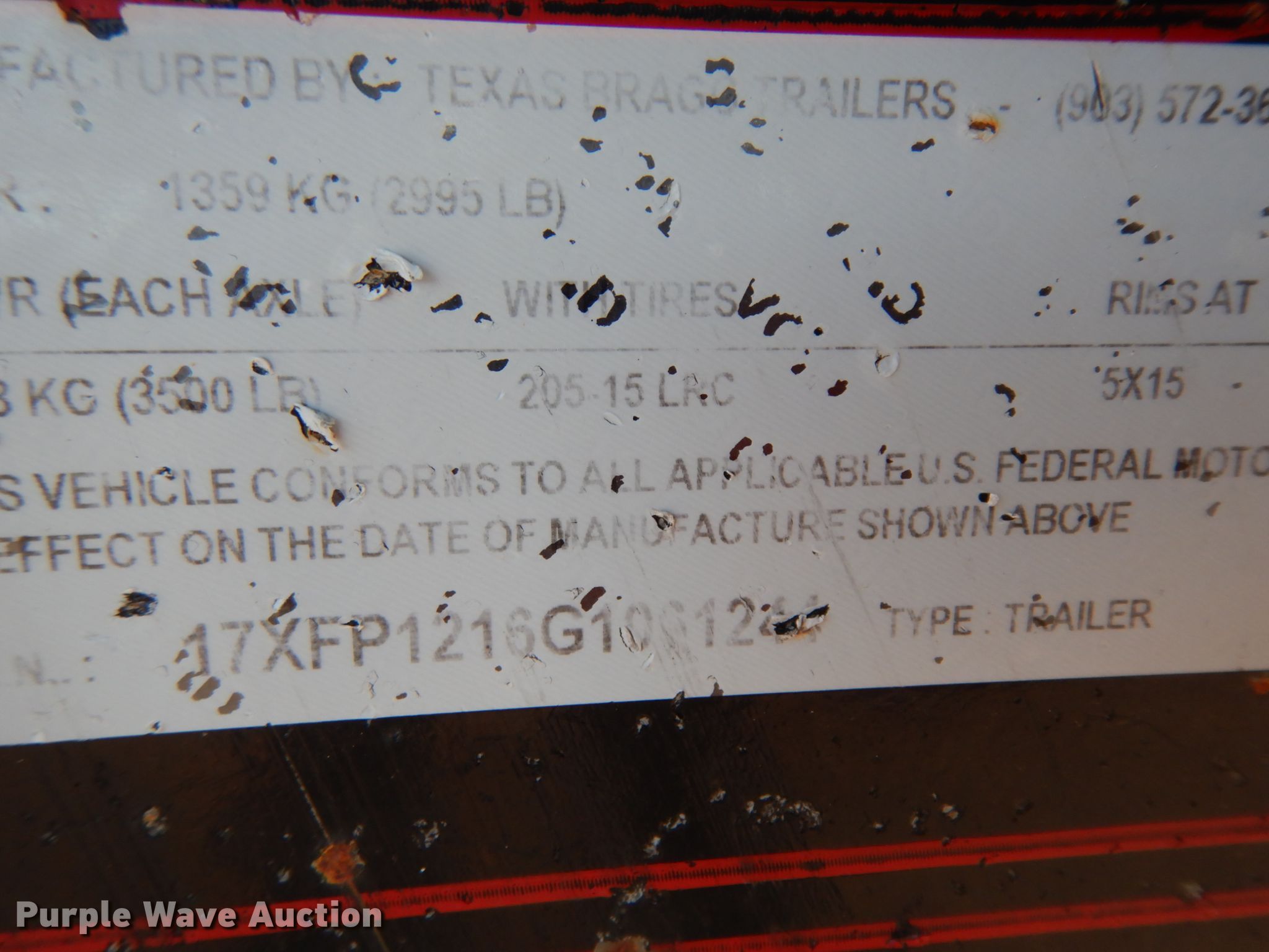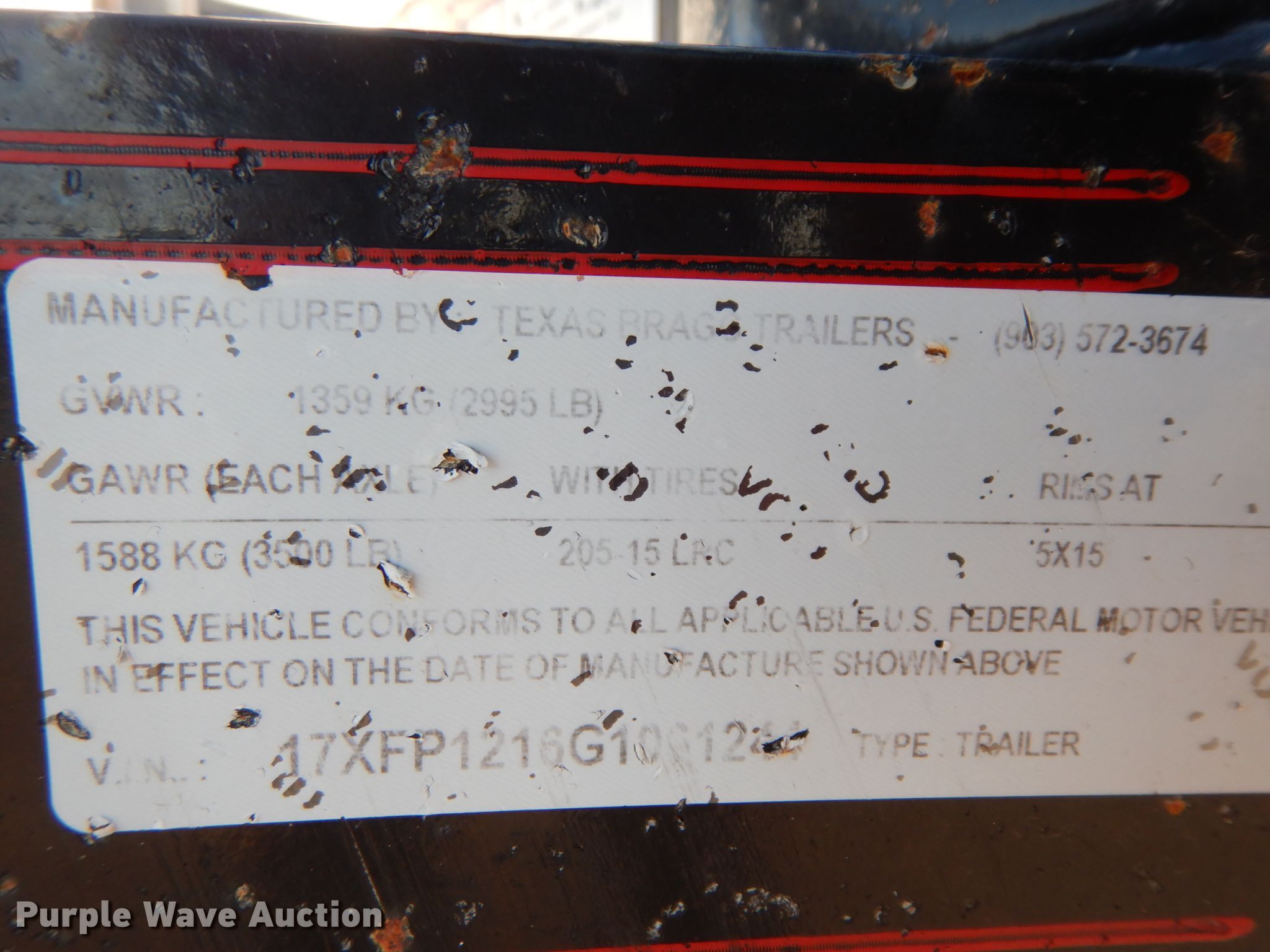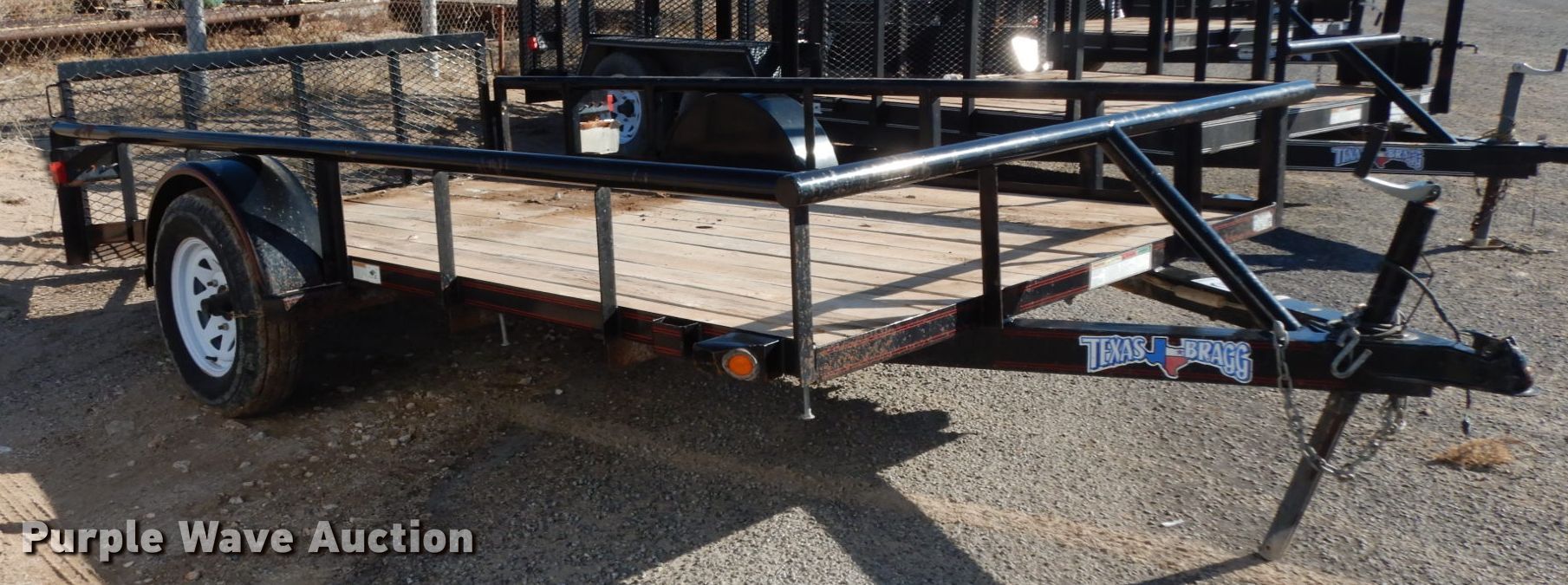Purple Wave is selling a used Car or Utility Trailer in Texas. This item is a 2016 Texas Bragg utility trailer with the following: 15'L x 8'W overall, 12'L x 6'5"W wood deck, 2" ball hitch, Single leg landing gear, Spring suspension, 205/75D15 tires, GVWR 2,995 lbs, GAWR 3,500 lbs