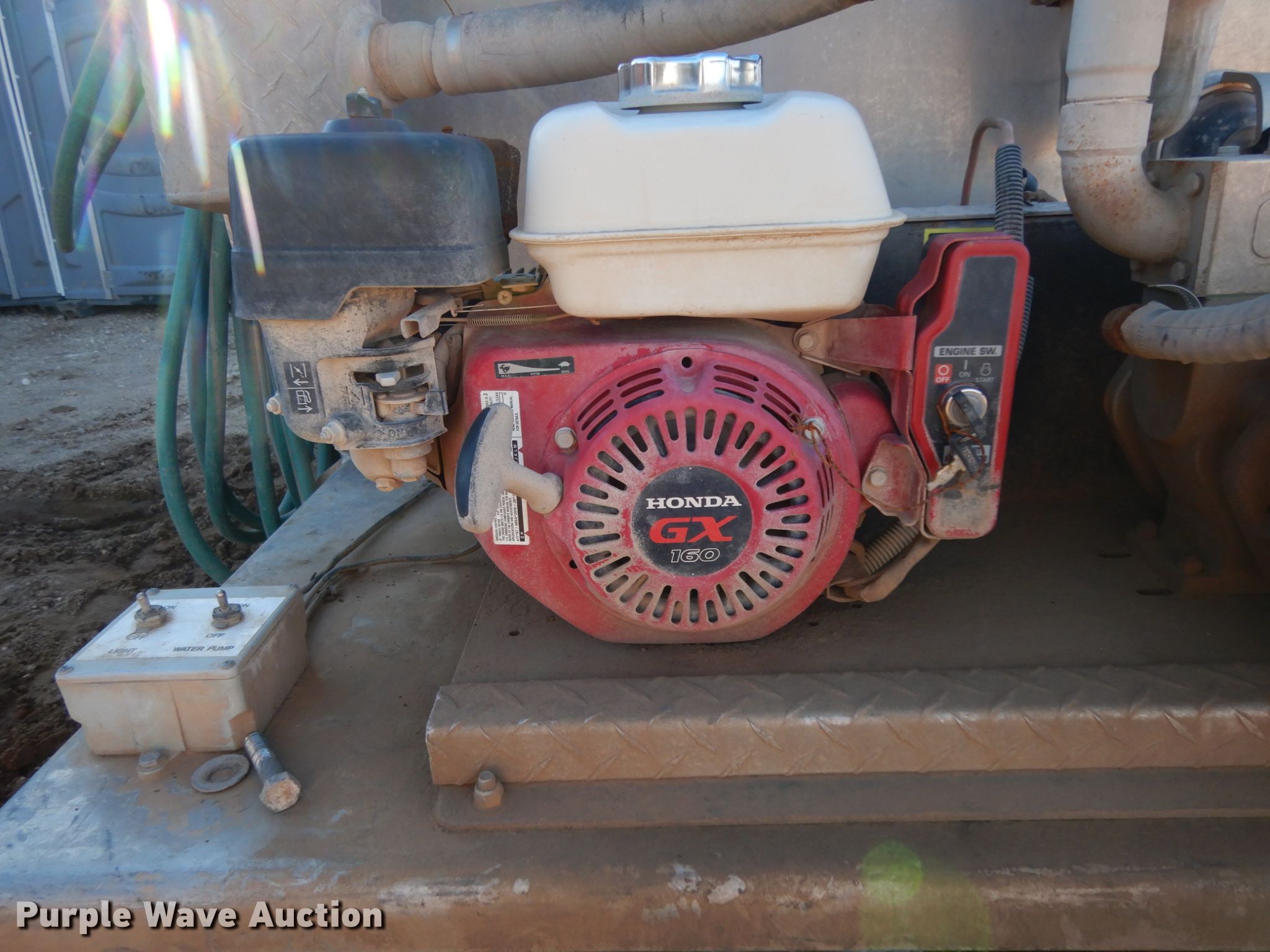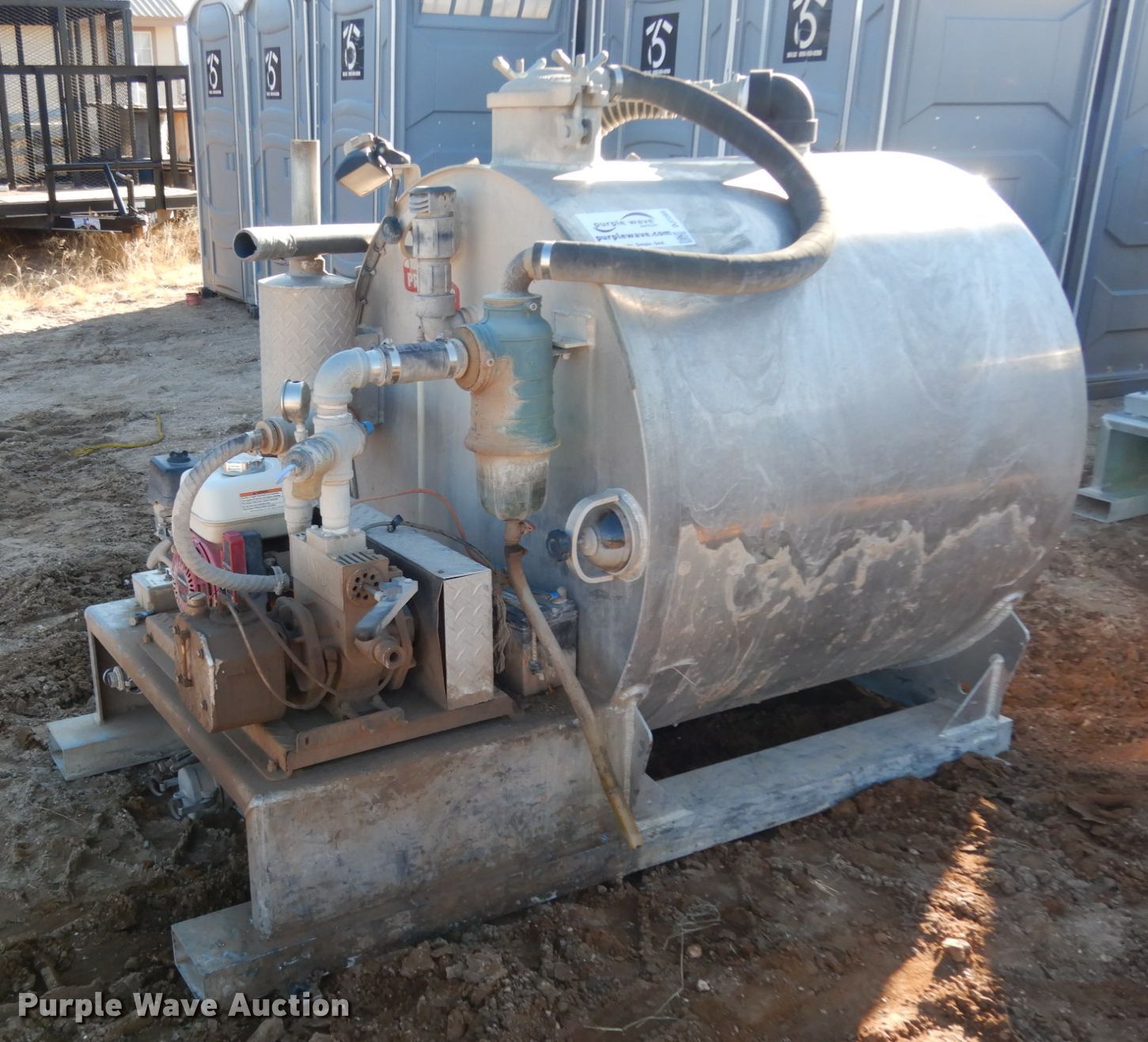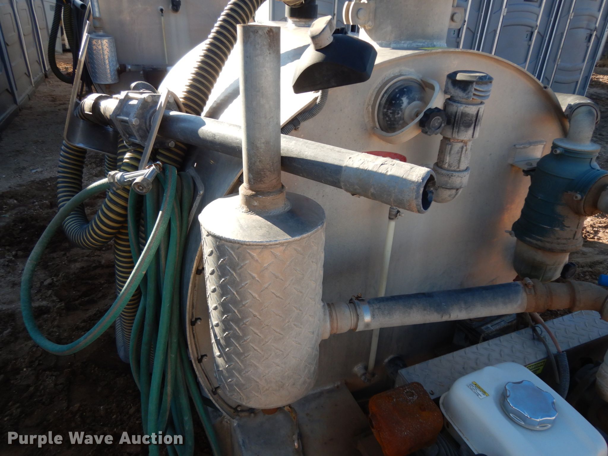 Purple Wave is selling a used Other Industrial or Business in Texas. This item is a Progress portable restroom vacuum tank with the following: Honda single cylinder gas engine, 5.5 HP, Two compartment aluminum tank, 200 gallon waste capacity, 100 gallon water capacity, 3" diameter discharge, Masport HXL2V vacuum pump, Toico wash down system, 5.5 gallon per minute capacity, 50'L garden hose, 2" diameter vacuum hose, Skid mounted, 6'1"L x 42"W overall, Fork pockets