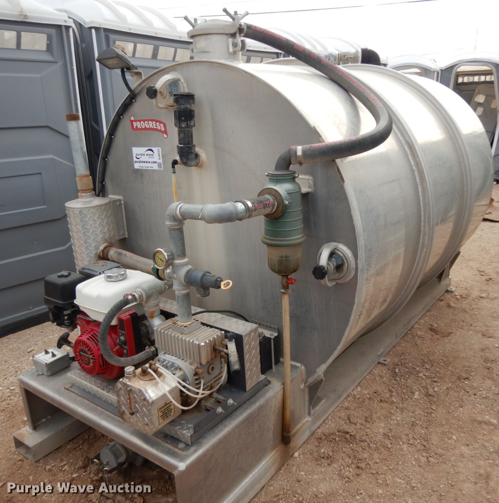 Purple Wave is selling a used Other Industrial or Business in Texas. This item is a Brenner 995 portable restroom vacuum tank with the following: Honda gas engine, 9 HP, Two compartment aluminum tank, 670 gallon waste compartment, 325 gallon fresh water compartment, Sight tube, 3" diameter discharge, Masport HXL3V vacuum pump, 112 CFM, Toico wash down system, 5.5 gallon, 50'L garden hose, Nozzle, 2" diameter vacuum hose, 113"L x 66"W x 72"H overall