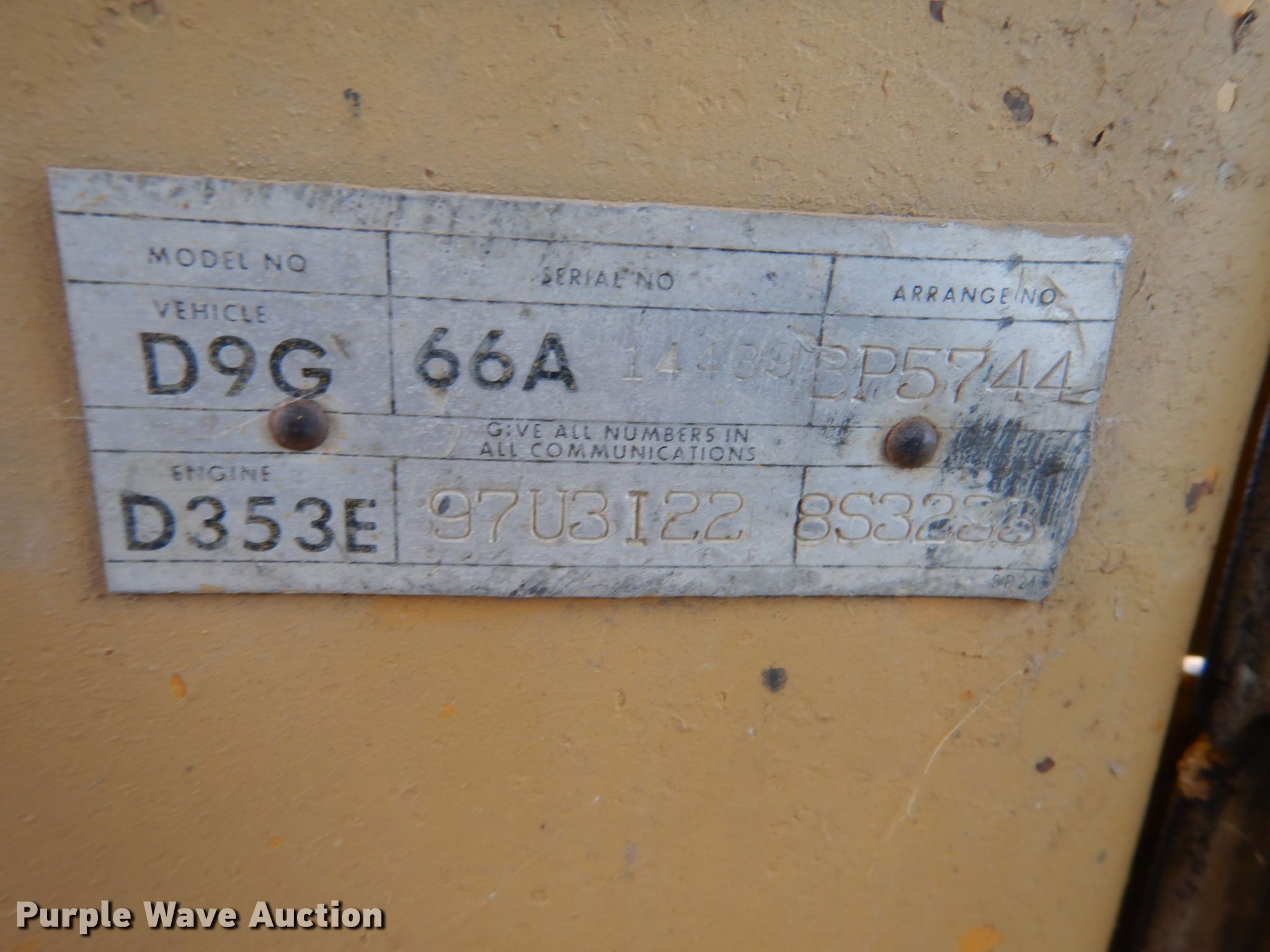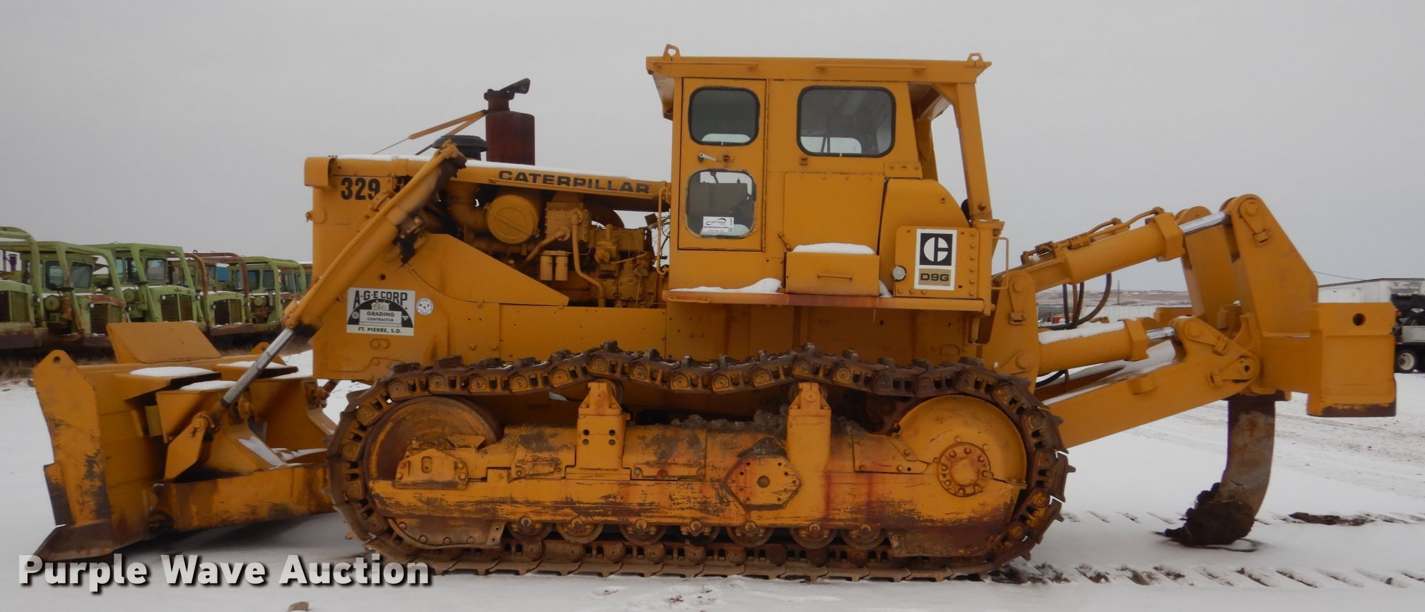 1974 Caterpillar D9G dozer. 755 hours on meter, Serial: 66A14439. Engine Caterpillar D353E, Serial: 97U3122, Cylinders: 6, Fuel type: Diesel. Transmission Powershift, 3F - 3R. Operators station Enclosed cab, Heat, Steering: Clutch brake. Operational Dozer blade: Straight, Single-tilt 10' 8" W, Ripper Shanks: 1. Tracks Width: 24", Grouser pads: Single, Bottom rollers: 7, Track guards. A-G-E Corporation. Ft. Pierre, SD 57532