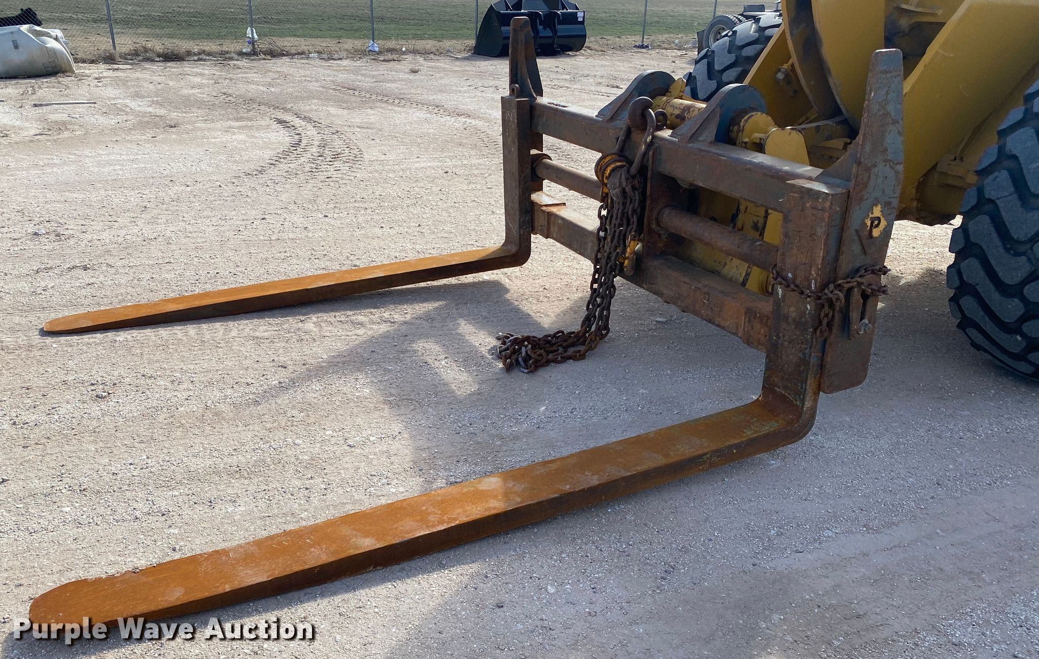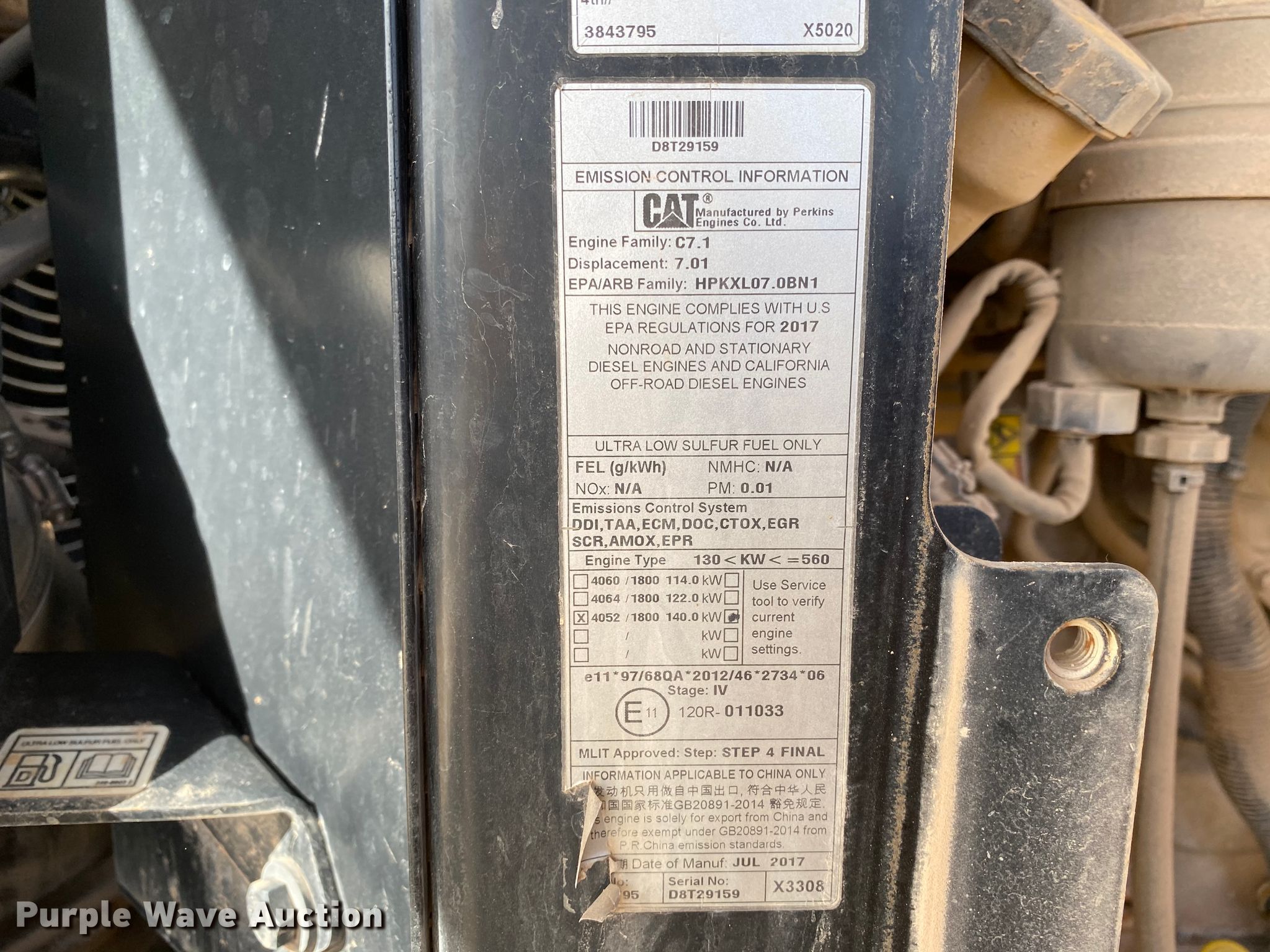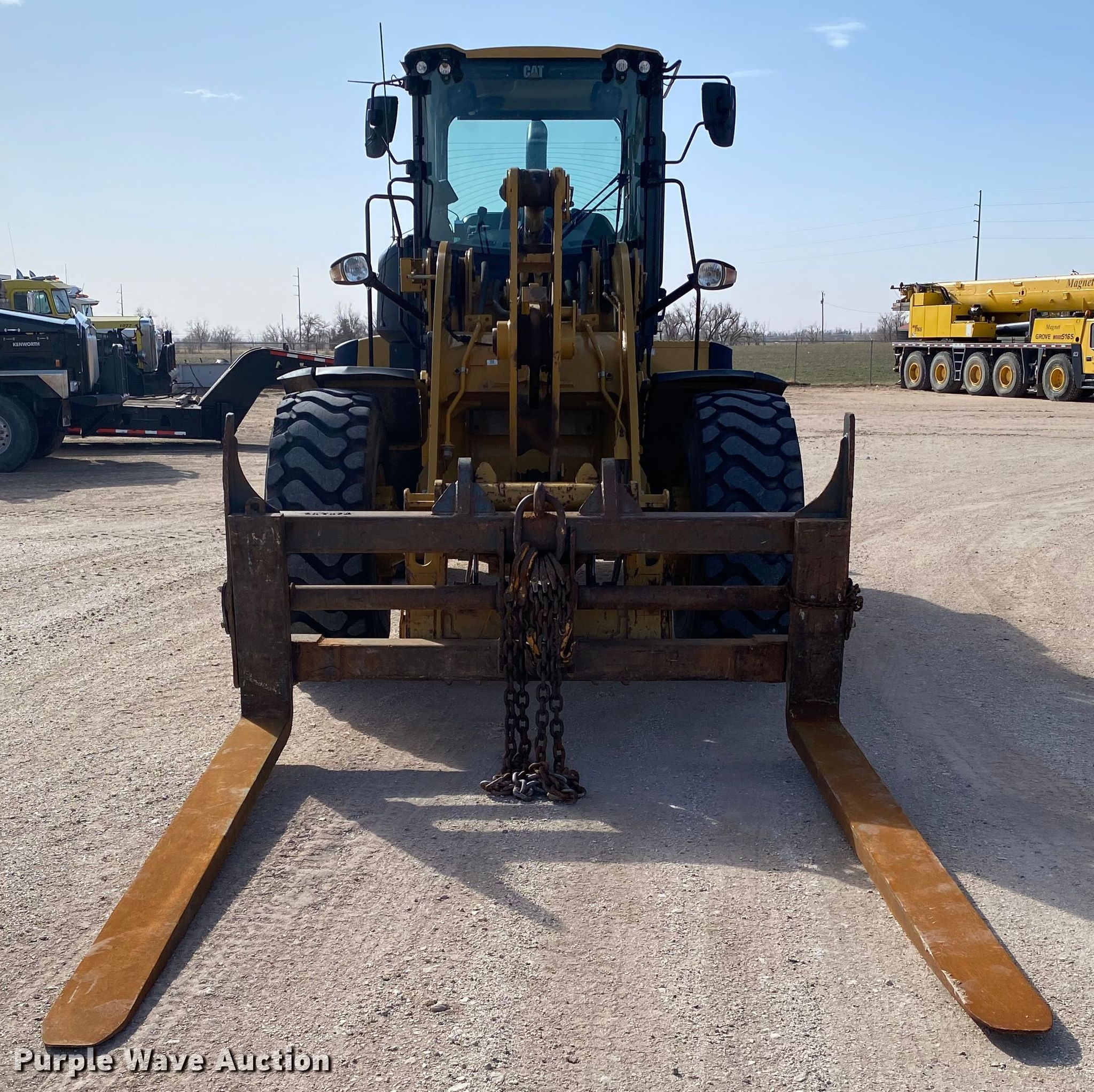 2017 Caterpillar 938M wheel loader. 2,022 hours on meter, Serial: CAT0938MEJ3R04584. Engine Caterpillar C7.1, Displacement: 7.1L, Cylinders: 6, Fuel type: Diesel. Transmission Hydrostatic, Four speed travel. Operators station Enclosed cab, AC, Heat, Bucket controls: Joystick. Operational Quick coupler: Hydraulic, Counter weights, Forks Pemberton 1559, Length: 8'. Tires Size: 20.5R25. Notes Lifting chain not included, Windshield chipped or cracked. Magnet Trucking LLC. 22815 US-70. WOODWARD, OK 73801