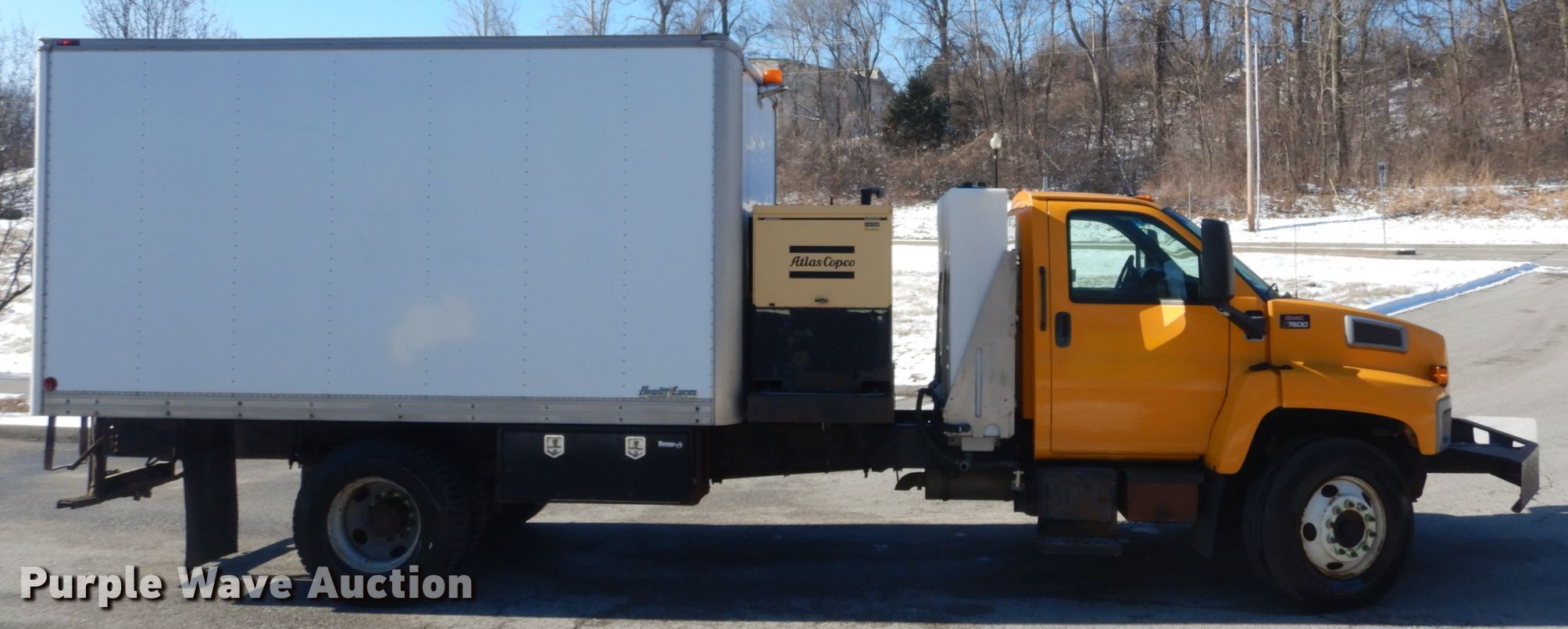 2003 GMC C7500 box truck. 118,394 miles on odometer. Engine Caterpillar 3126, Displacement: 7.2L, Cylinders: 6, Fuel type: Diesel. Transmission Allison , Automatic. Chassis Axles: Single, Suspension: Spring, Brakes: Air, GVWR: 33,000 lbs, Wheelbase: 221". Interior Heat, Brake controller. Operational Box bed Length: 14.5', Width: 8", Height: 90", Floor: Wood, Air compressor Atlas Copco XAS96U, Engine hours: 1,207, John Deere four cylinder diesel engine, CFM: 185, Water tank 2" diameter discharge. Tires Size: 11R22.5. Notes Non-operational fuel gage. Missouri title. Seller is a Missouri licensed motor vehicle dealer. Title will be assigned and distributed by the dealer. Please contact the seller for distribution questions. 1GDM7E1C43F517446. Thoele Inc.. St. Charles, MO 63301
