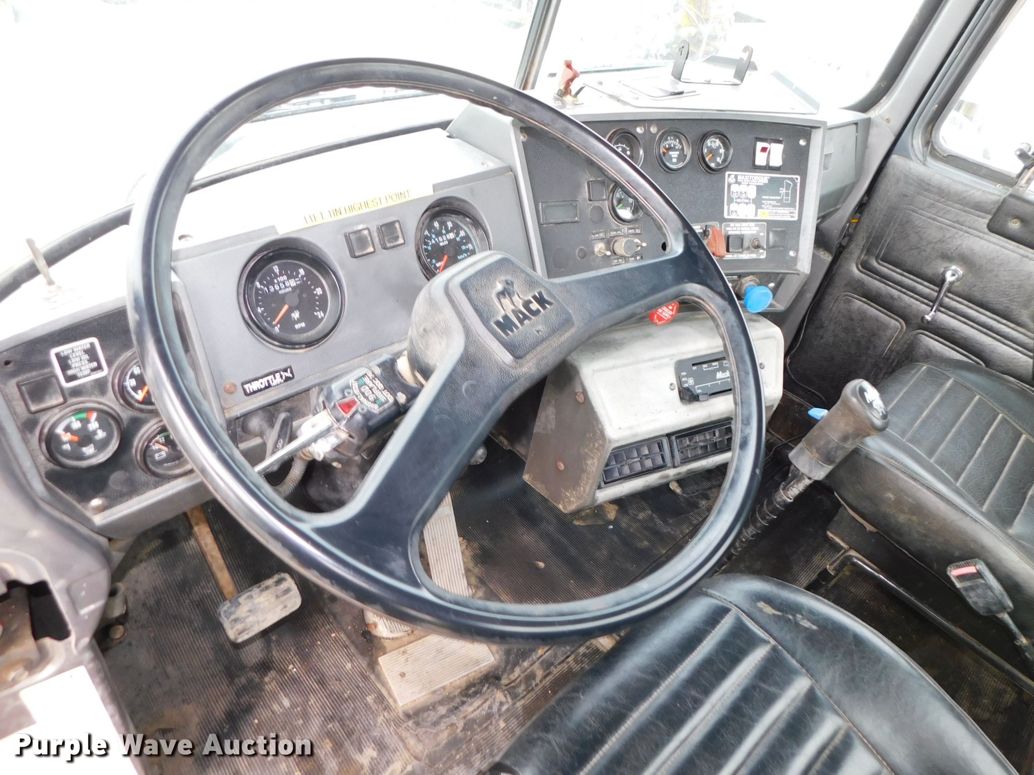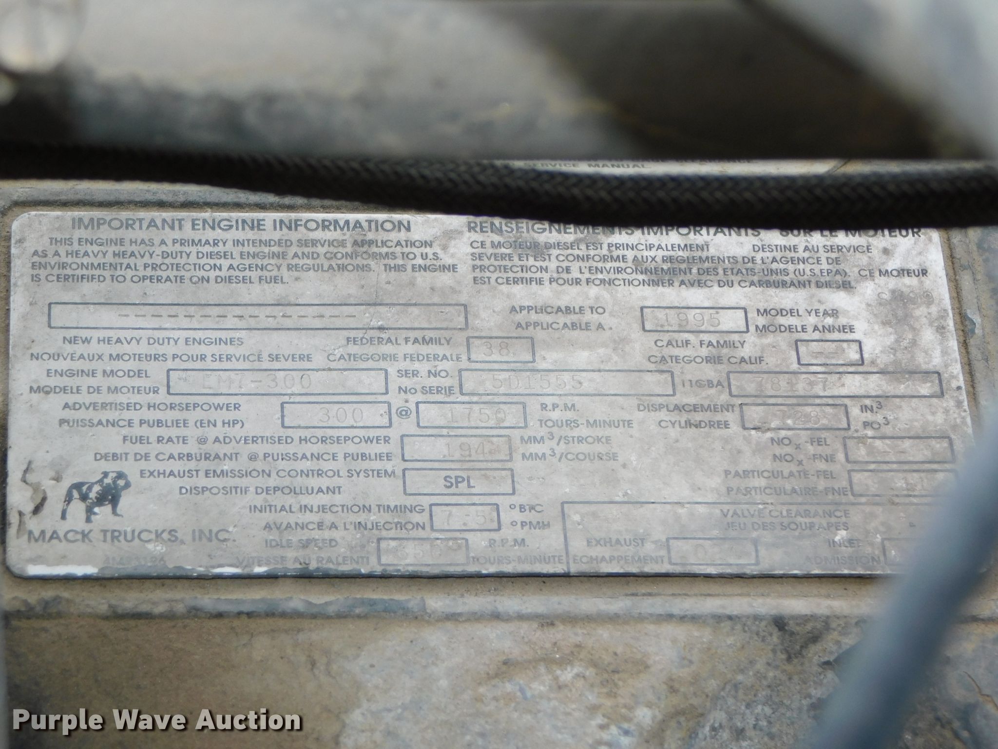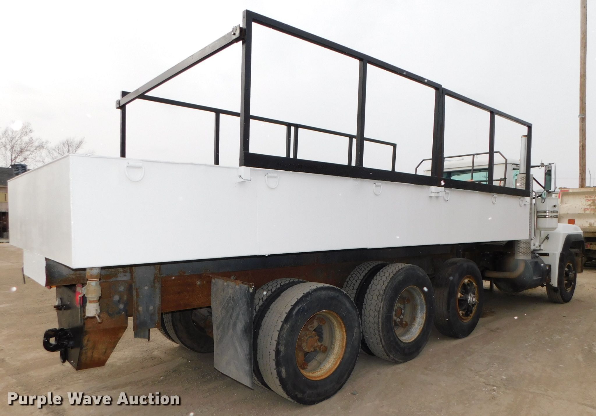 1995 Mack RD690S water truck. 41,629 miles on odometer, Engine hours: 13,659. Engine Mack EM7, Serial: 5D1555, Displacement: 12.0L, Cylinders: 6, Fuel type: Diesel, HP: 300. Transmission Mack Maxitorque T2070, Manual, Speed: 7. Chassis Axles: Triple Steerable pusher axle, Suspension: Camelback, Brakes: Air, PTO, Wheelbase: 227". Interior AC, Heat. Operational Bed / tank Capacity: 2,400 gallons, 20' 3"L. Tires Size: 11R22.5, Pusher axle: 275/80R22.5. Nebraska title. Title distribution may be delayed up to 14 days from verification of funds. 1M2P264C8SM018916. K2 Construction. 7701 Cornhusker Hwy. Lincoln, NE 68507