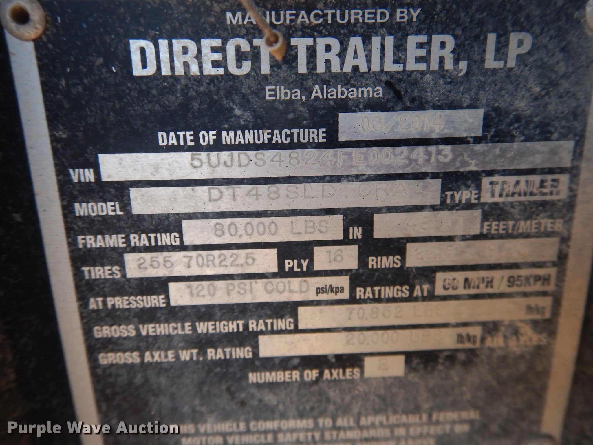 Purple Wave is selling a used Equip. Trailer in Texas. This item is a 2015 Direct Trailer DT48SLDTCRA drop deck equipment trailer with the following: 48'L x 102"W overall, 9.5'L top deck, 38'L x 97.5"W wood deck, 42" floor height, 4' tail length, 4'L ramps, Dual leg landing gear, Air suspension, Air brakes, Tandem axle, Steel wheels, 255/70R22.5 tires, GVWR 70,852 lbs, GAWR 20,000 lbs
