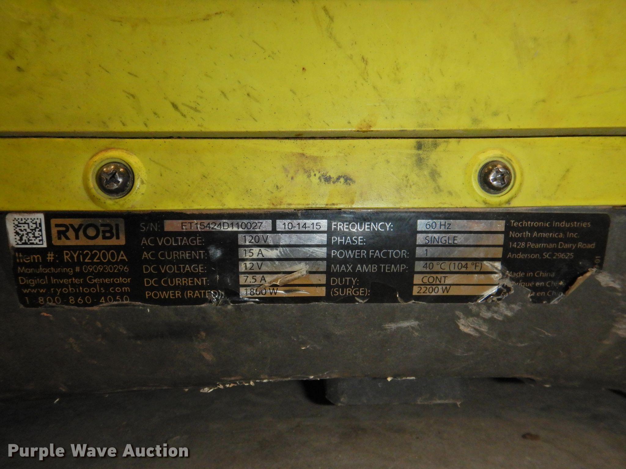 Purple Wave is selling a used Generator Set in Texas. This item is a Ryobi RYI2200A generator with the following: Serial: ET15424D110027
