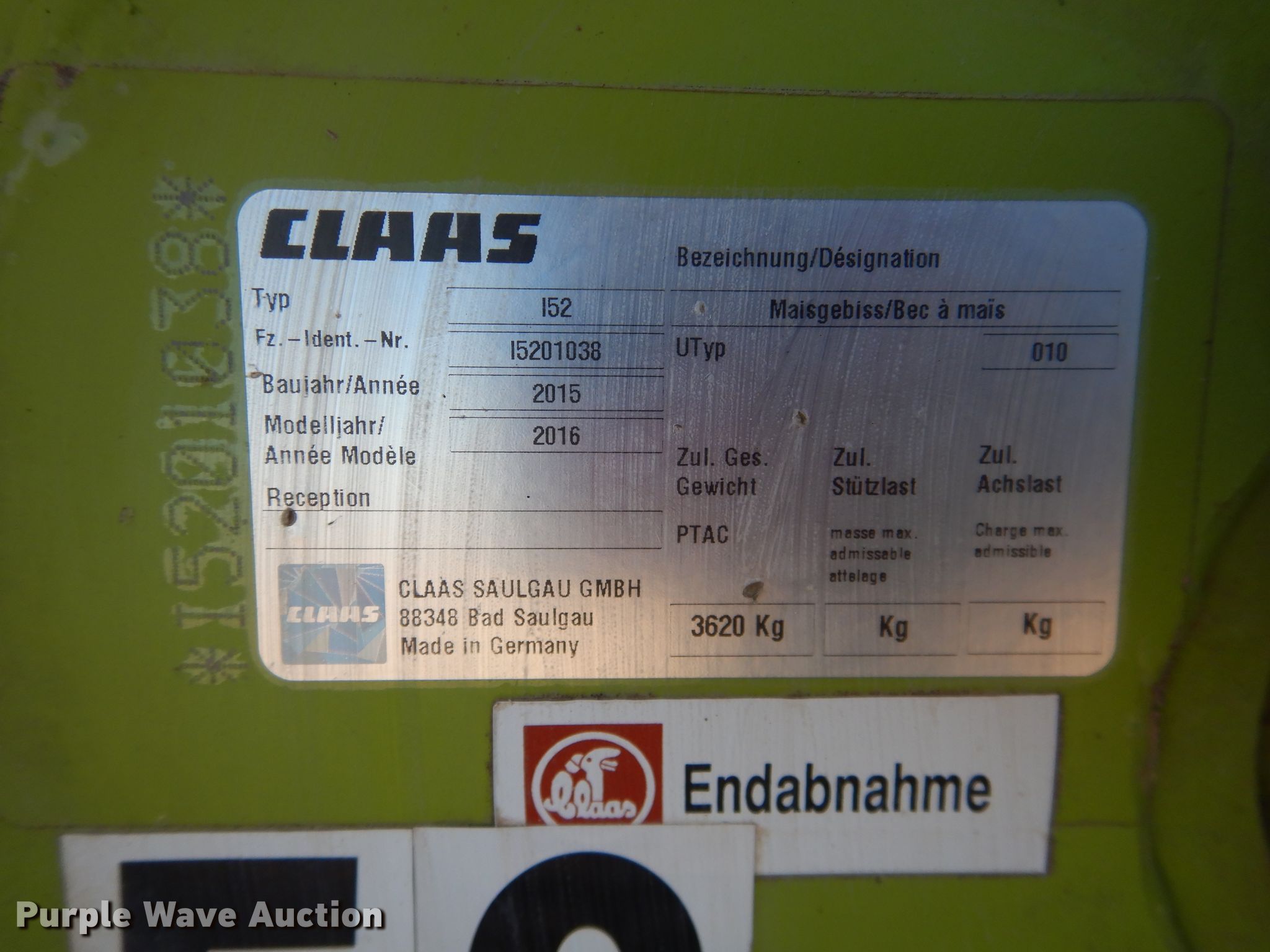 Purple Wave is selling a used Forage Head or Silage Handling in Texas. This item is a 2016 Claas 152 rotary forage head with the following: Serial: 15201038, Unit #: 58