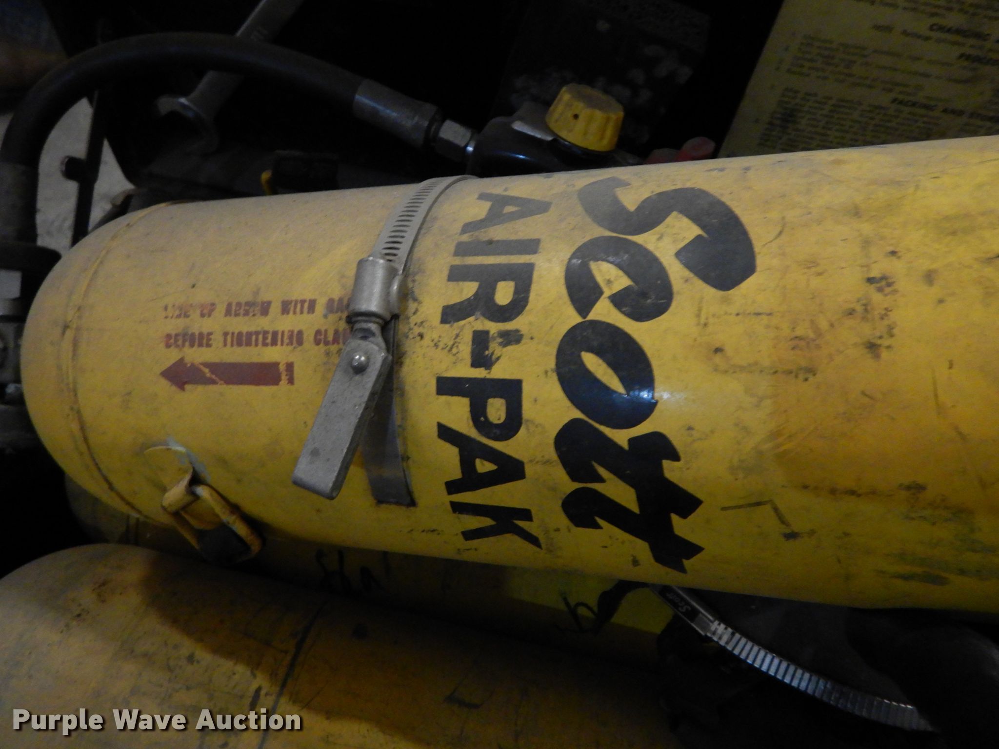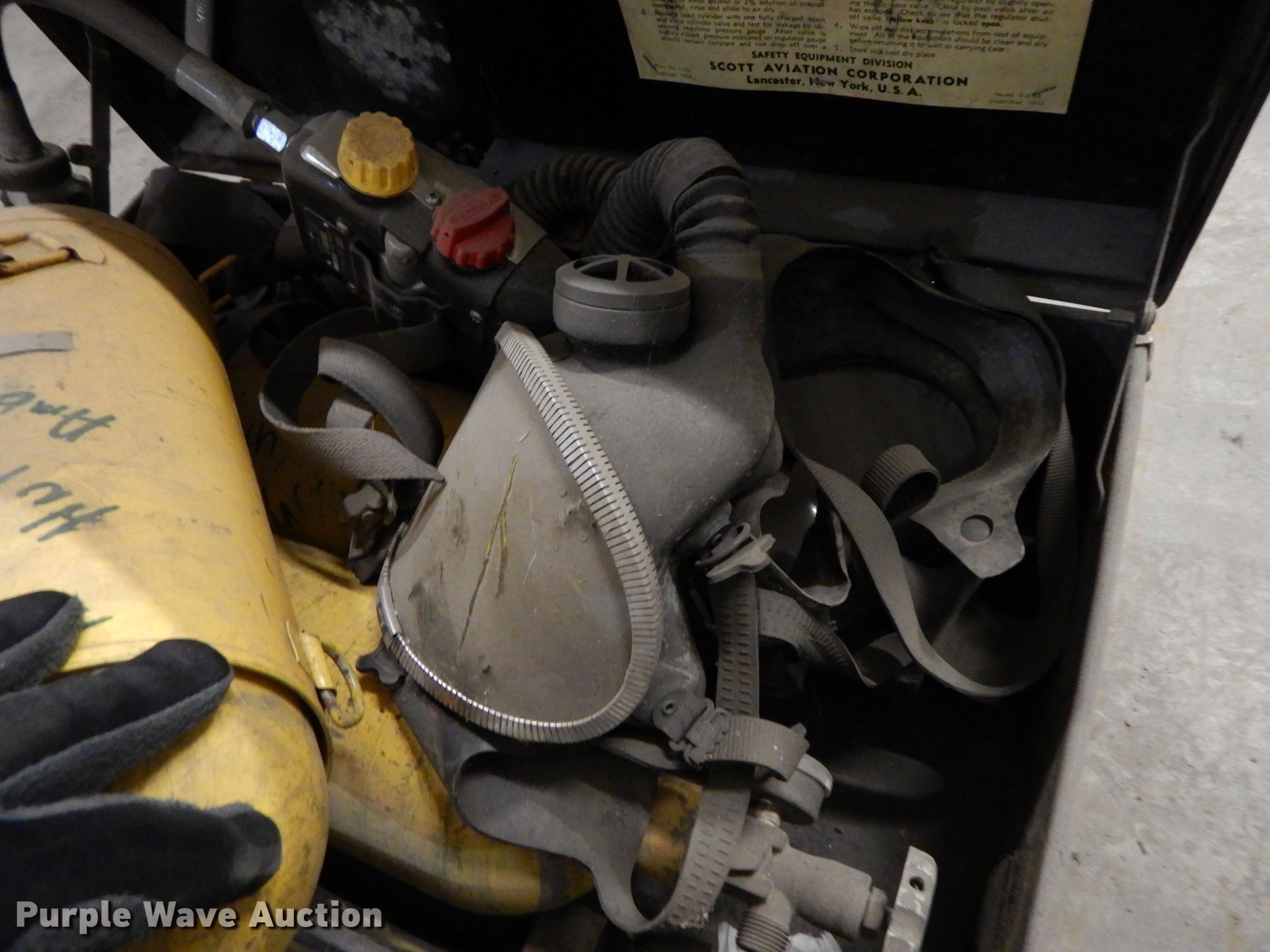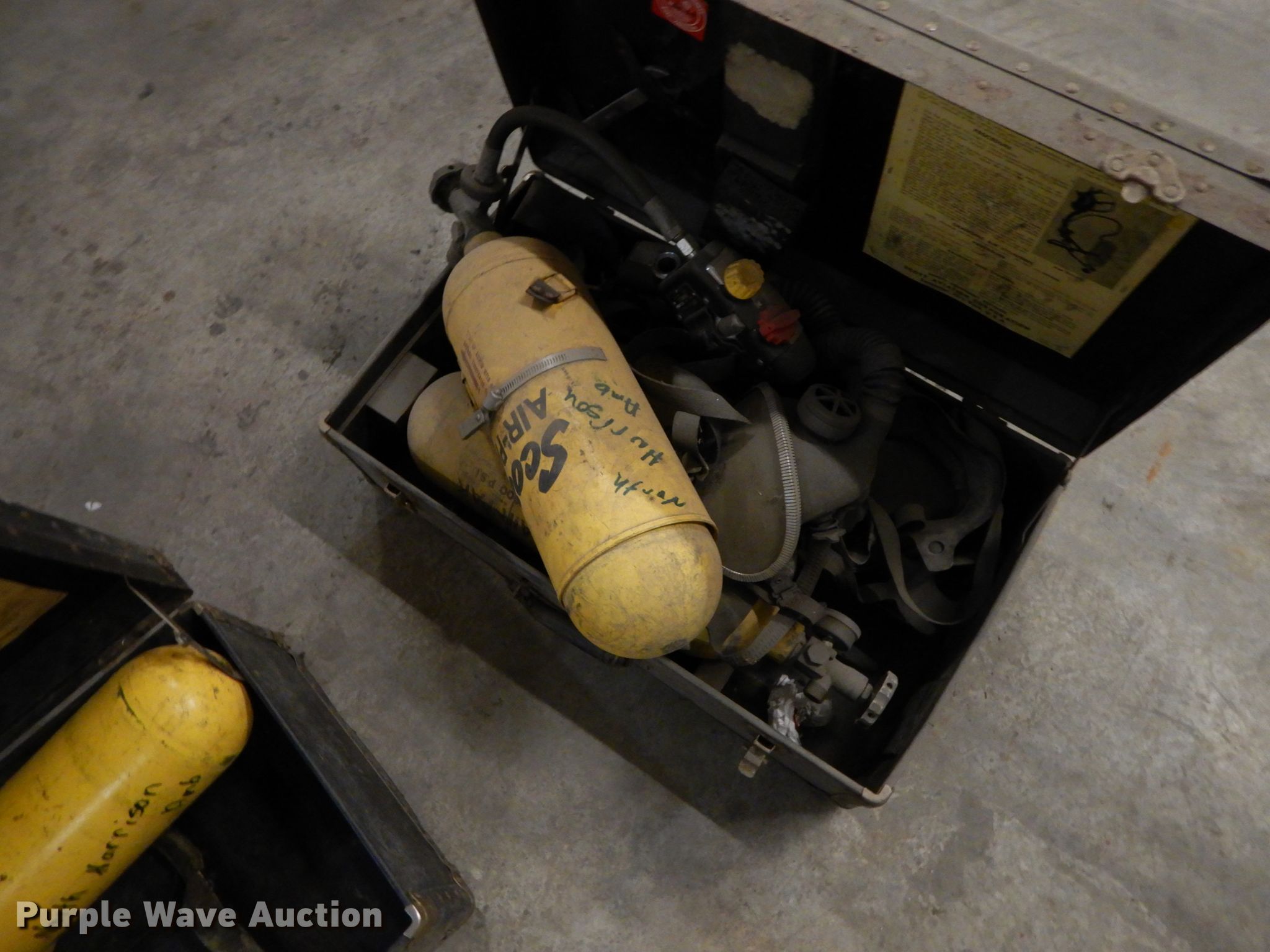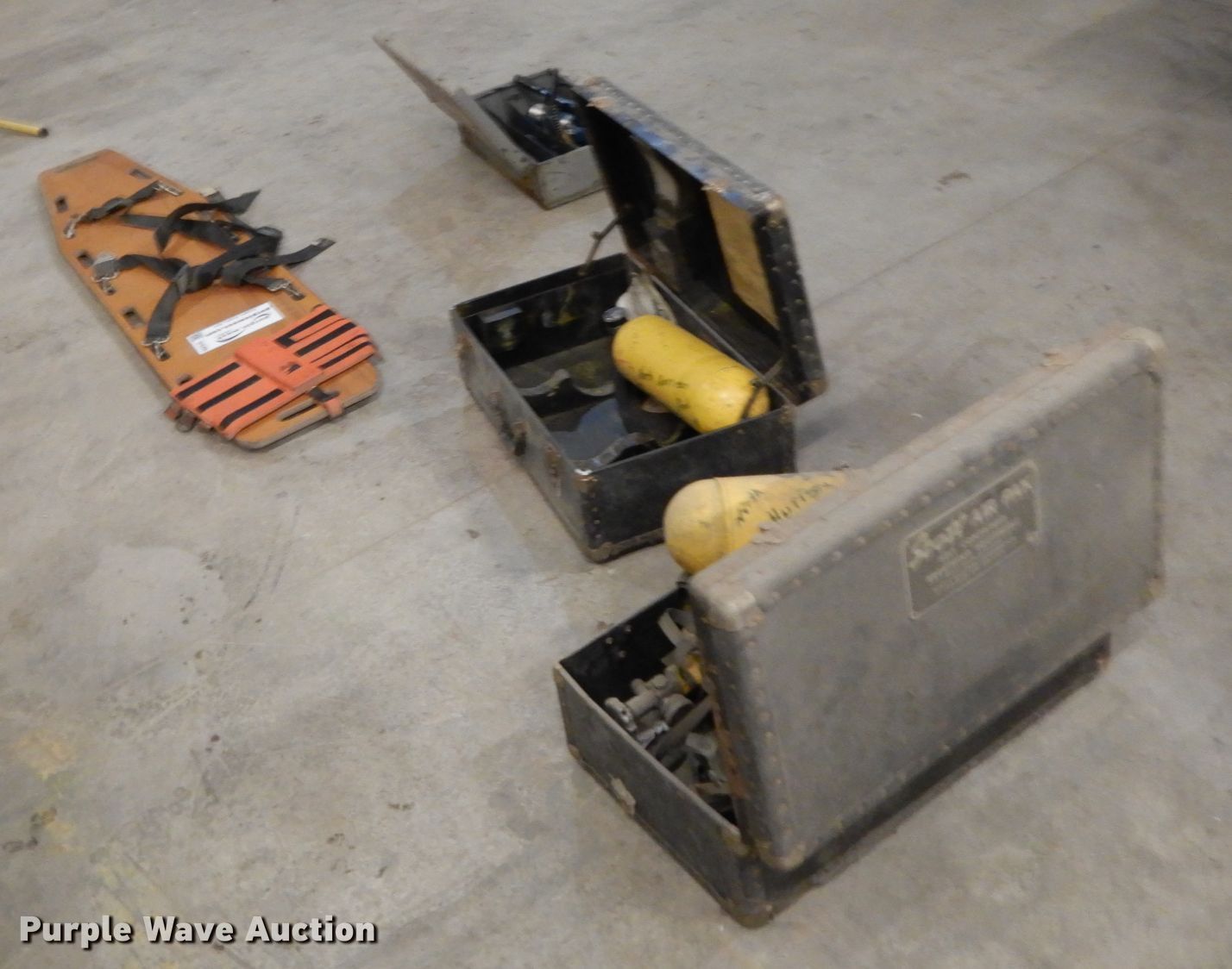 Purple Wave is selling a used Tools in Missouri. This item is a Fire fighting equipment with the following: Stretcher, PF rescue kit, Scott Air-Pak SCBA (Self-contained breathing apparatus), Masks, Wood storage boxes, 64" x 26", Unknown operating condition