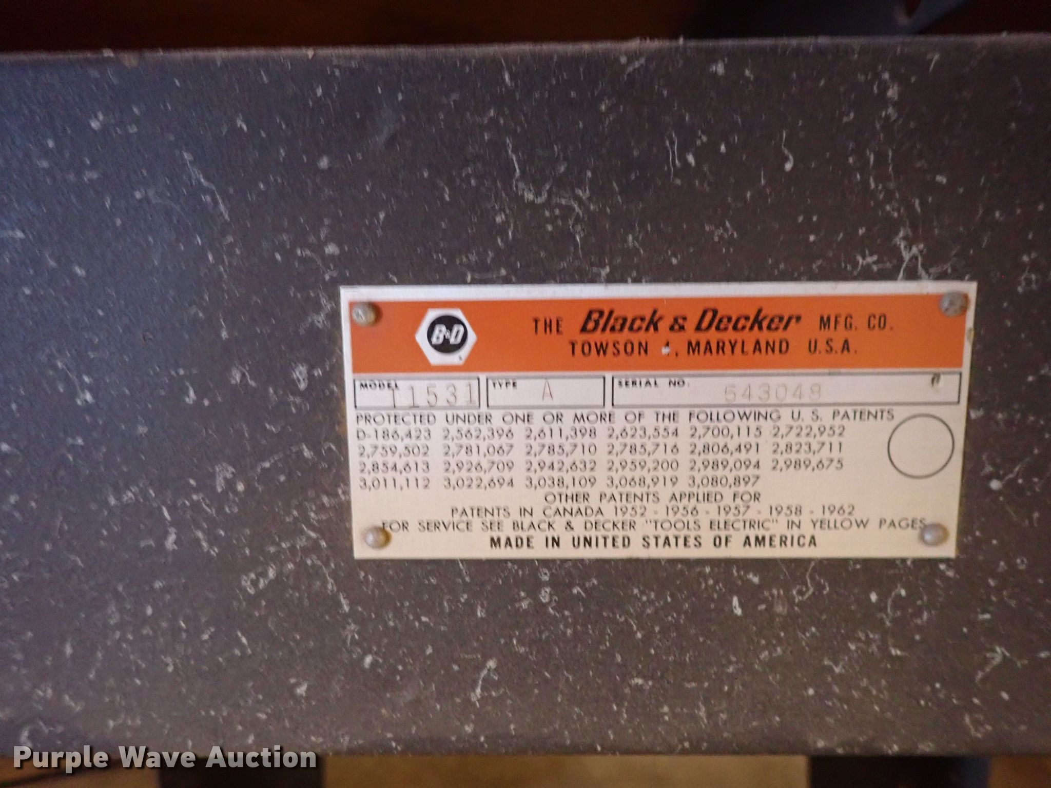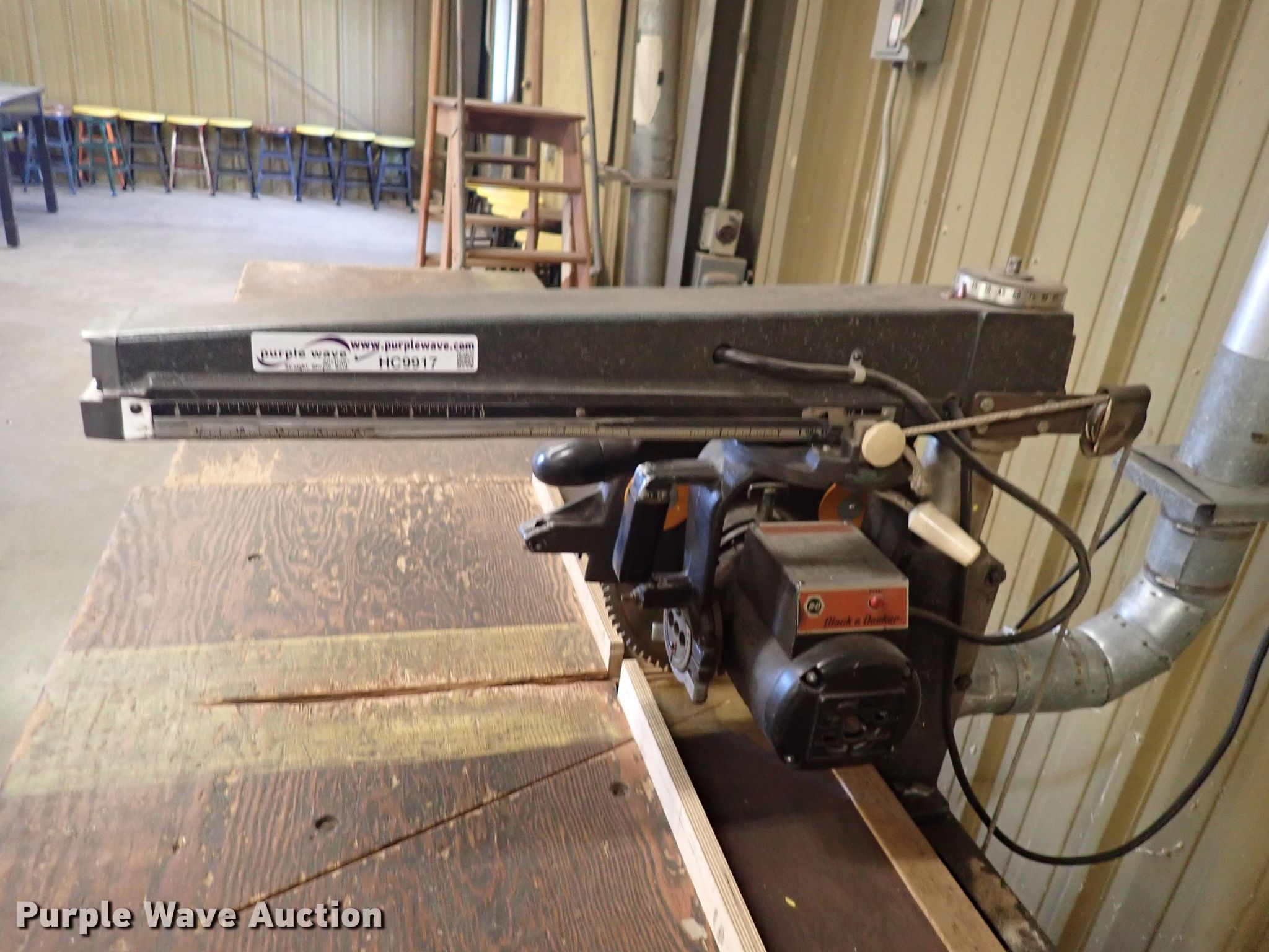 Purple Wave is selling a used Tools in Kansas. This item is a Black & Decker 11531 radial arm saw with the following: Single phase, 120/208-240V, 50" x 32" table, 60" x 33" table, 30" x 20" table, Serial 543048