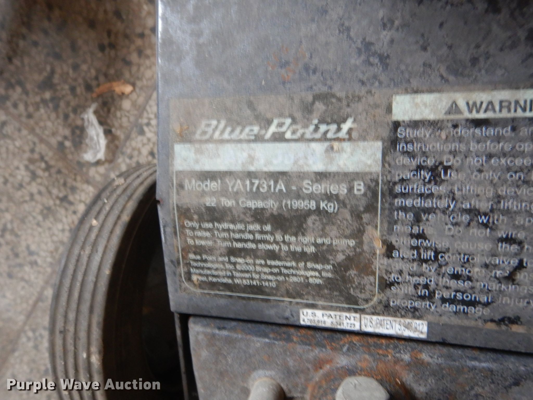 Purple Wave is selling a used Tools in Nebraska. This item is a Jacks with the following: Blue Point YA1731A pneumatic jack, 22 ton max capacity, (2) five ton bottle jacks, Two ton bottle jack, NAPA transmission jack