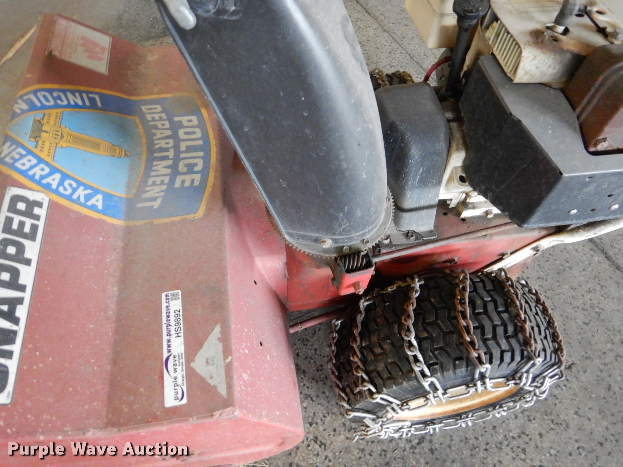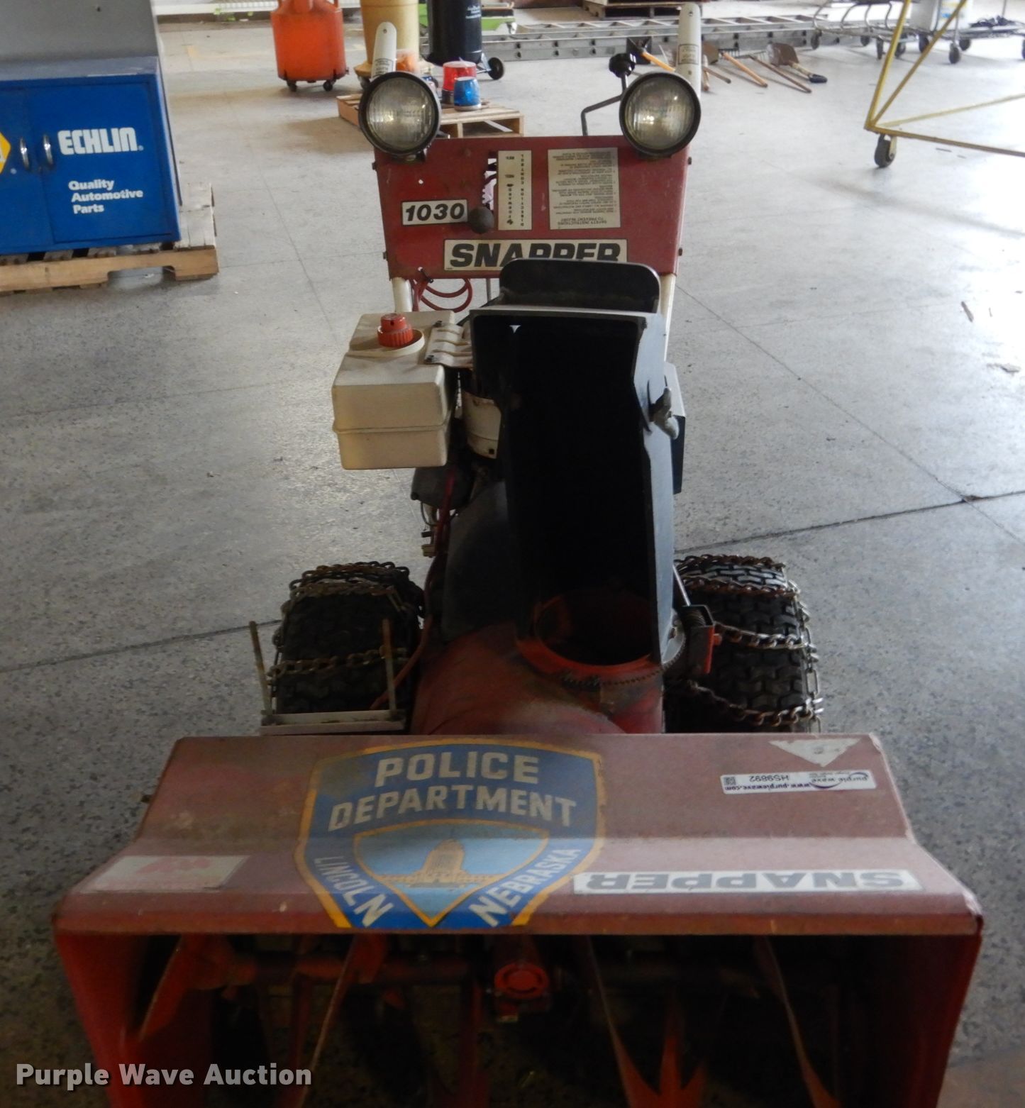 Snapper 1030 snow blower. Single cylinder gas engine, 30" working width, 16x8.50-8 tires, No battery, Unknown operating condition , Serial 63229704. Lincoln Police Garage. 635 J St. Lincoln, NE 68508