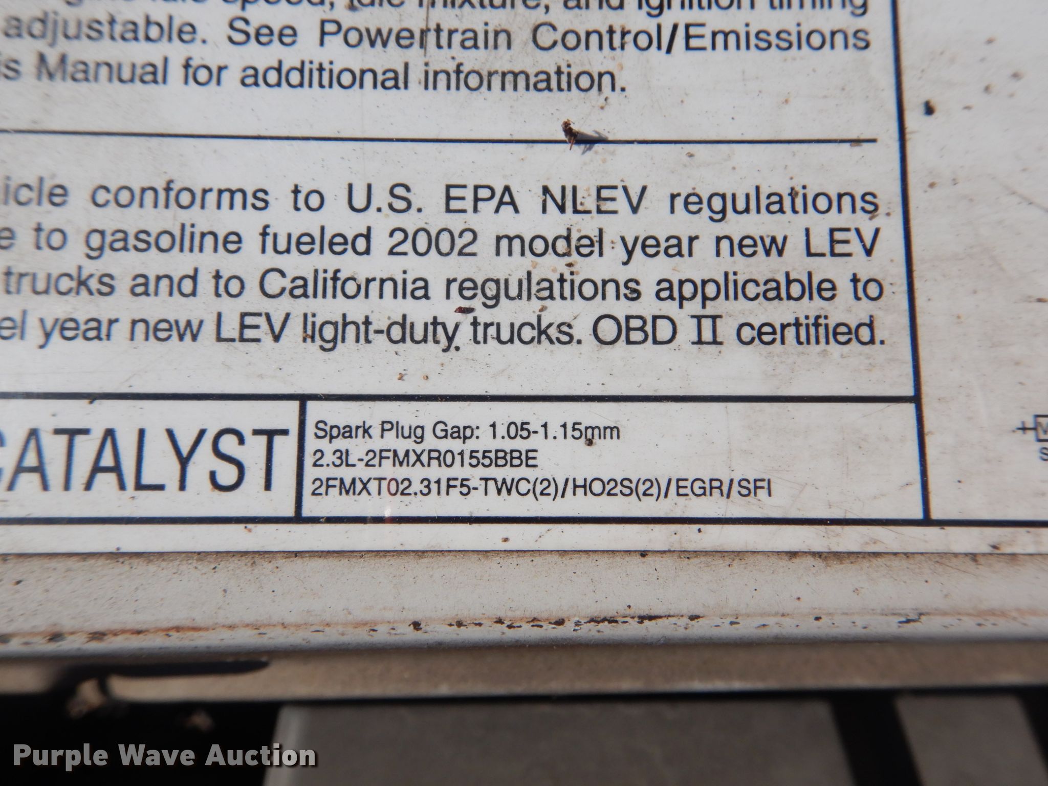 2002 Ford Ranger pickup truck. 109,809 miles on odometer. Engine Displacement: 2.3L L4 SOHC 8V, Cylinders: 4, Fuel type: Gas. Transmission Automatic. Interior AC, Heat. Tires Size: 216/75R15. Notes Dash warning indicator: Check engine. Missouri title. 1FTYR10D62PB69788. City of Festus. 950 N Fifth St. Festus, MO 63028