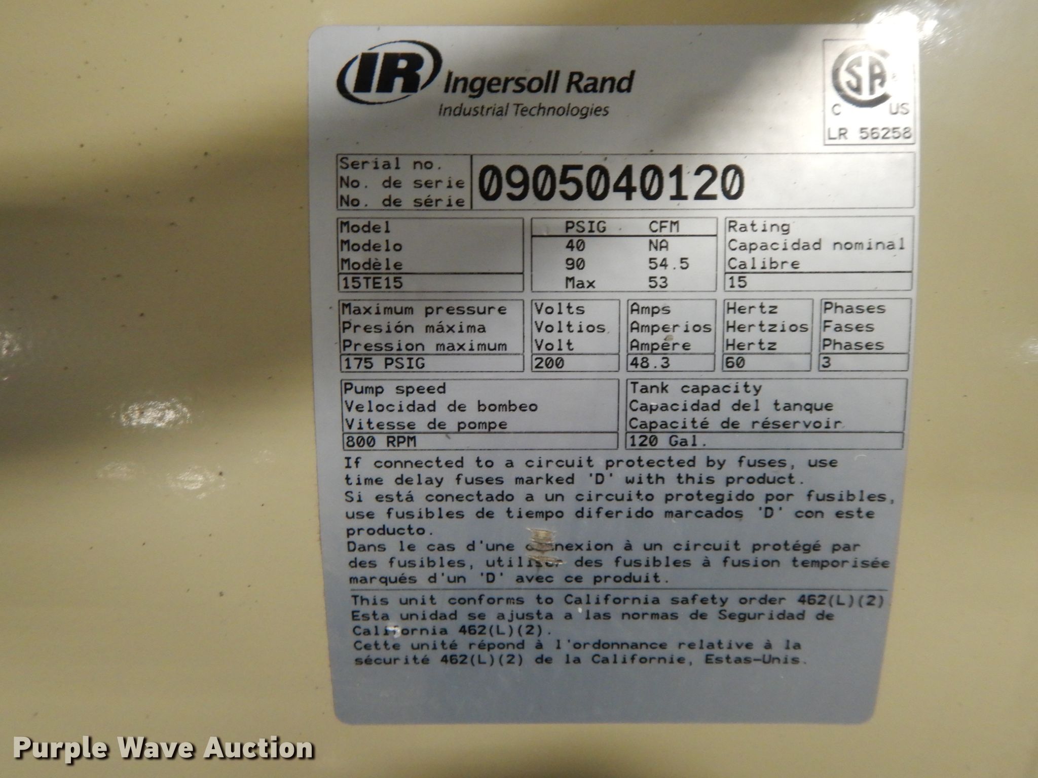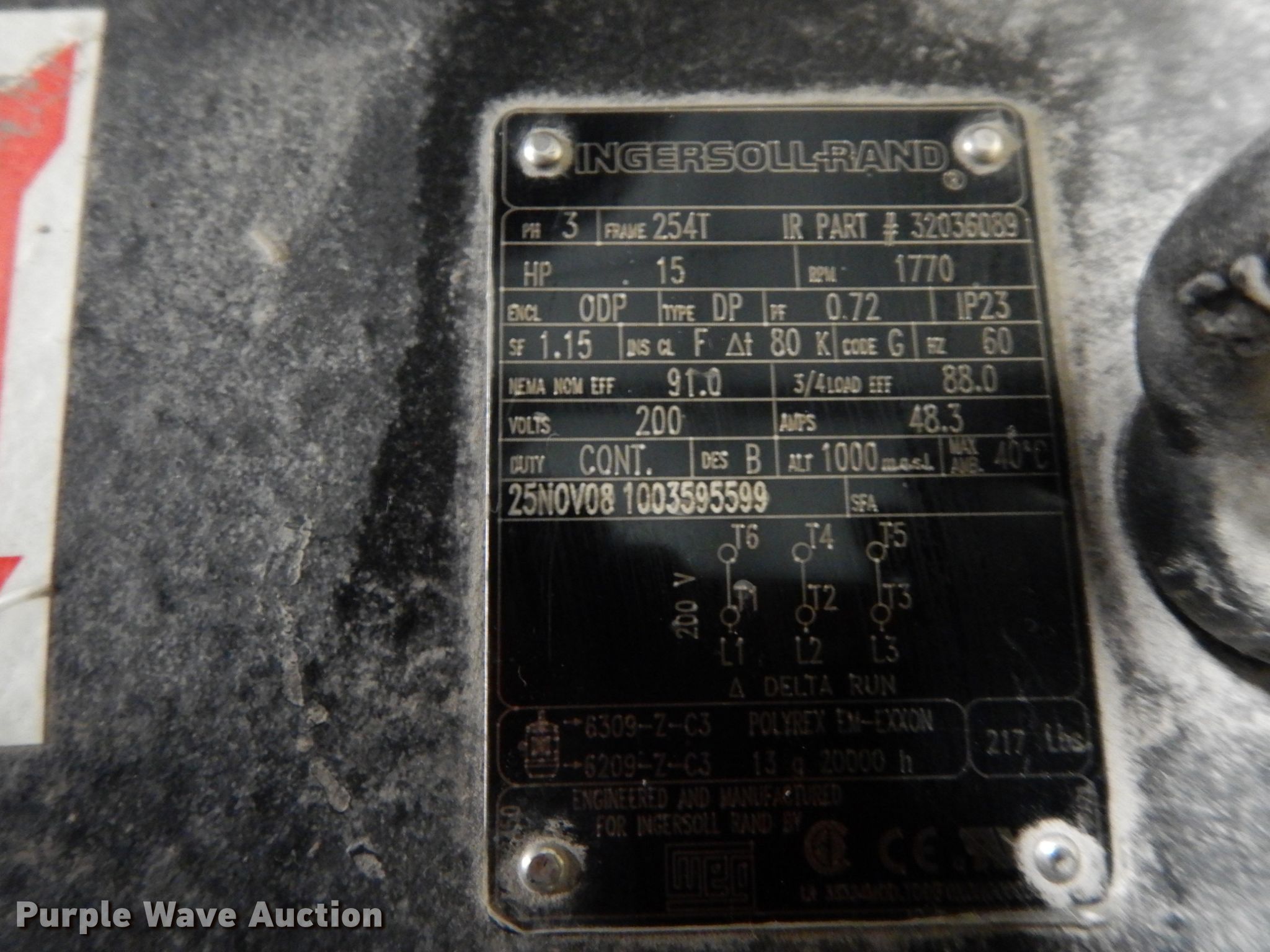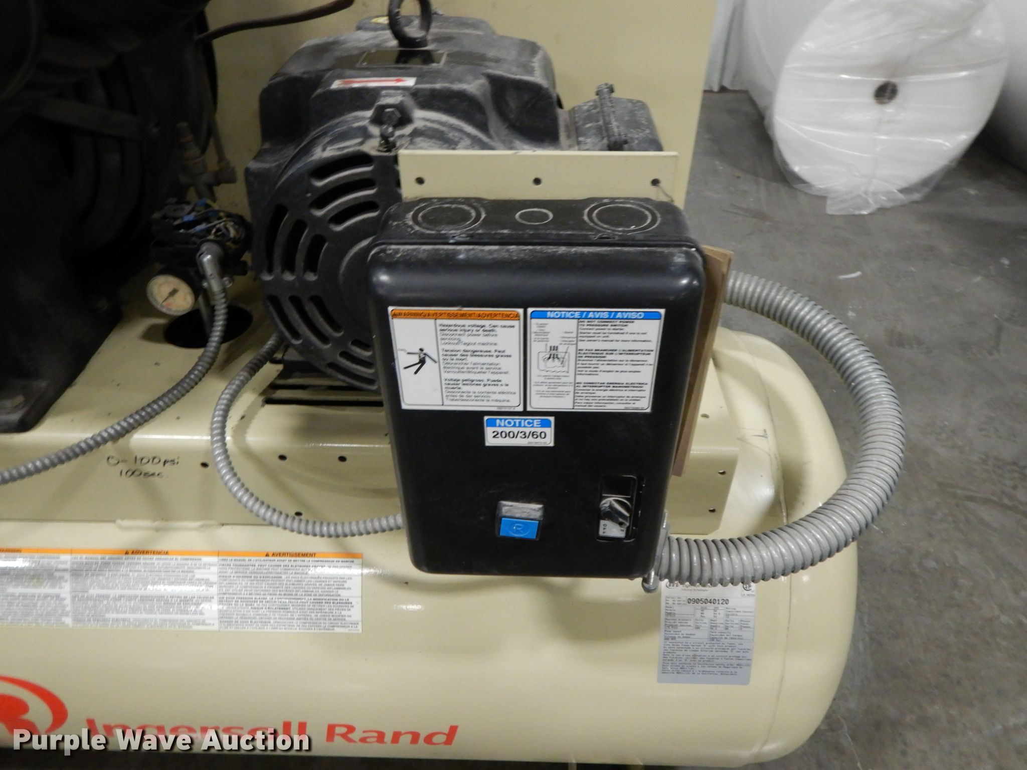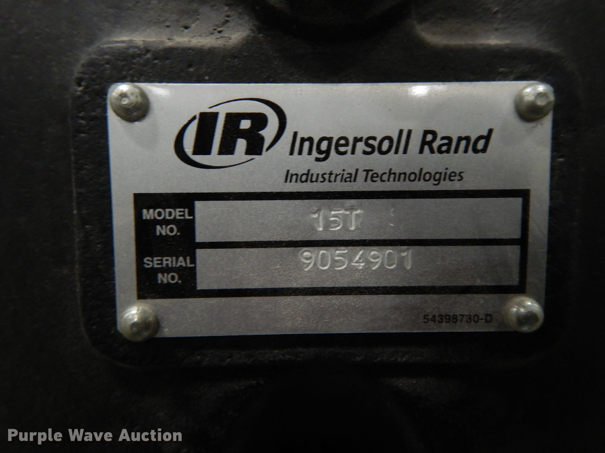 Purple Wave is selling a used Air Compressor in Missouri. This item is a Ingersoll Rand 15TE15 air compressor with the following: Serial: 0905040120