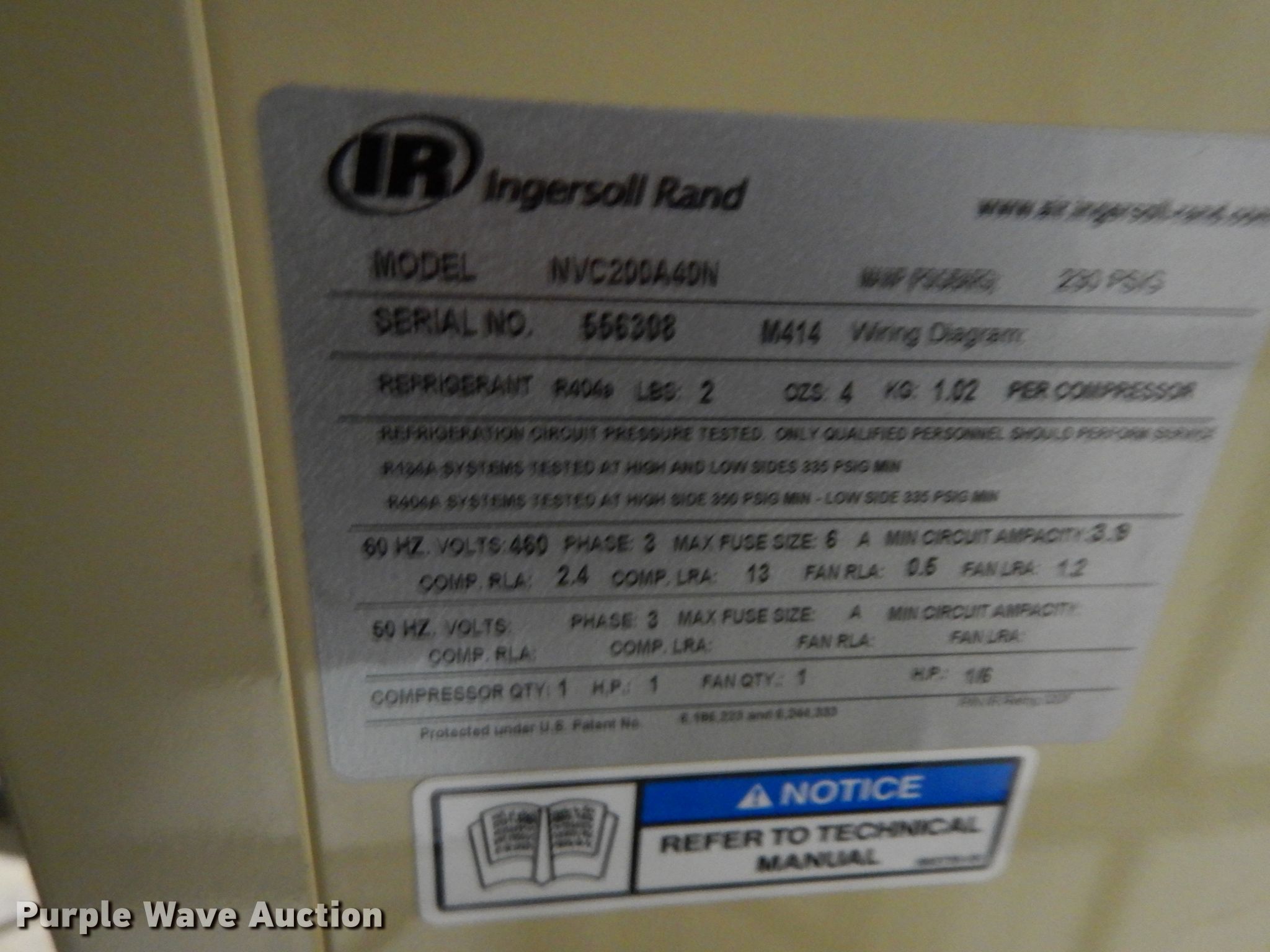 Purple Wave is selling a used Air Compressor in Missouri. This item is a Ingersoll Rand NVC200A40N refrigerated air dryer with the following: Serial: 556308