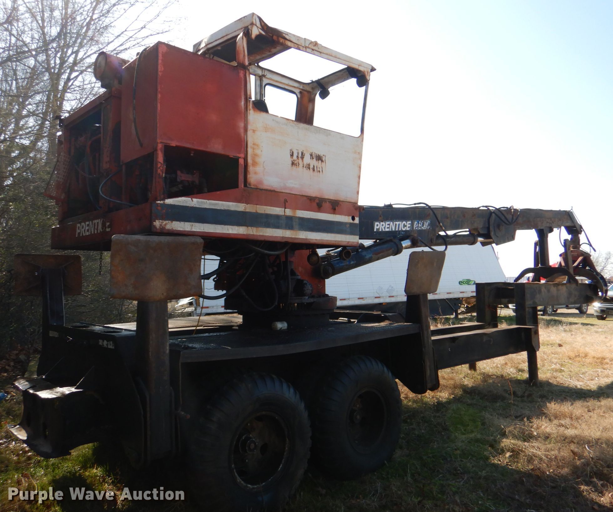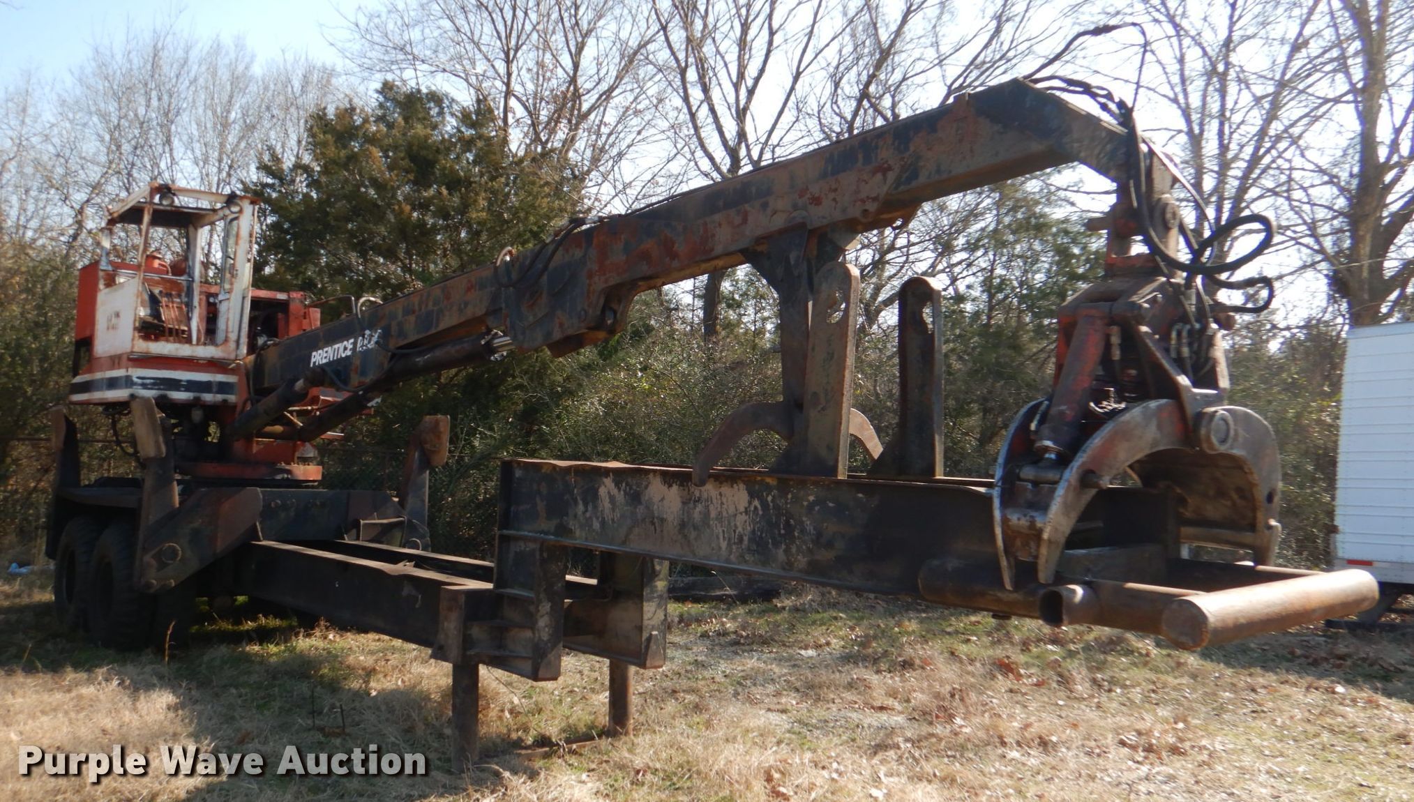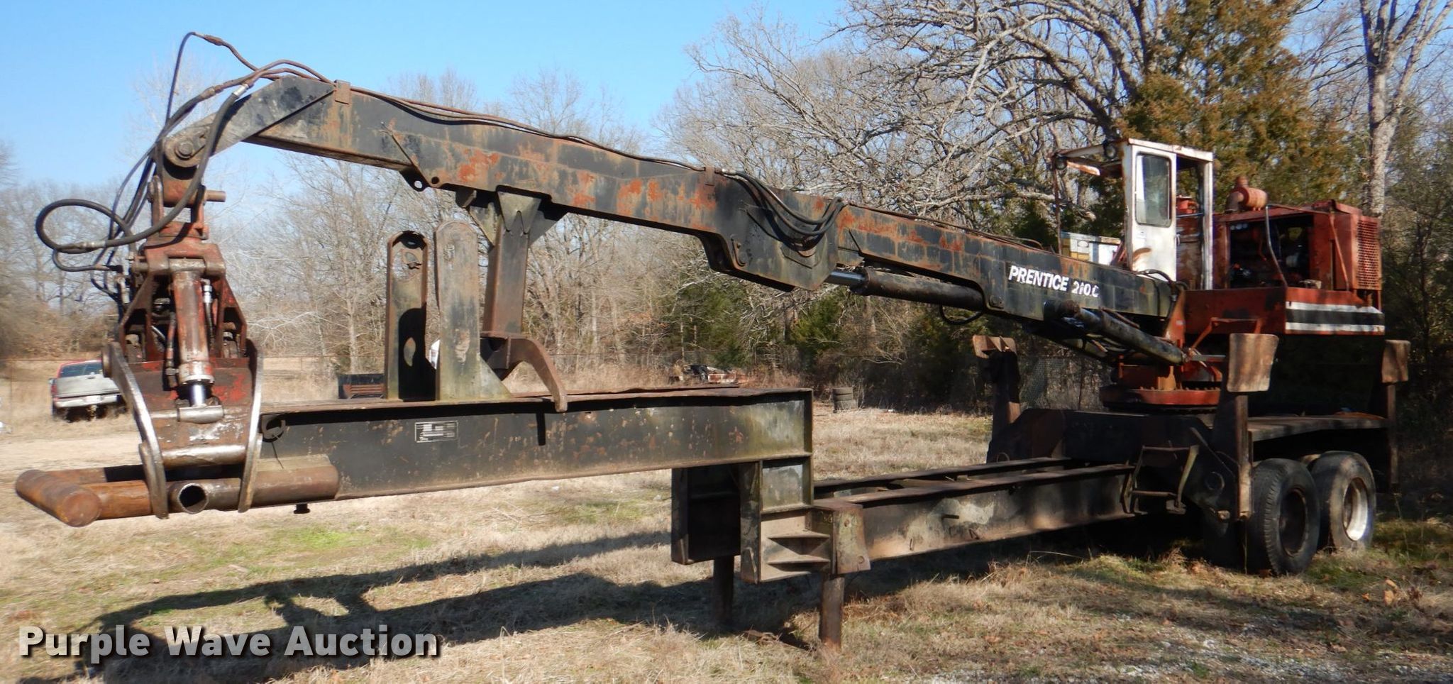 Purple Wave is selling a used Log Loader in Oklahoma. This item is a Prentice D210C log loader with the following: Serial: 210P23595, Cummins 5.9L six cylinder diesel engine, 27' boom length, 31"W grapple, Fuel leak, Battery weak