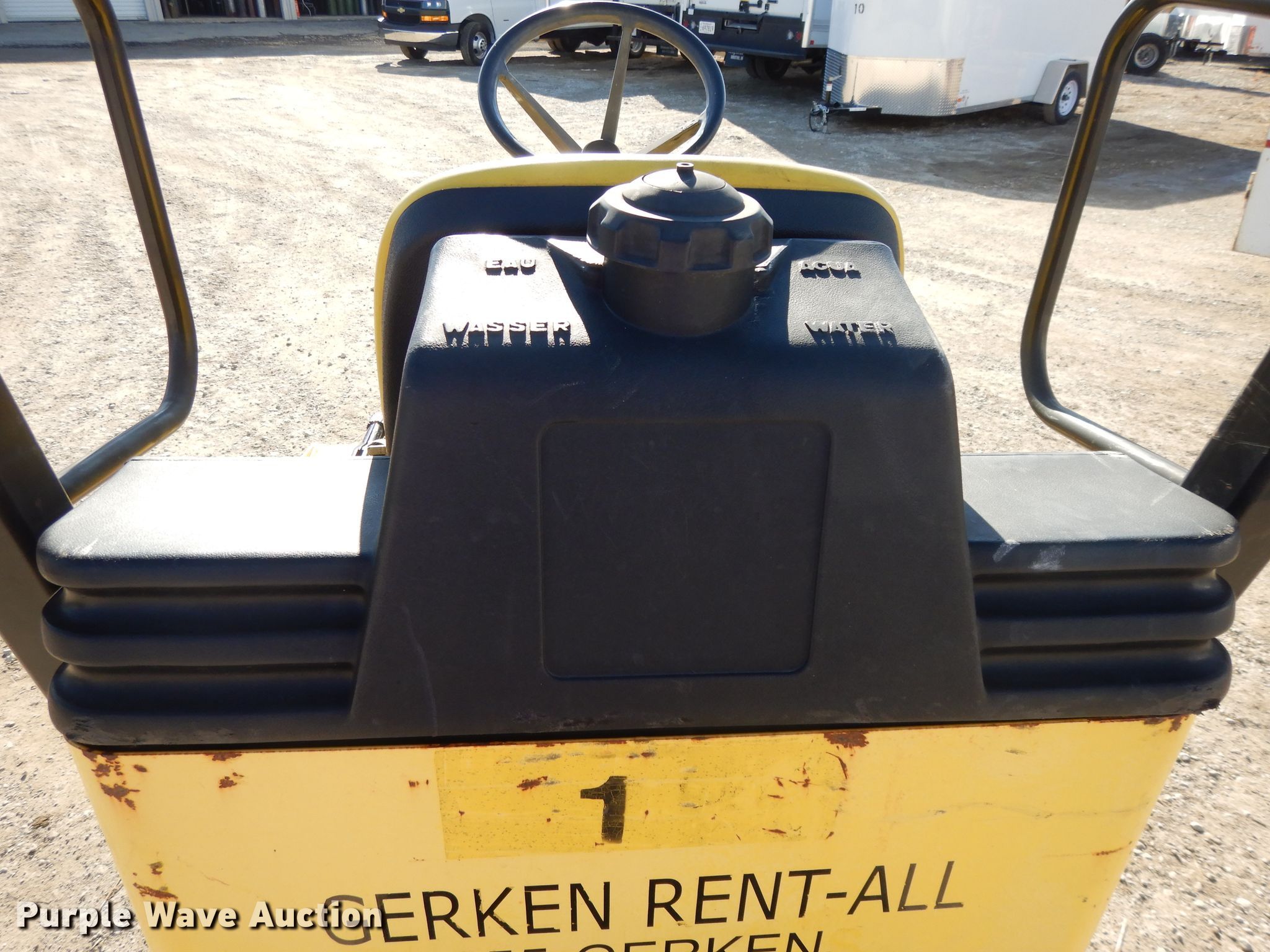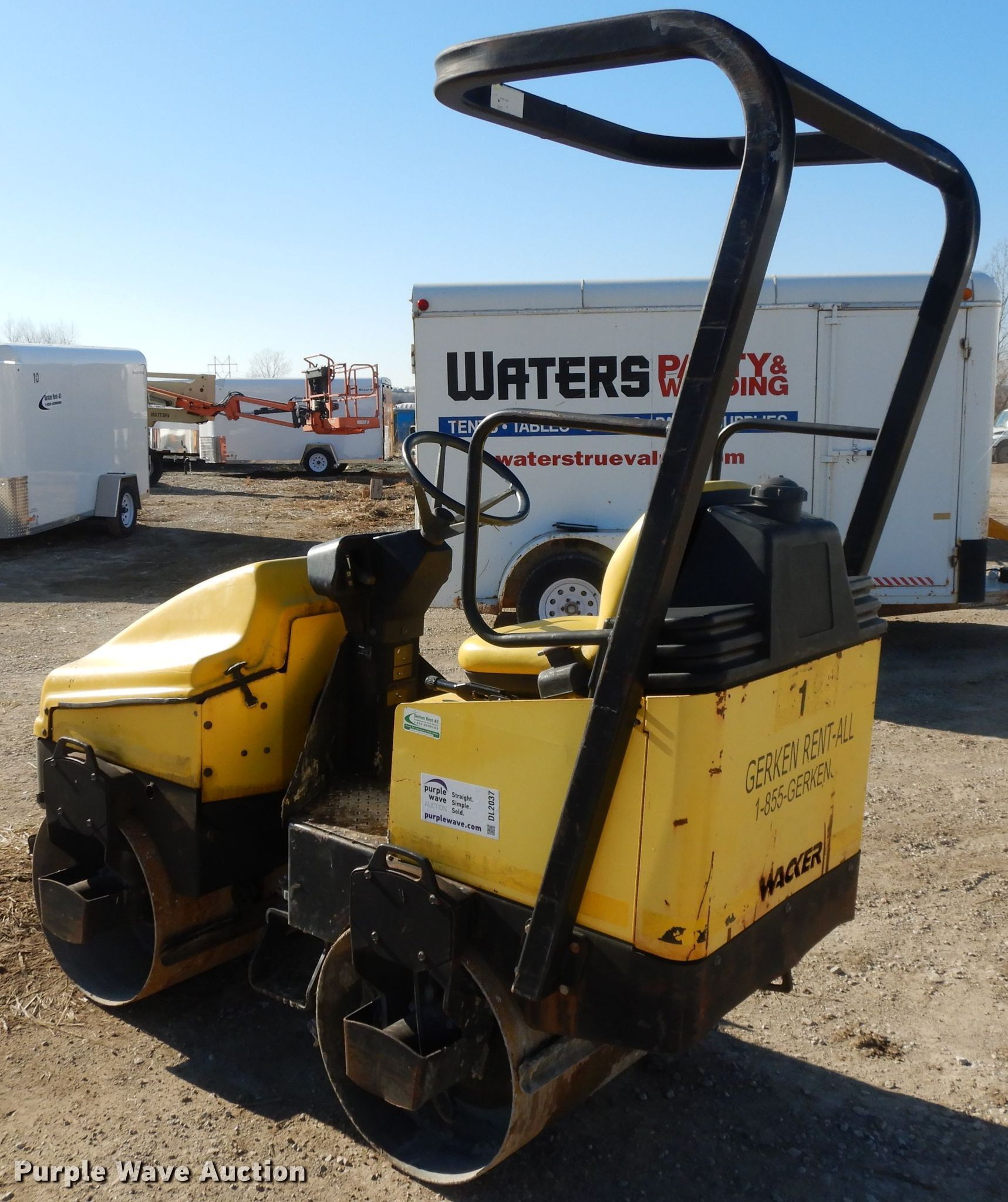 2006 Wacker RD11A double drum roller. 838 hours on meter. Engine Honda, Cylinders: 2, Fuel type: Gas. Transmission Hydrostatic. Operators station OROPS. Operational Drum: Smooth, Vibratory system: Single, Front drum Width: 36", Diameter: 22", Rear drum Width: 36", Diameter: 22", Drum scrapers: Front, Rear, Water spray applicator: Rear, Serial 5670721. Gerken Rent-All. 31600 Old KC Rd. Paola, KS 66071