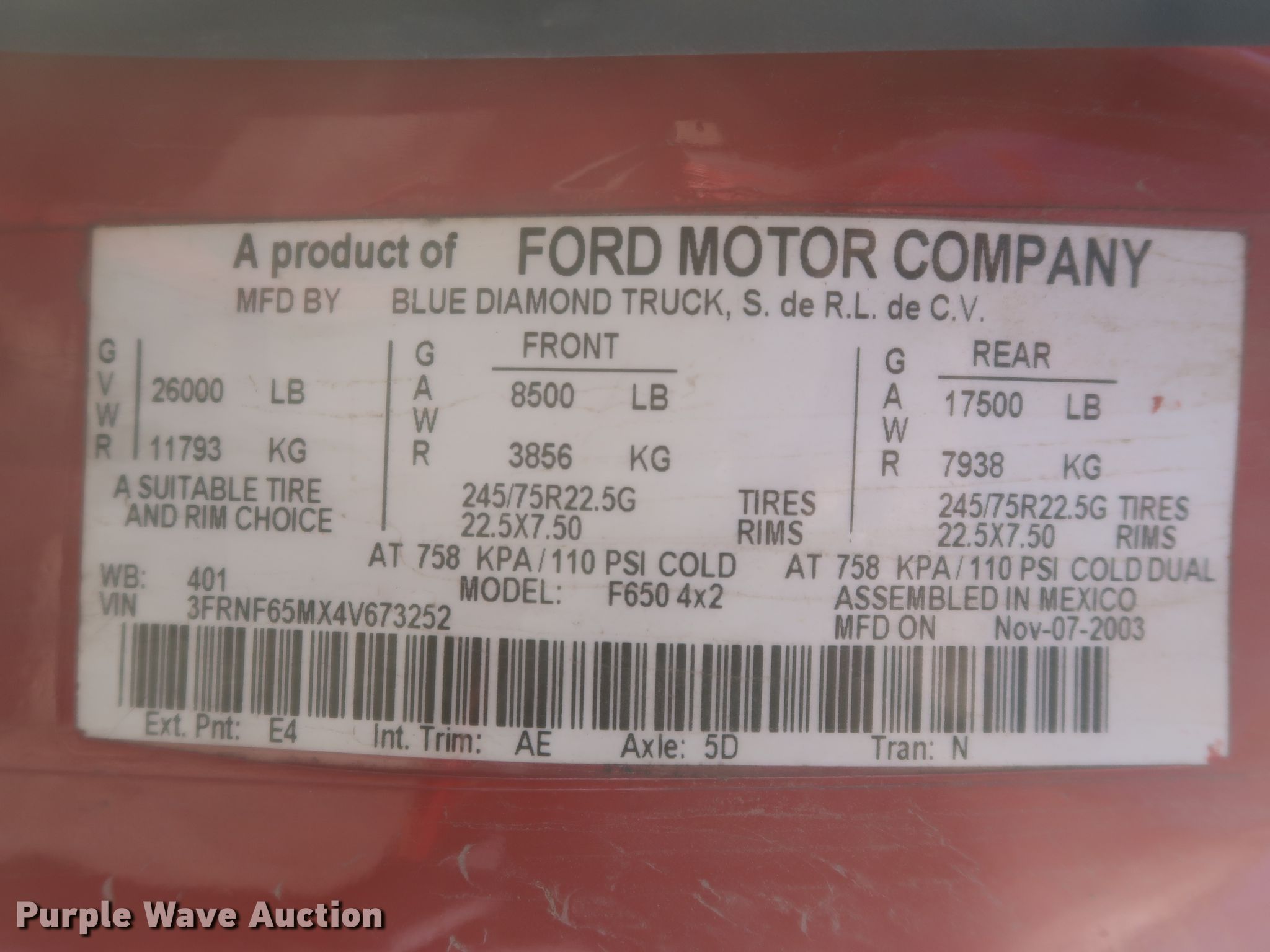 2004 Ford F650 Super Duty XL truck cab and chassis. 73,320 miles on odometer, Engine hours: 1,506, Unit #: 755.159. Engine International B230, Displacement: 6.0L, Cylinders: 8, Fuel type: Diesel, HP: 230. Transmission Manual, Speed: 6. Chassis Axles: Single, Suspension: Spring, Brakes: Hydraulic, Truck chassis: 10' 6"L, GVWR: 26,000 lbs FAWR: 8,500 lbs, RAWR: 17,500 lbs, Wheelbase: 156". Interior Heat, Cruise control. Operational Fuel tank: Single. Tires Size: 10R22.5. Notes Engine issues, Unknown operating condition. Oklahoma title. Title distribution may be delayed up to 30 days from verification of funds. 3FRNF65MX4V673252. Duit Holdings Inc.. 7183 E Waterloo Industrial Rd. Edmond, OK 73034