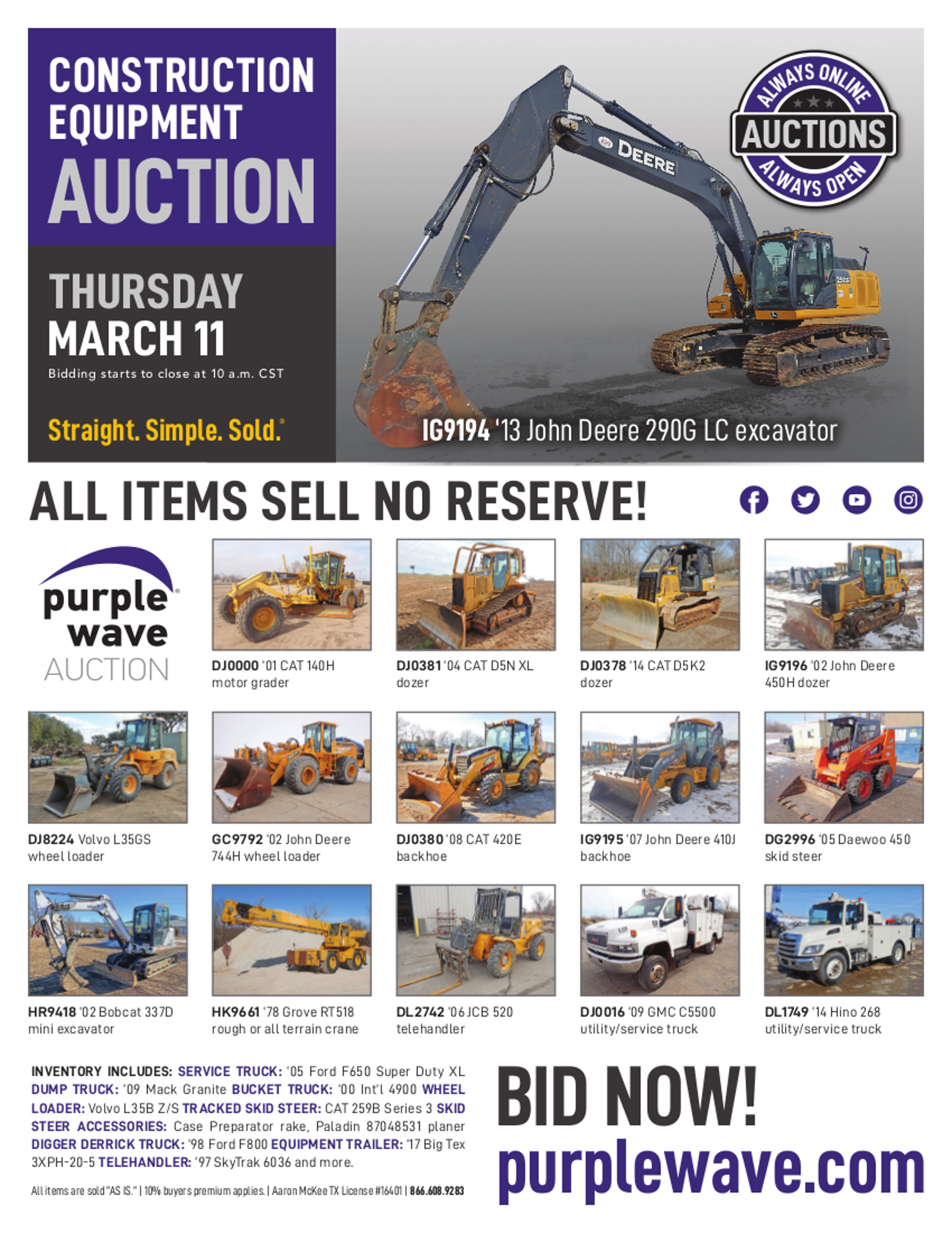 This auction is conducted by Purple Wave, Inc., whose home office is 825 Levee Drive, Manhattan, Kansas. Aaron McKee, Texas auctioneer license # 16401, operates Purple Wave, Inc. Complaints against us may be directed to the Texas Department of Licensing and Regulation, P.O. Box 12157, Austin, Texas 78711, (512) 463-6599. For additional required information, see the attached document.