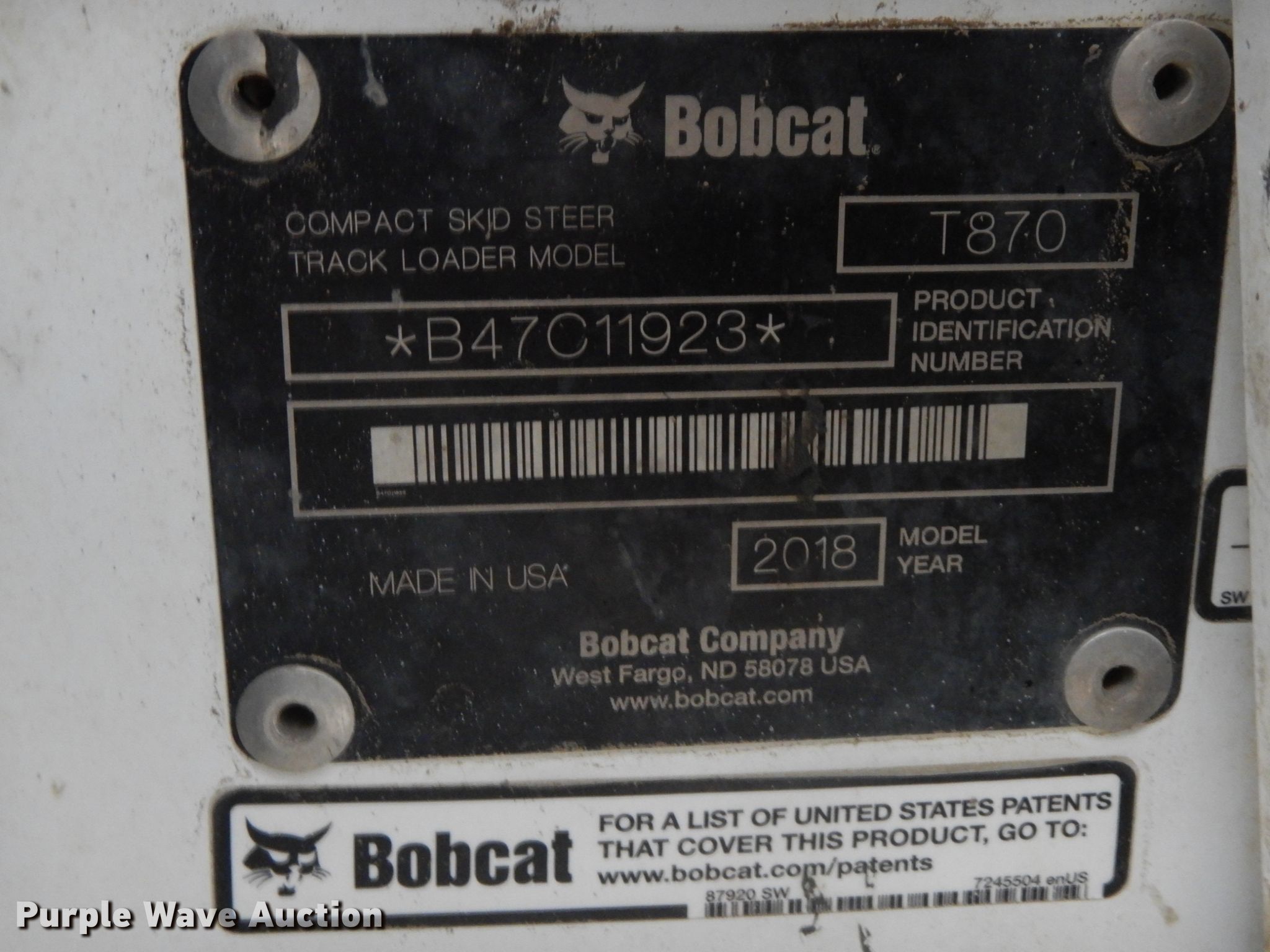 Purple Wave is selling a used Tracked Skid Steer Loader in Missouri. This item is a 2018 Bobcat T870 tracked skid steer loader with the following: 2,119 hours on meter, Serial: B47C11923