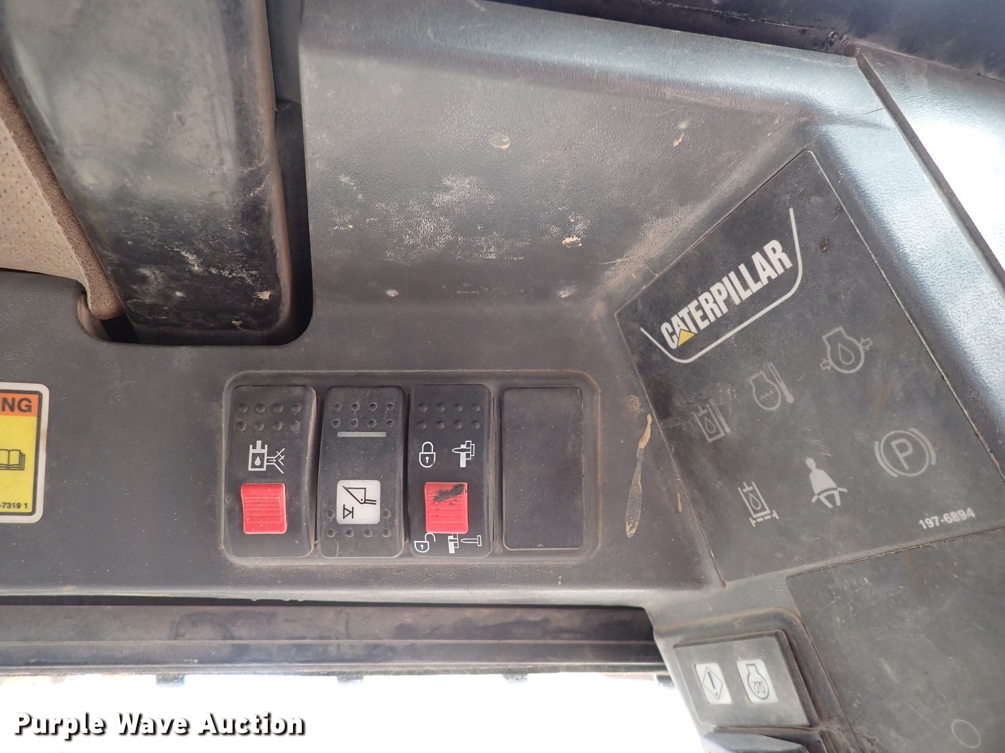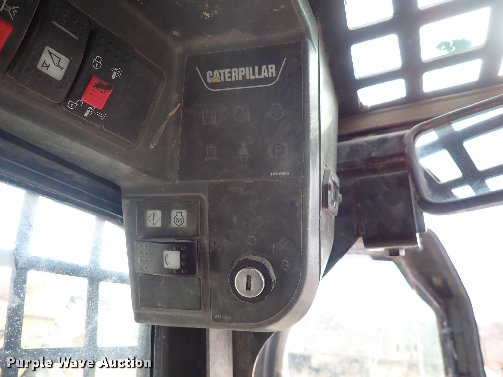 Caterpillar 259B Series 3 tracked skid steer loader. 4,240 hours on meter, Serial: CAT0259BPYYZ85314, Unit #: 53.11L. Engine Caterpillar, Cylinders: 4, Fuel type: Diesel. Transmission Hydrostatic. Operators station Enclosed cab, AC, Heat, Bucket control: Hand. Operational Auxiliary hydraulics, Quick coupler: Hydraulic, Bucket Width: 72", Cutting edge: Bolt-on, Forks Length: 42". Tracks Width: 12". Notes Glass cracked. Sherwood Construction. 5407 N 145th E Ave. Owasso, OK 74055