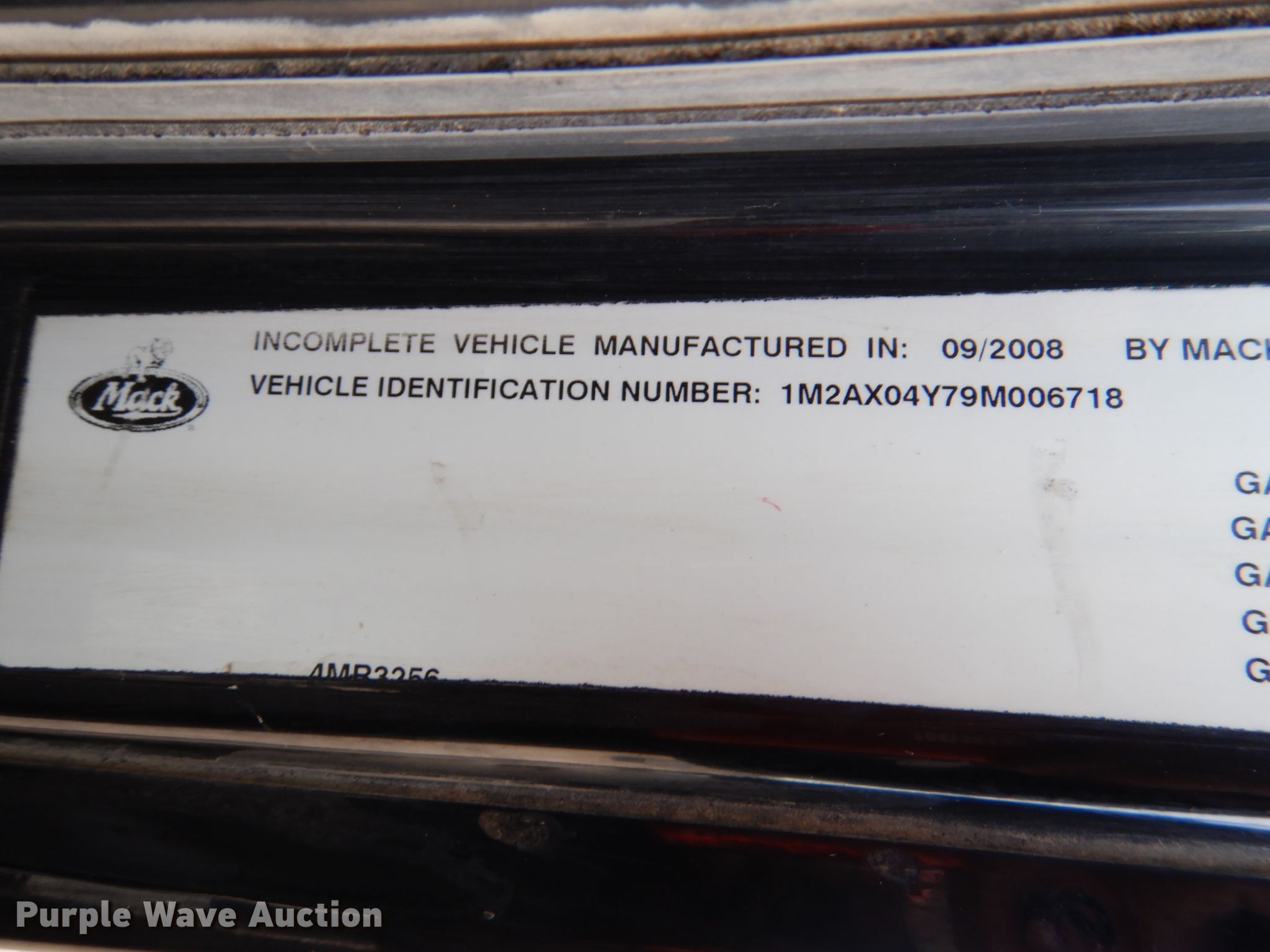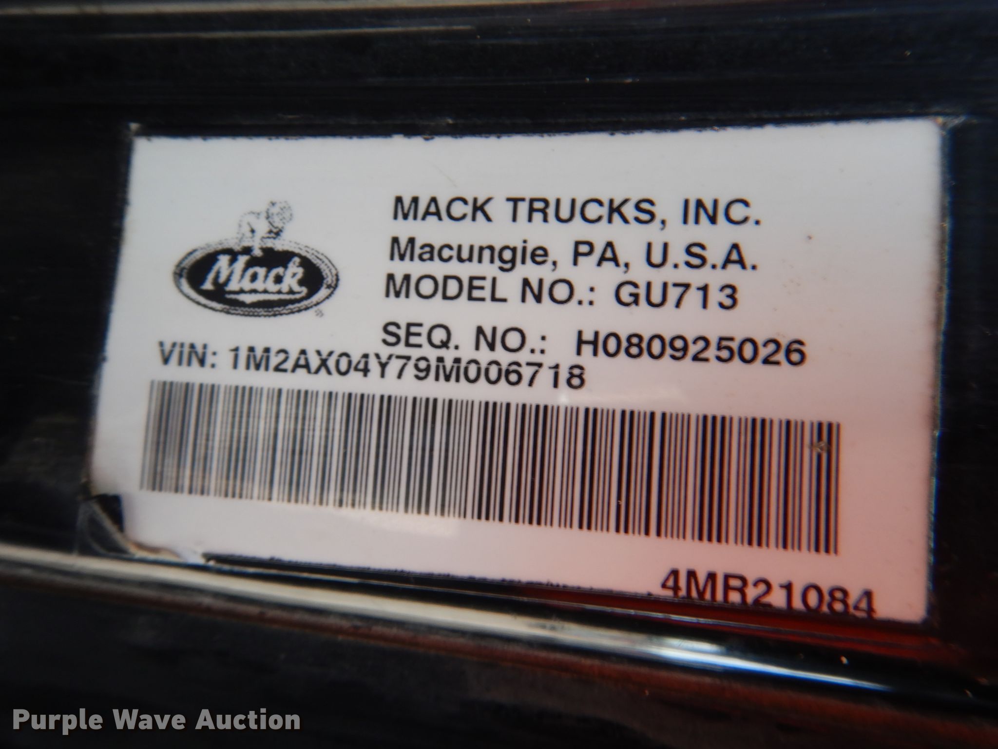 2009 Mack Granite dump truck. 293,976 miles on odometer, Engine hours: 383. Engine Mack MP8, Displacement: 12.7L, Cylinders: 6, Fuel type: Diesel. Transmission Mack Maxitorque ES, Manual, Speed: 10. Chassis Axles: Tandem, Differential lock: Inter-axle, Suspension: Camelback Dump valves, Brakes: Air, PTO, GVWR: 52,320 lbs FAWR: 14,320 lbs, IAWR: 19,000 lbs, RAWR: 19,000 lbs. Interior AC, Heat, Cruise control. Operational Dump bed Houston Fab Truck Beds, 14' L x 96" W, Side height: 45", Side board height: 5", Bed type: Steel, Roll tarp, Ram: Single , End gate: Manual. Tires Size: 11R22.5. Oklahoma title. Title distribution may be delayed up to 14 days from verification of funds. 1M2AX04Y79M006718. Another Pipeline Company. 2430 S Commerce St. Ardmore, OK 73401