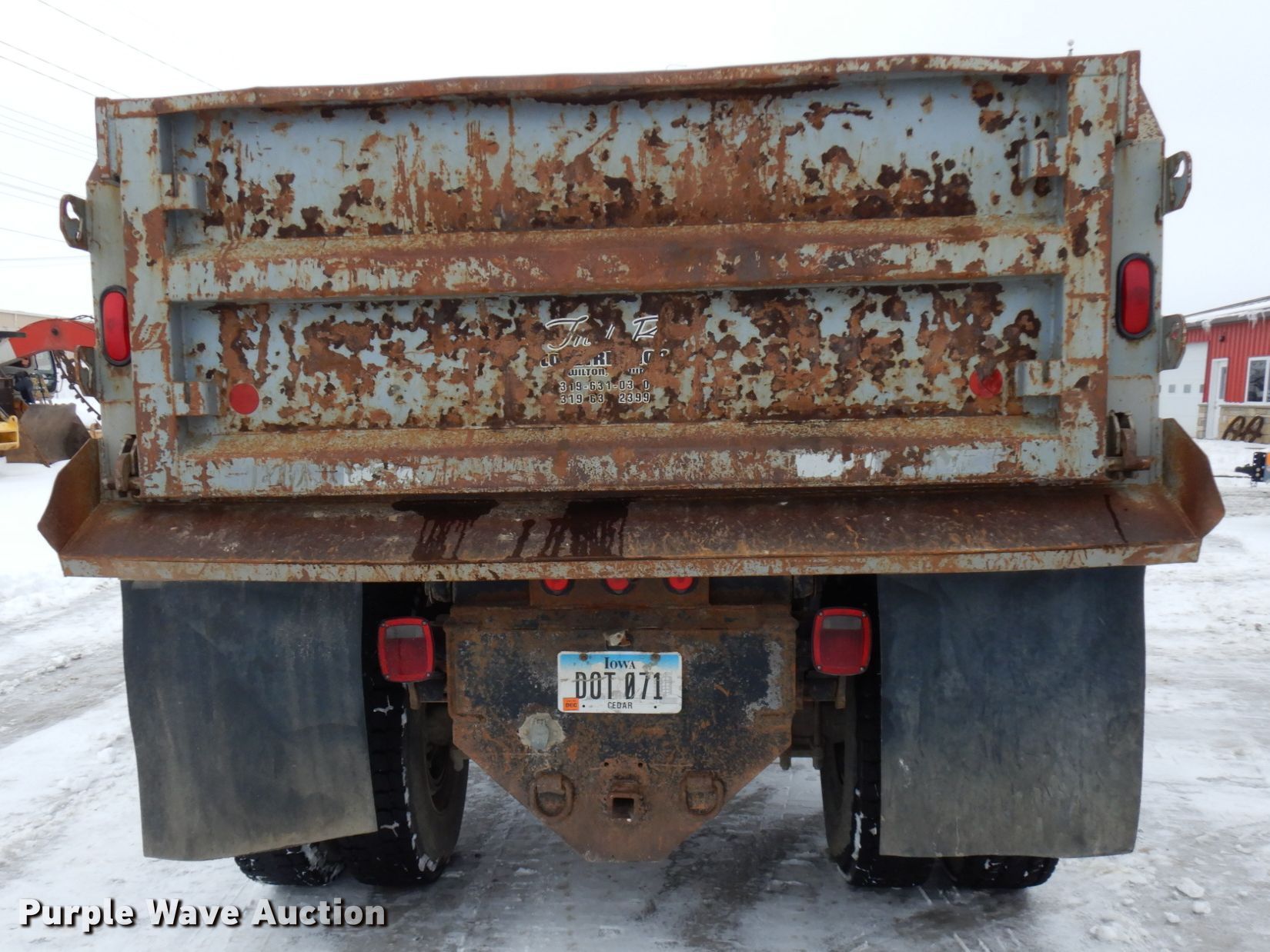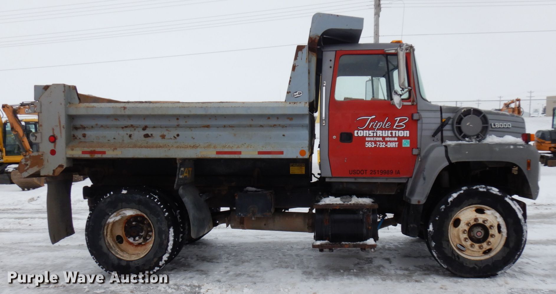 1995 Ford LN8000 dump truck. 408,433 miles on odometer. Engine Cummins, Displacement: 8.3L, Cylinders: 6, Fuel type: Diesel. Transmission Automatic. Chassis Axles: Single, Suspension: Spring, Brakes: Air, PTO, GVWR: 33,000 lbs, Wheelbase: 142". Interior Heat. Operational Dump bed Henderson 10X24, 10' L x 96" W, Side height: 24", Side board height: 8", Bed type: Steel, Ram: Single , End gate: Manual. Tires Size: 11R22.5. Iowa title. 1FTXR82E4SVA81330. Triple B Construction Corp... 710 Ayres Progress Dr. Wilton, IA 52778