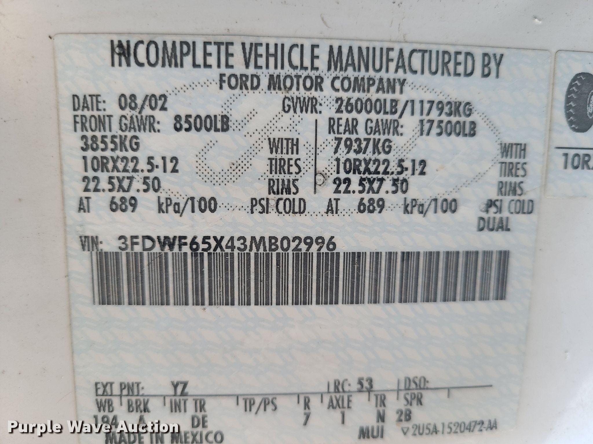 2003 Ford F650 Super Duty flatbed truck. 206,494 miles on odometer. Engine Cummins ISB, Displacement: 5.9L, Cylinders: 6, Fuel type: Diesel. Transmission Manual, Speed: 6. Chassis Axles: Single, Suspension: Spring, Brakes: Air, GVWR: 26,000 lbs, Wheelbase: 194". Interior AC, Heat, Cruise control. Operational Flatbed Length: 16', Width: 96". Tires Size: 10-20. Notes Auxiliary fuel tank not included. Missouri title. 3FDWF65X43MB02996. Lawson Steel Erection Company - Open inspection Mar. 15. 1600 E Dora. Kansas City, MO 64106