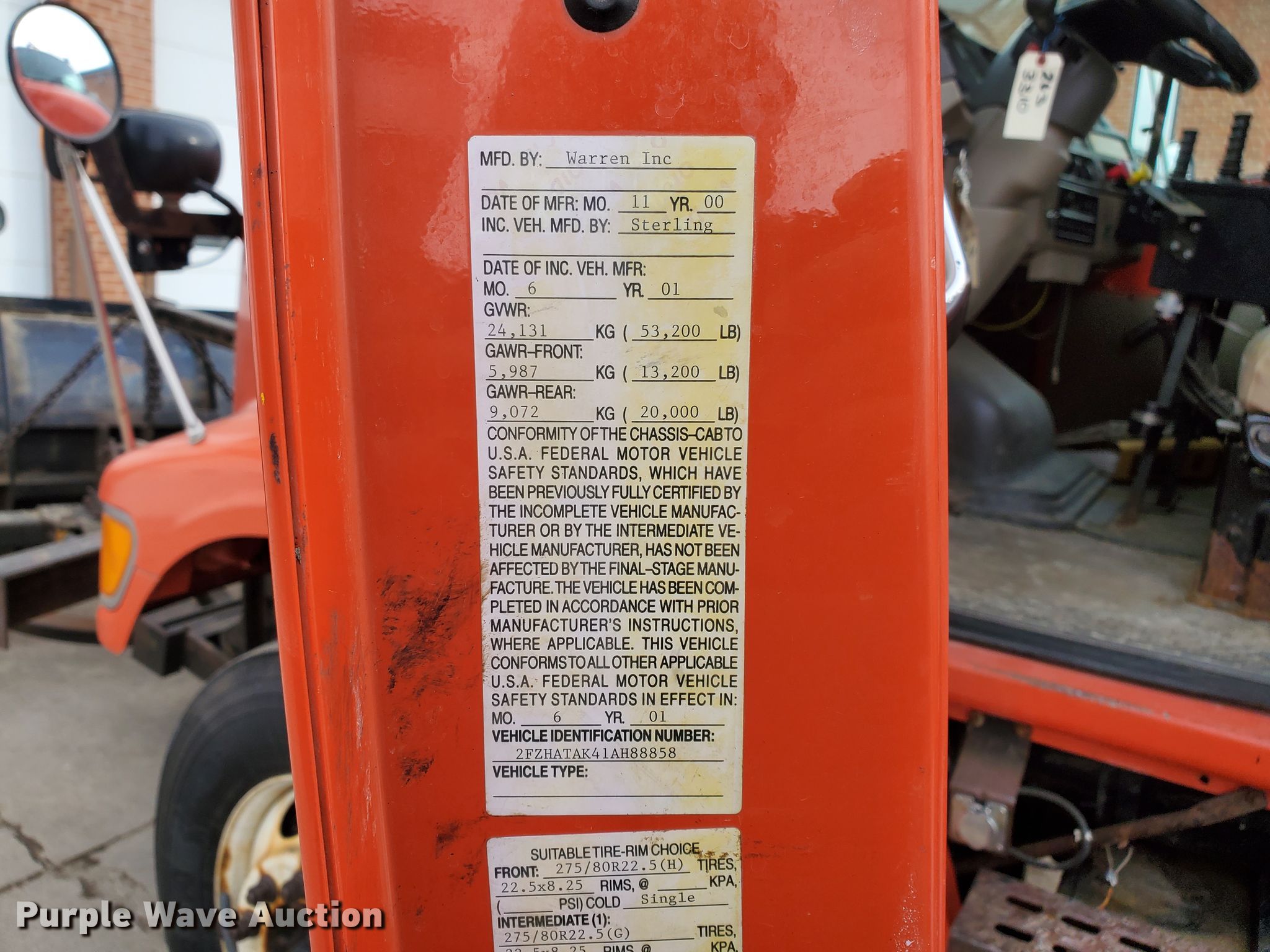 2001 Sterling LT7501 dump truck. 214,784 miles on odometer, Engine hours: 8,042, KDOT ID: 263-3310. Engine Caterpillar 3126, Displacement: 7.2L, Cylinders: 6, Fuel type: Diesel. Transmission Allison MD3060P, Automatic. Chassis Axles: Tandem, Differential lock: Inter-axle, Suspension: Camelback, Brakes: Air, PTO, GVWR: 53,200 lbs FAWR: 13,200 lbs, IAWR: 20,000 lbs, RAWR: 20,000 lbs. Interior AC, Heat, Heated mirrors. Operational Dump bed Warren 1030-13, Capacity: 9 cu.yd., 13' L, Side height: 28", Side board height: 12", Bed type: Steel, Roll tarp, Ram: Single , End gate: Air operated, Spreader Warren, Plow Flink 11PA44KSO, Width: 132". Tires Size: 295/75R22.5, Brand: Goodyear. Notes Engine oil leaks, Wing plow hydraulics missing, Hoist leaks, Non-operational spreader pre-wet system. Kansas title. Titles will be distributed after confirmation of payment and removal. 2FZHATAK41AH88858. Kansas Department of Transportation - Norton. 312 S 2nd Ave. Norton, KS 67654