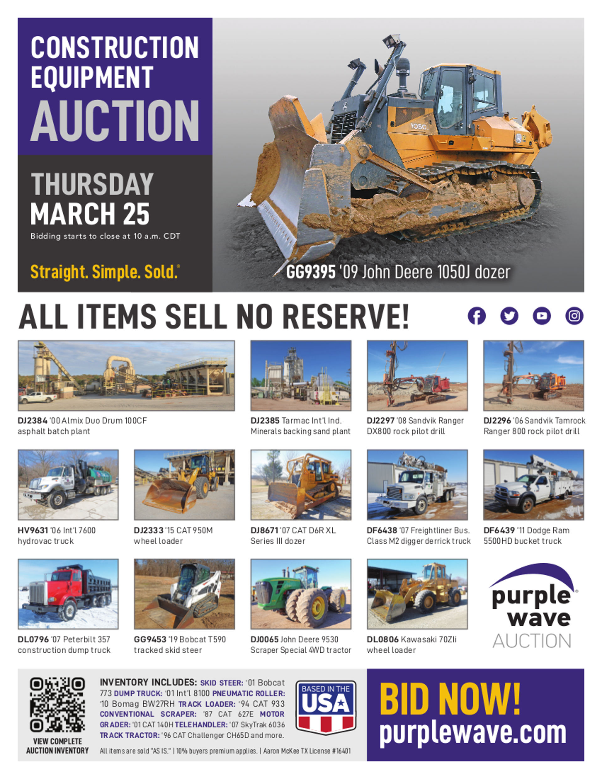 This auction is conducted by Purple Wave, Inc., whose home office is 825 Levee Drive, Manhattan, Kansas. Aaron McKee, Texas auctioneer license # 16401, operates Purple Wave, Inc. Complaints against us may be directed to the Texas Department of Licensing and Regulation, P.O. Box 12157, Austin, Texas 78711, (512) 463-6599. For additional required information, see the attached document.