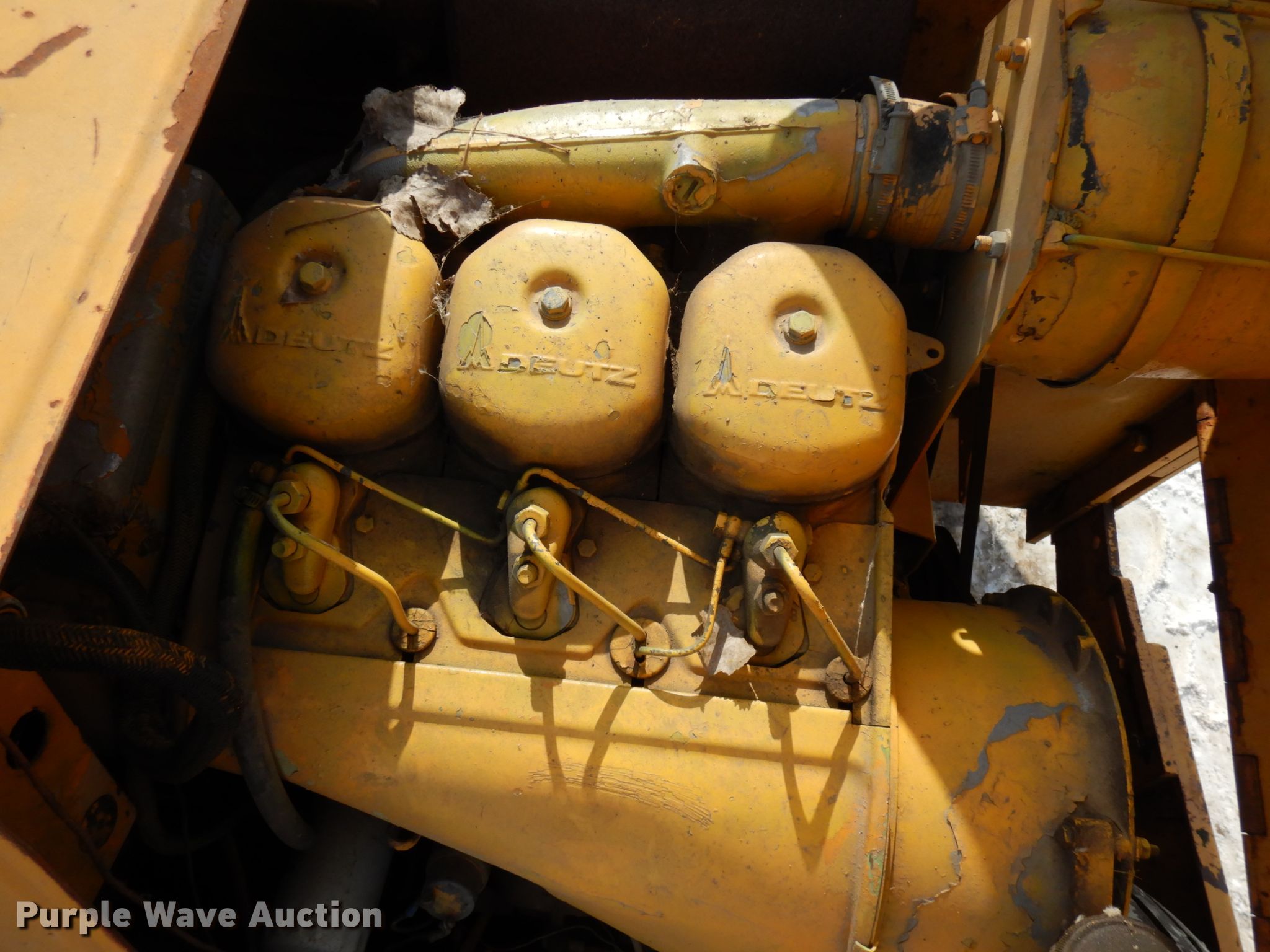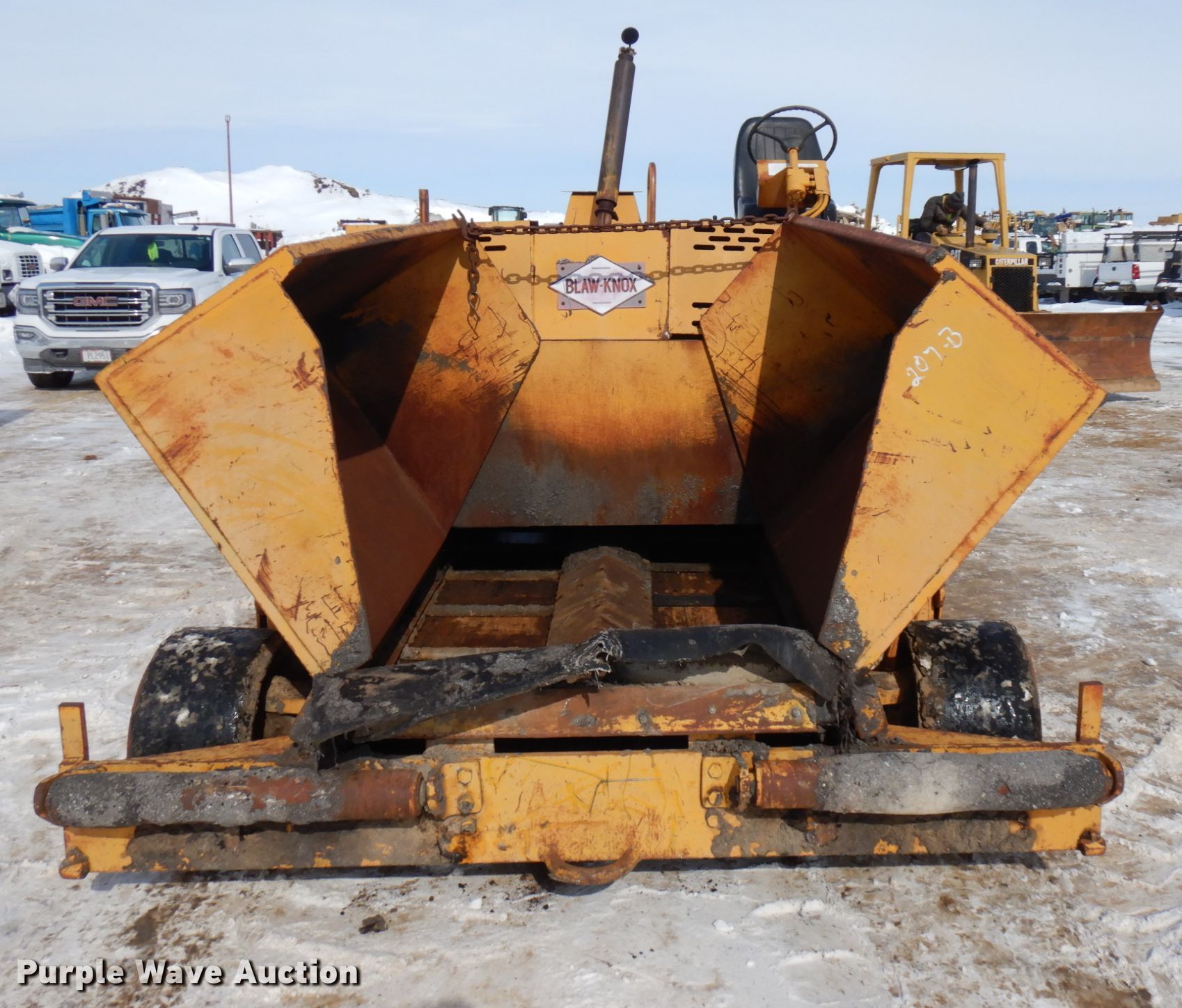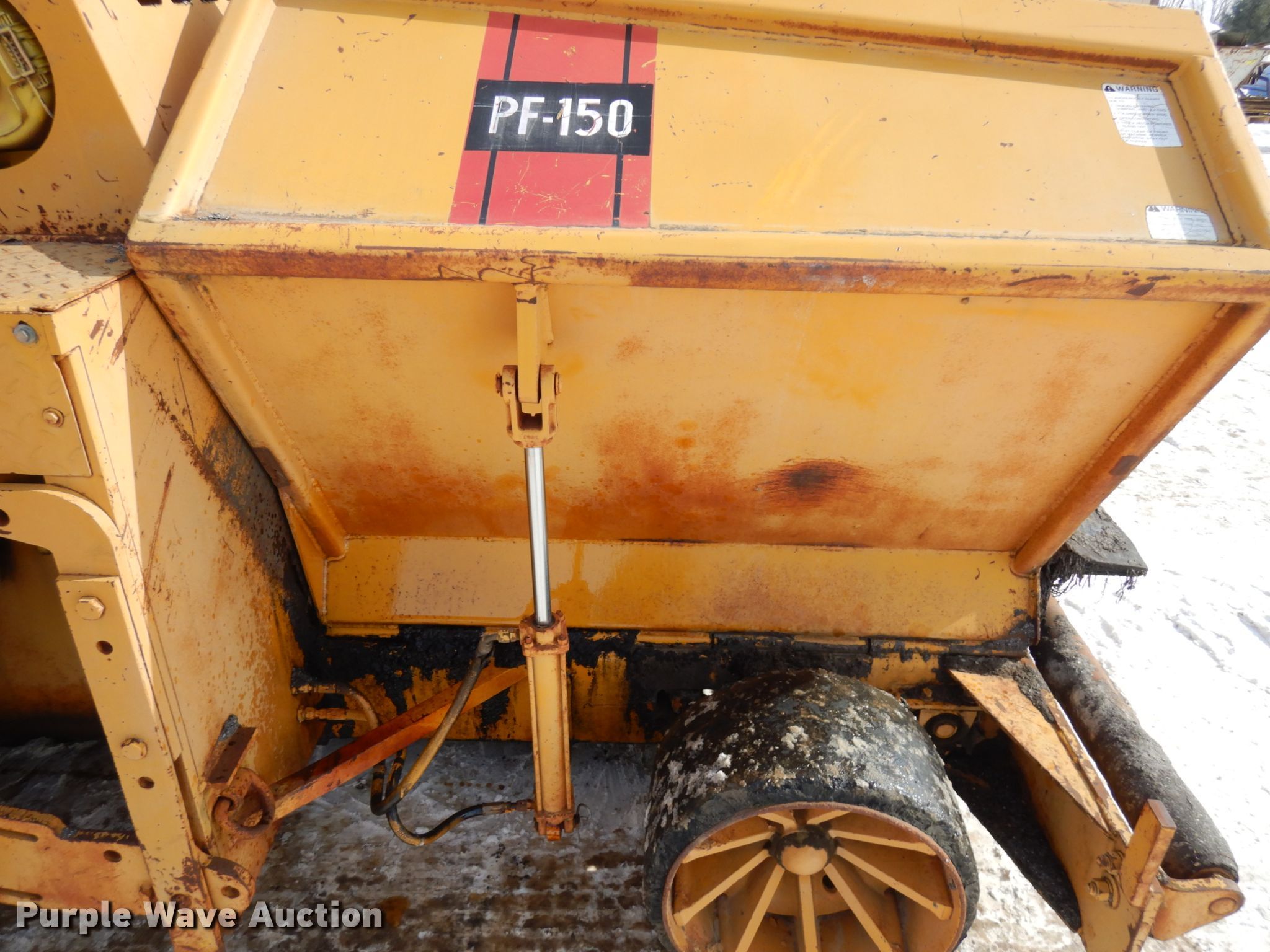 1988 Blaw Knox PF150 paver. 253 hours on meter, Serial: 15001-05. Engine Duetz, Cylinders: 3, Fuel type: Diesel. Transmission Hydrostatic. Operational Screed, Paving width: 8' to 16', Extensions: 2, Screed heater: Propane, Front spread hopper width: 10', Material conveyor Width: 48". Tires Size: 14-20DT. Notes Opener hydraulic leak. Owen's Excavating & Trenching, Inc.. 1194 N. Hwy 80. Hazel Green, WI 53811