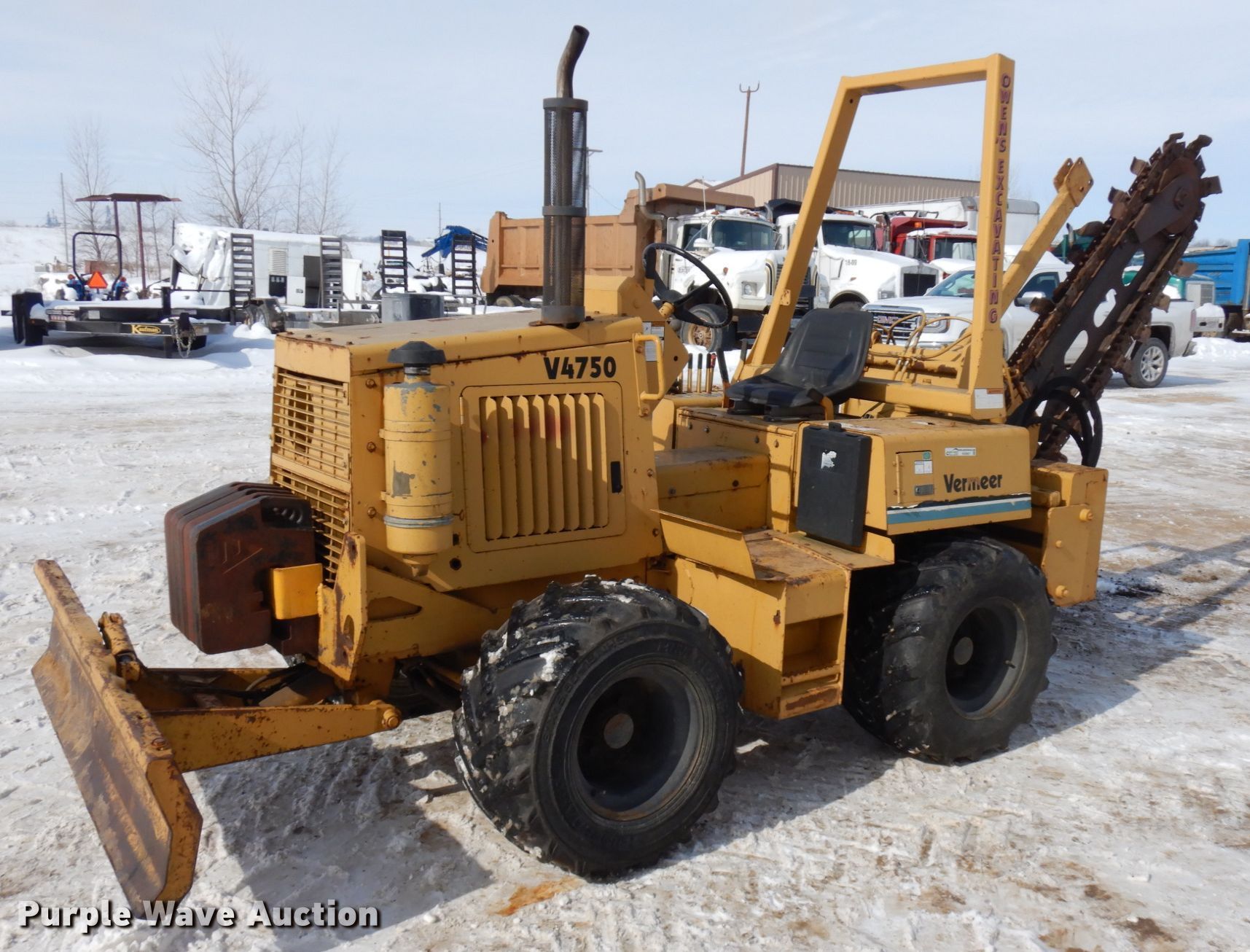 1994 Vermeer V4750 trencher. 1,620 hours on meter, Serial: 1VRL082P5R1000413. Engine Duetz, Cylinders: 4, Fuel type: Diesel. Transmission Hydrostatic. Operational Trencher Model: V1650, Serial: 1VRL070R4S1000875, Estimated dig depth: 80", Cutting width: 6", Sideshift, Backfill blade Width: 64". Tires Size: 31X15.50-15. Owen's Excavating & Trenching, Inc.. 1194 N. Hwy 80. Hazel Green, WI 53811