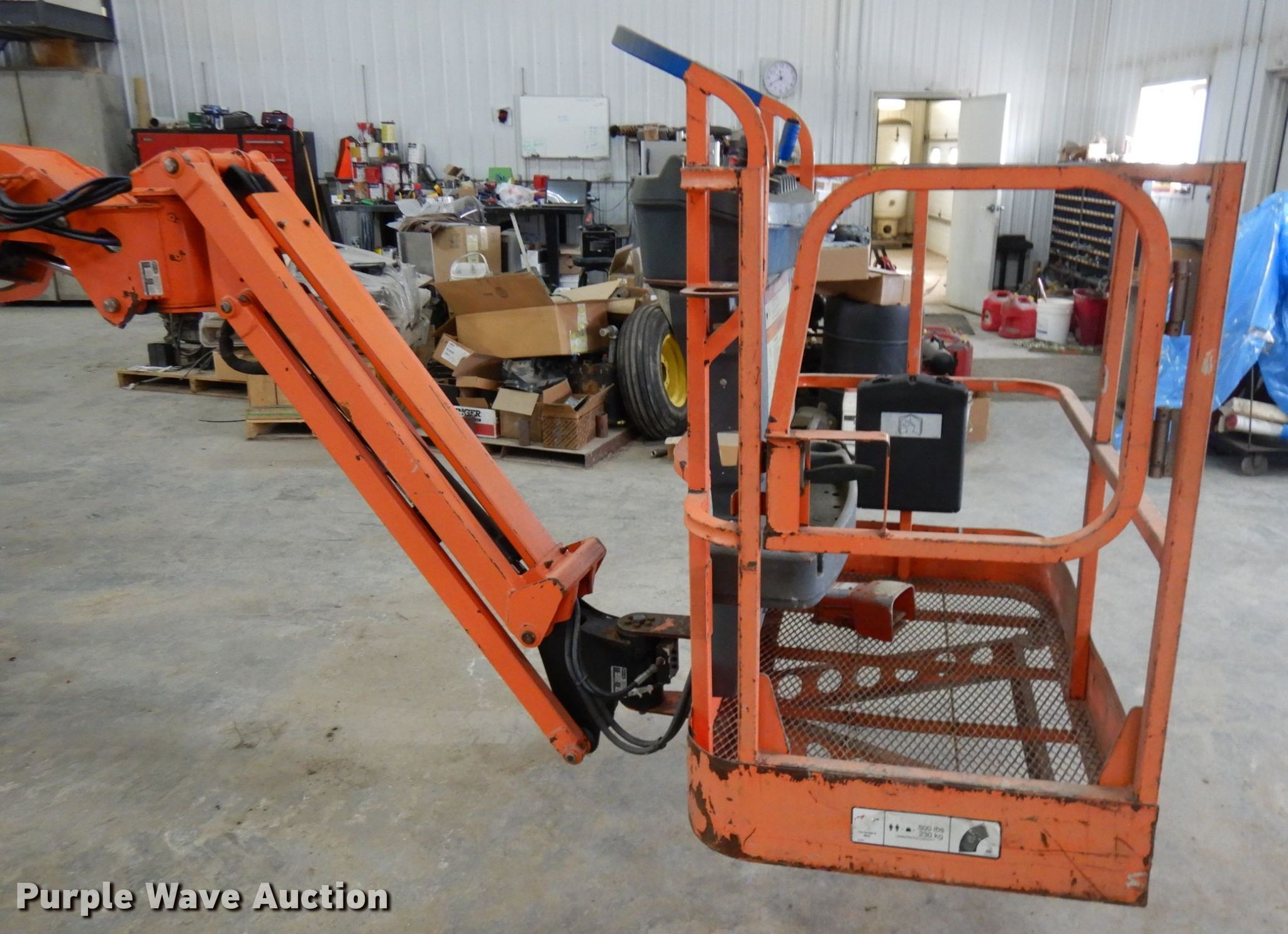 2007 JLG E300AJP boom lift. 717 hours on meter, Serial: 0300107064. Electric Motor Serial: 07074563, Volts AC: 120, Volts DC: 48. Operational Articulating boom, Maximum lift capacity: 500 lbs, Maximum reach length: 20', Maximum lift height: 30', Platform: 48" L x 30" W, Controls: Platform, Ground, Platform extensions: Powered, Platform rotation: Hydraulic. Tires Tire size: 25X6.75, Solid. Ryan Manufacturing Inc.. 14570 370th St. Goodhue, MN 55027