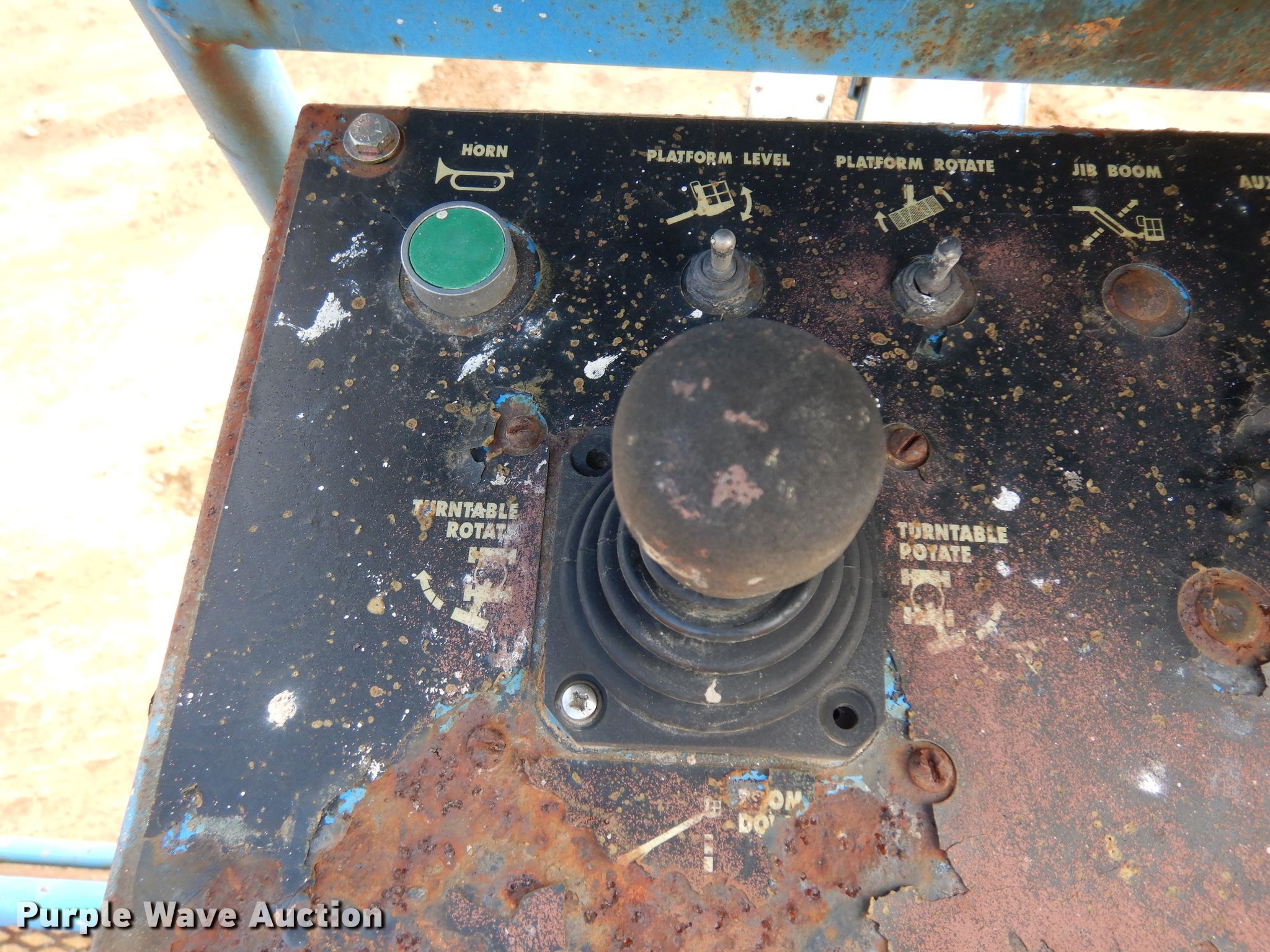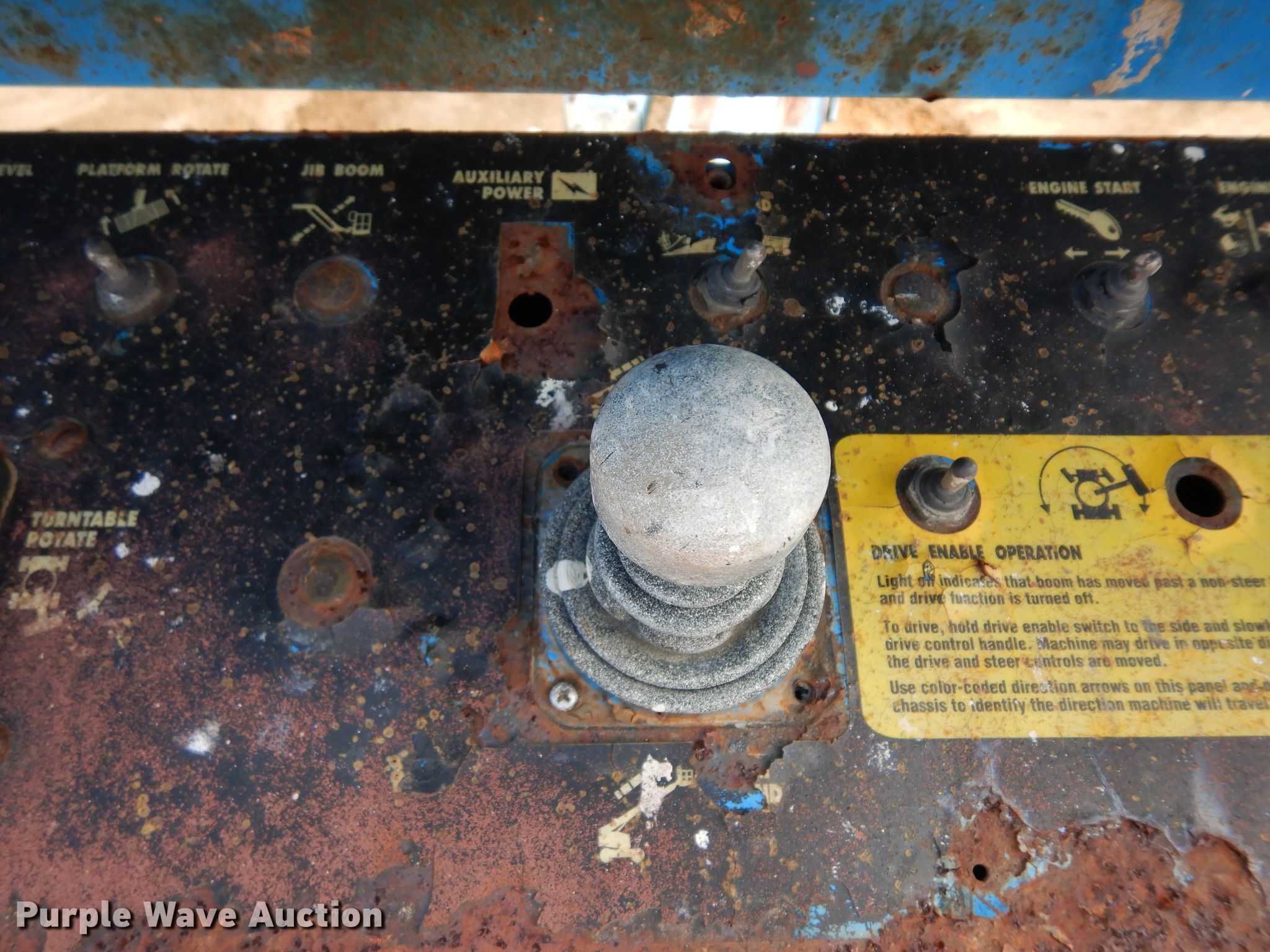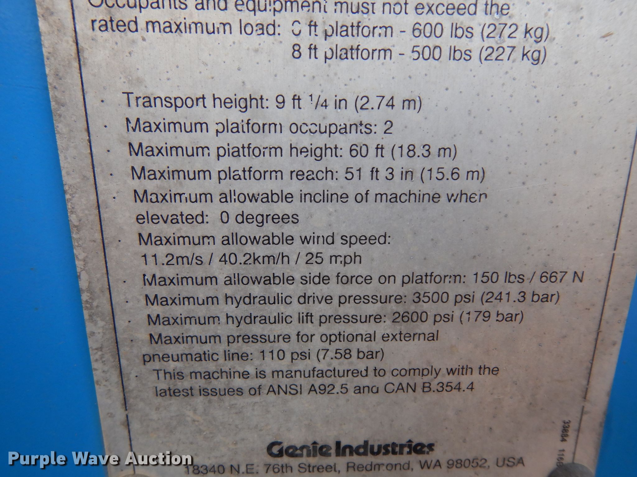 1998 Genie S60 boom lift. 5,814 hours on meter, Serial: 2855. Engine Cylinders: 4, Fuel type: Gas. Chassis Four wheel drive. Operational Rough terrain, Maximum lift capacity: 600 lbs, Maximum reach length: 51' 3", Maximum lift height: 60', Hydraulic leveling, Platform: 96" L x 36" W, AC power outlet, Controls: Platform, Ground, Platform rotation: Manual. Tires Tire size: 15-19.5. Notes Non-operational unit. Crawford Equipment, Inc.. Mayfield, KY 42066