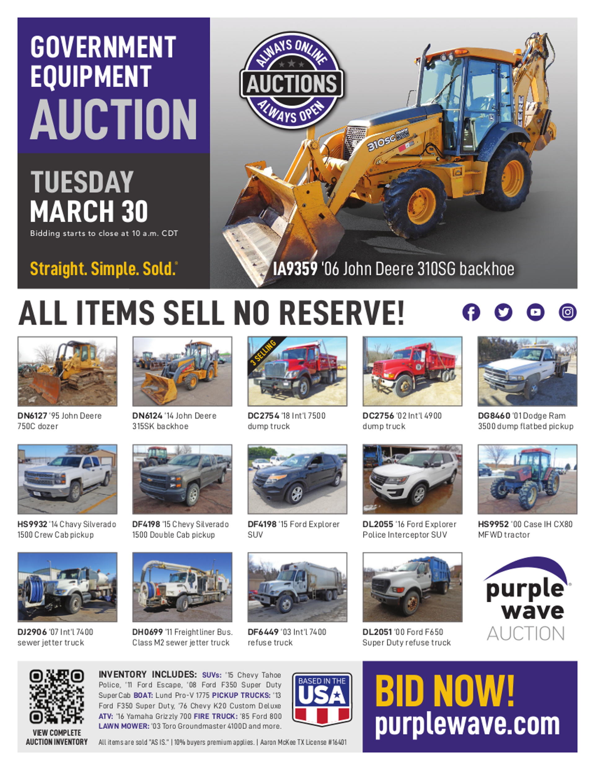 This auction is conducted by Purple Wave, Inc., whose home office is 825 Levee Drive, Manhattan, Kansas. Aaron McKee, Texas auctioneer license # 16401, operates Purple Wave, Inc. Complaints against us may be directed to the Texas Department of Licensing and Regulation, P.O. Box 12157, Austin, Texas 78711, (512) 463-6599. For additional required information, see the attached document.