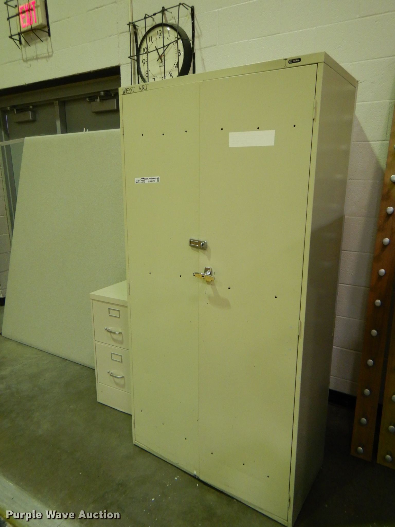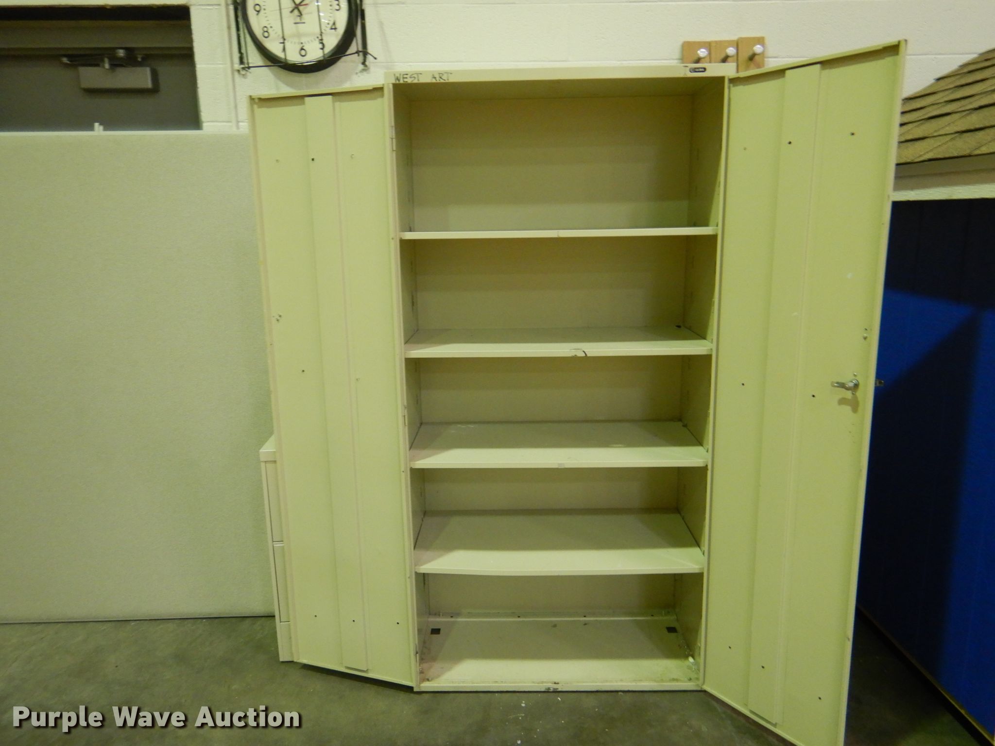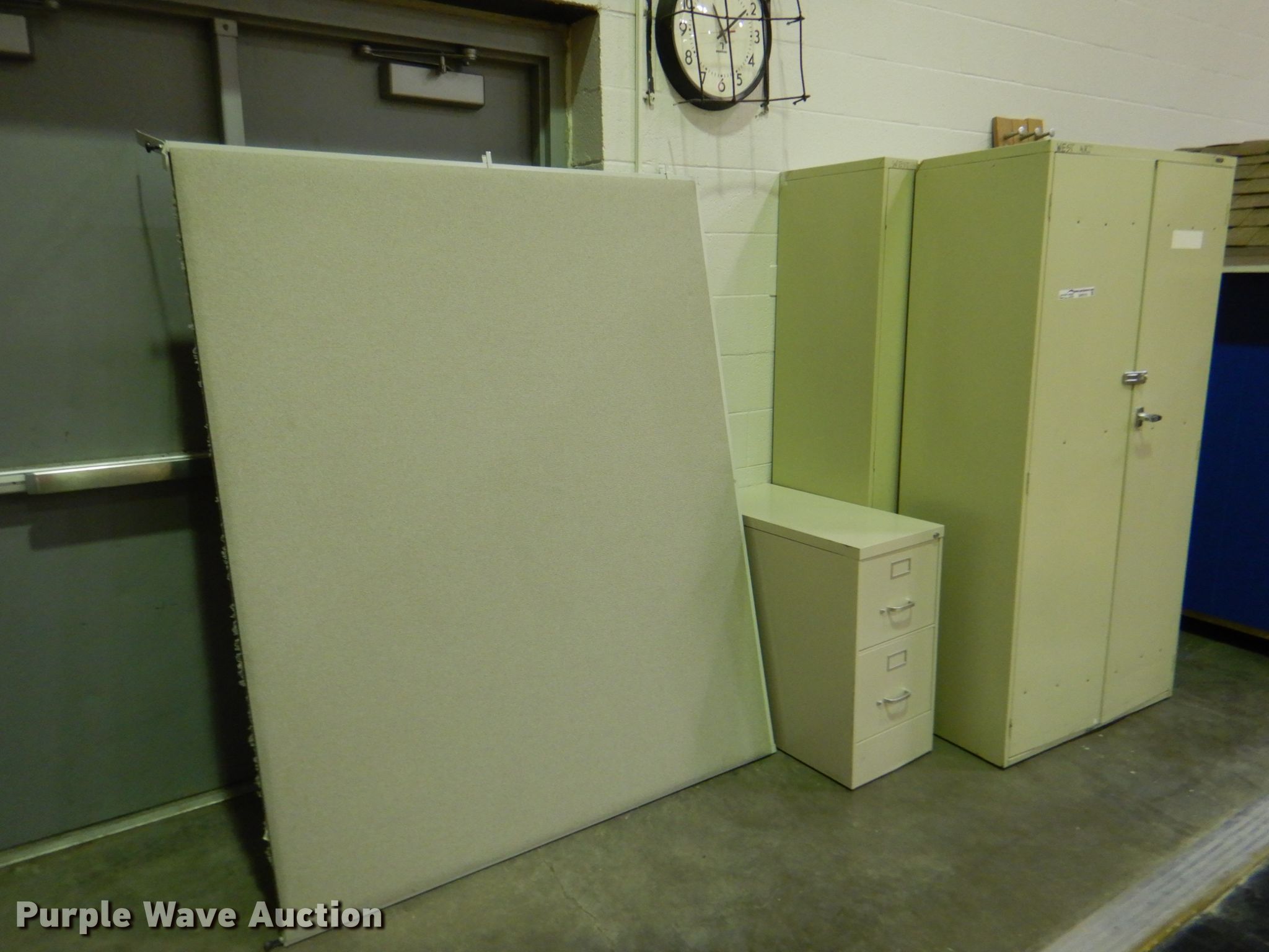 Purple Wave is selling a used Furniture in Kansas. This item is a Furniture with the following: 61" x 72.5" bulletin board, Leg missing, Two drawer metal file cabinet, 15" x 29.5" x 30", (2) metal cabinet, 36" x 72" x 18", (4) adjustable shelves, (3) wood racks, 84" x 4", (14) pegs