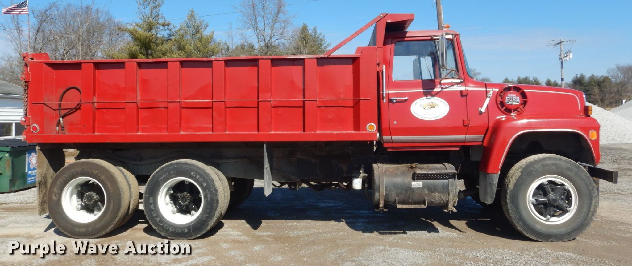 1978 Ford 800 dump truck. 131,432 actual miles. Engine Ford, Displacement: 475 C.I.D., Cylinders: 8, Fuel type: Gas. Transmission Manual, Speed: 20. Chassis Axles: Tandem, Differential lock: Inter-axle, Suspension: Spring over walking beam, Brakes: Hydraulic, PTO, GVWR: 44,800 lbs FAWR: 10,860 lbs, IAWR: 17,000 lbs, RAWR: 17,000 lbs, Wheelbase: 208". Interior Heat. Operational Dump bed 15' L x 96" W, Side height: 36", Bed type: Steel, Ram: Dual, End gate: Manual. Tires Front: 315/80R22.5, Rear: 11R22.5. Illinois title. Title distribution may be delayed up to 30 days from verification of funds. T81JVDC5291. Dodd Township. 14821 E Bakerville Rd. Mount Vernon, IL 62864