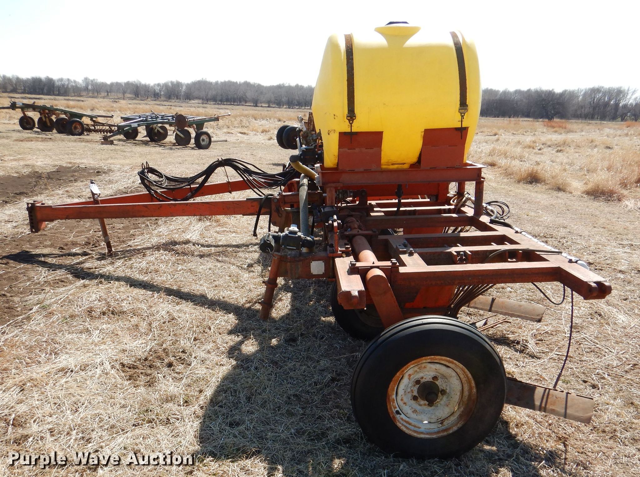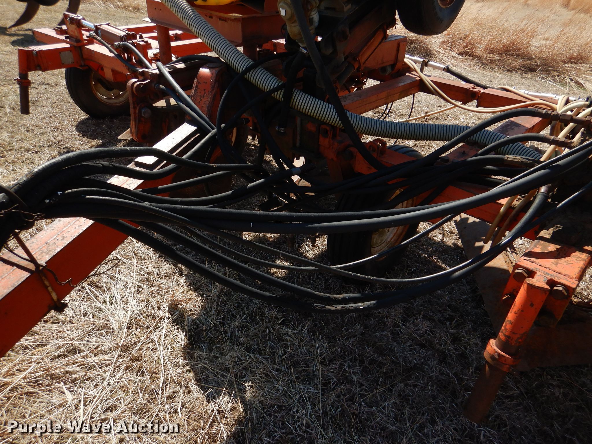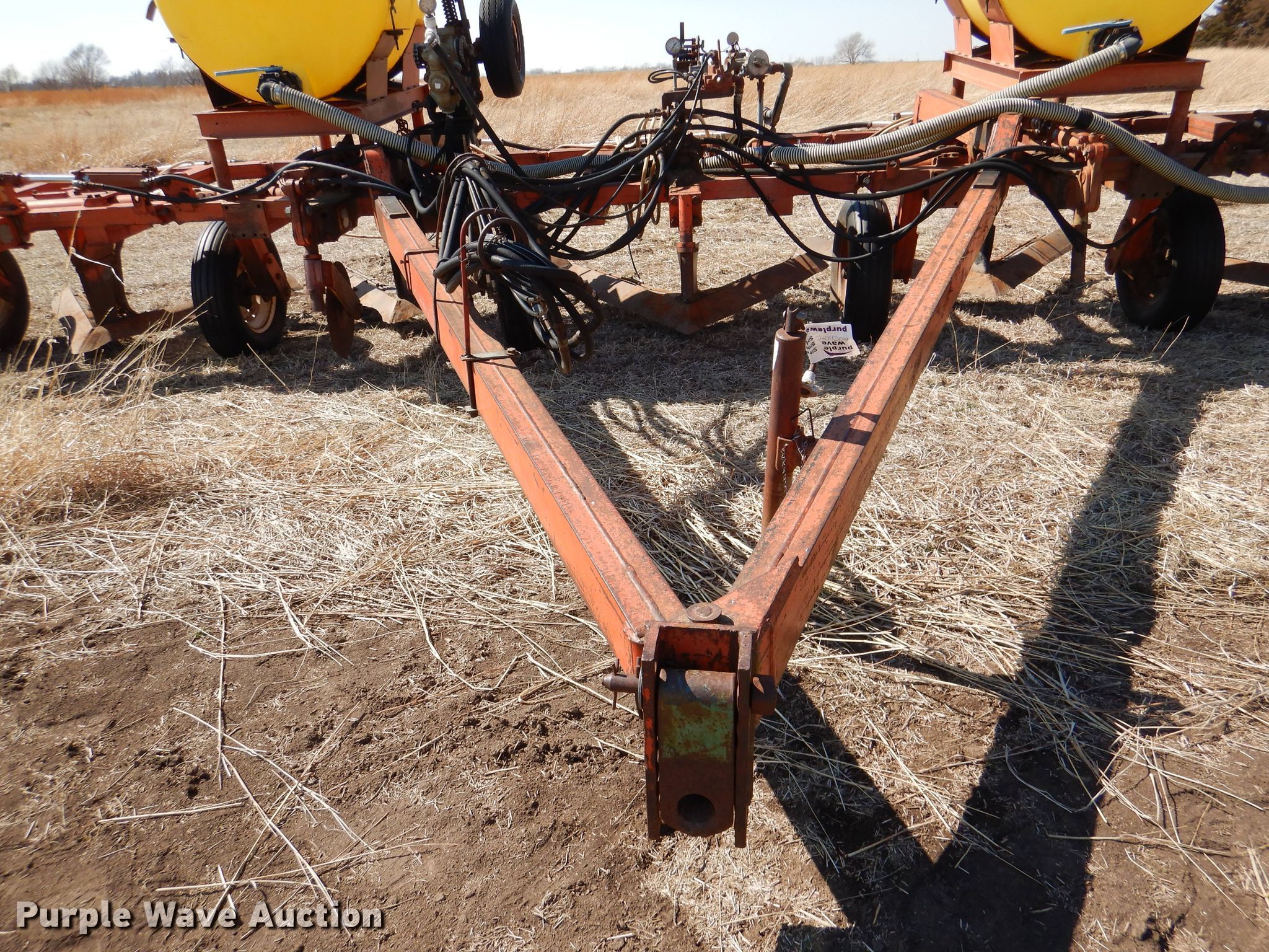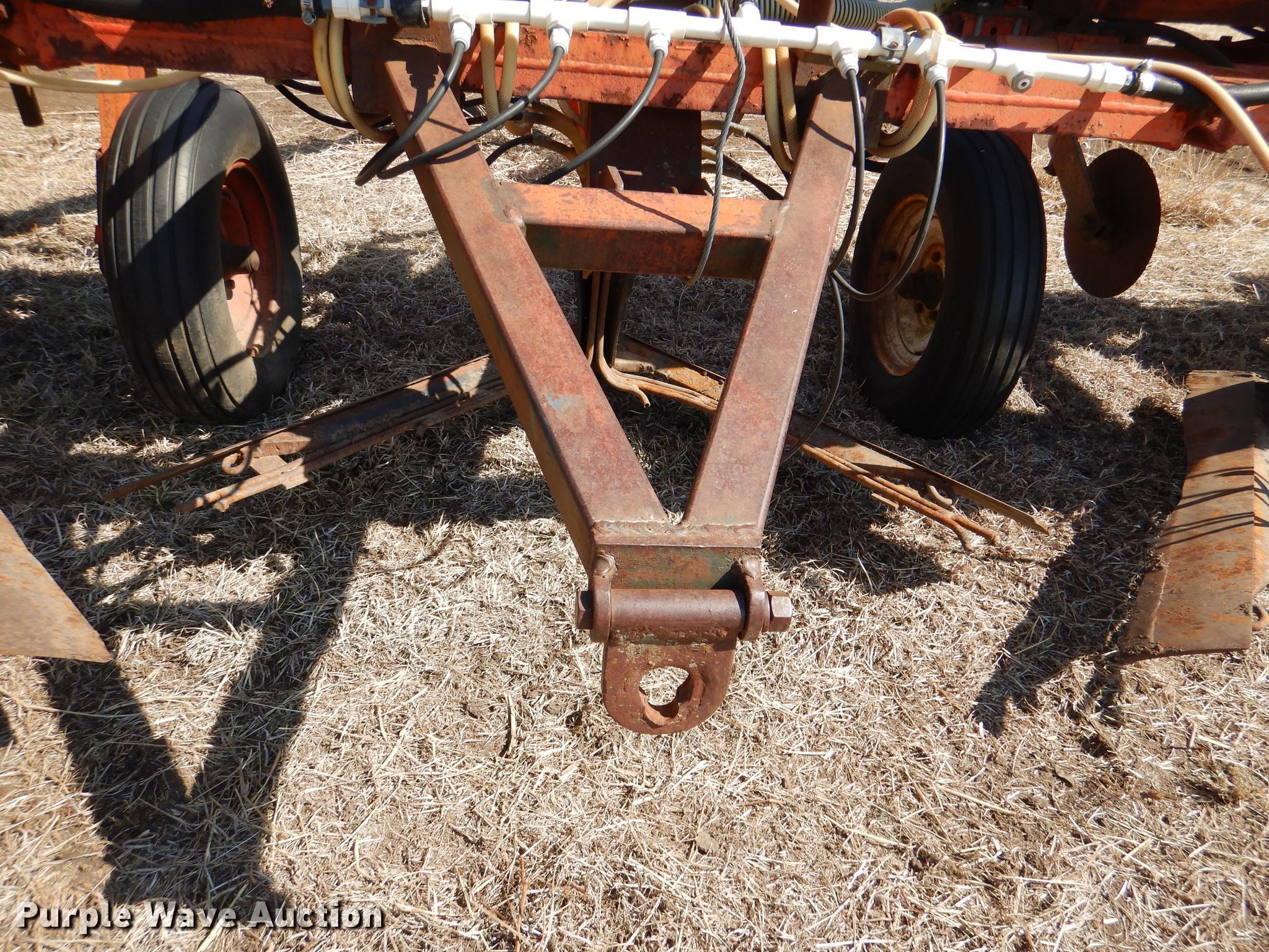 Richardson sweep plow. Overall width: 24' 6". Operational Hydraulic fold, Hydraulic lift, Liquid fertilizer Capacity: 400 gallons, NH3 hookups, Rear hitch, Shanks: 5, Sweep width: 5' 6", Blade diameter Front: 16". Tires Tire size: 7.60-15SL. Notes (3) front blades missing. Becca Farms. Sawyer, KS 67134