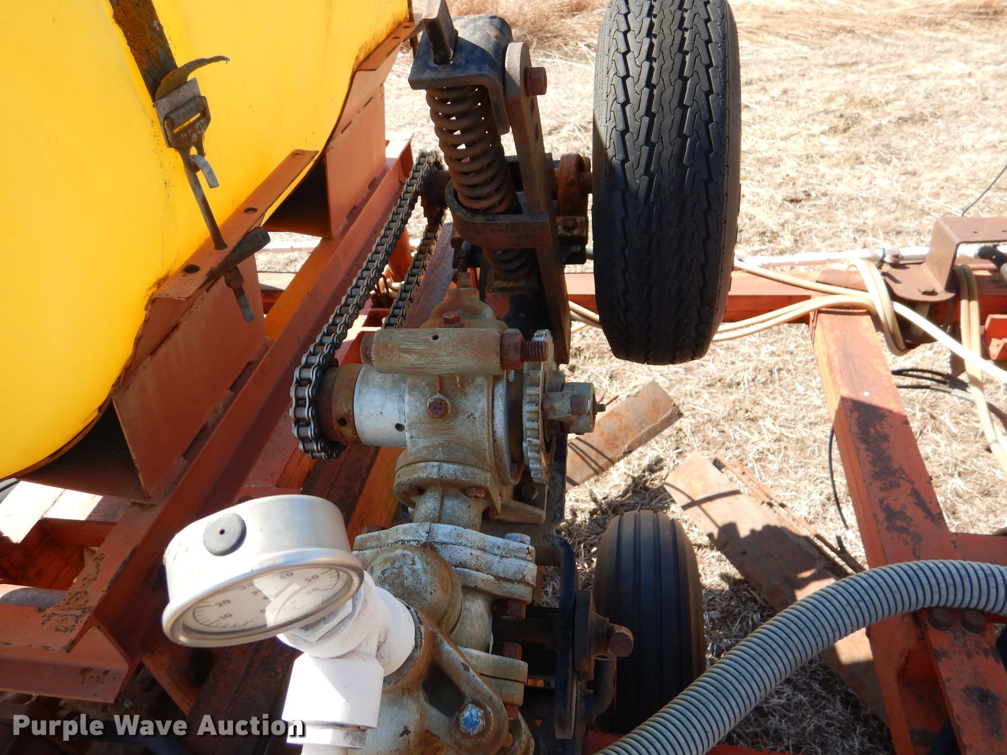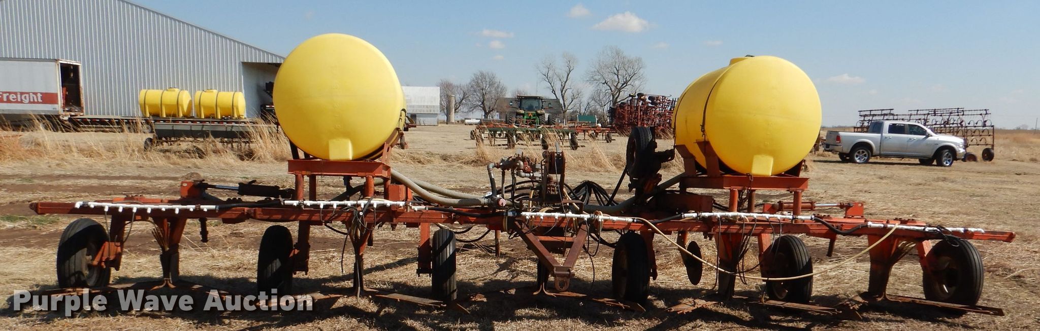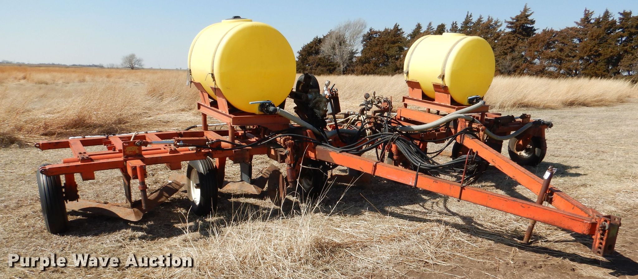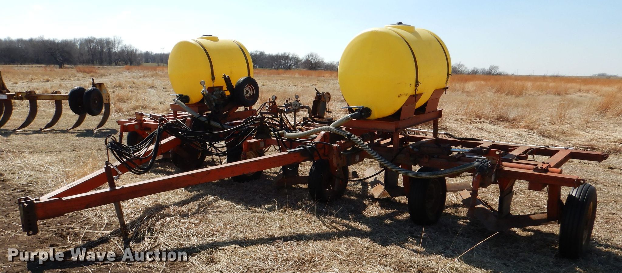 Richardson sweep plow. Overall width: 24' 6". Operational Hydraulic fold, Hydraulic lift, Liquid fertilizer Capacity: 400 gallons, NH3 hookups, Rear hitch, Shanks: 5, Sweep width: 5' 6", Blade diameter Front: 16". Tires Tire size: 7.60-15SL. Notes (3) front blades missing. Becca Farms. Sawyer, KS 67134