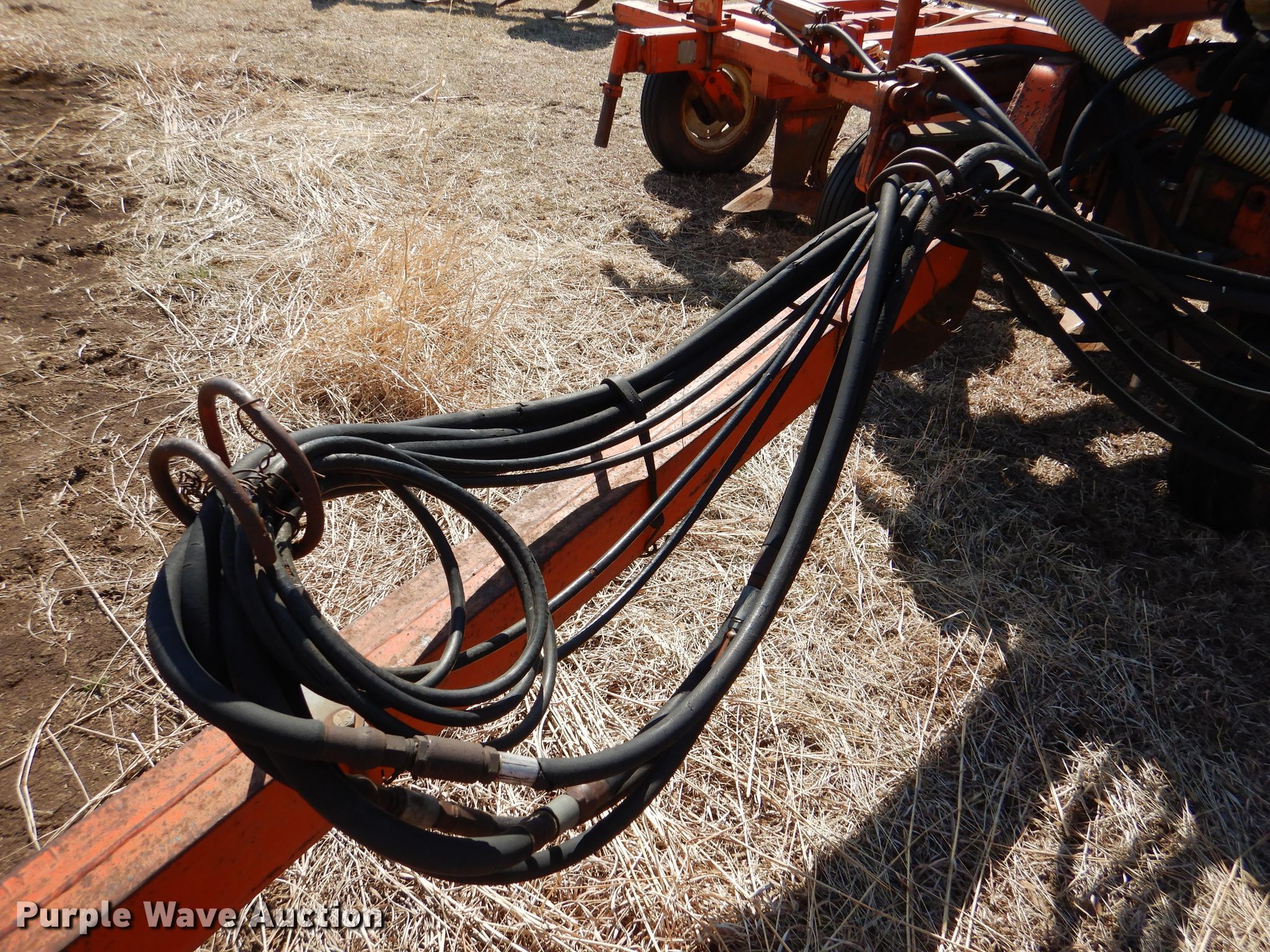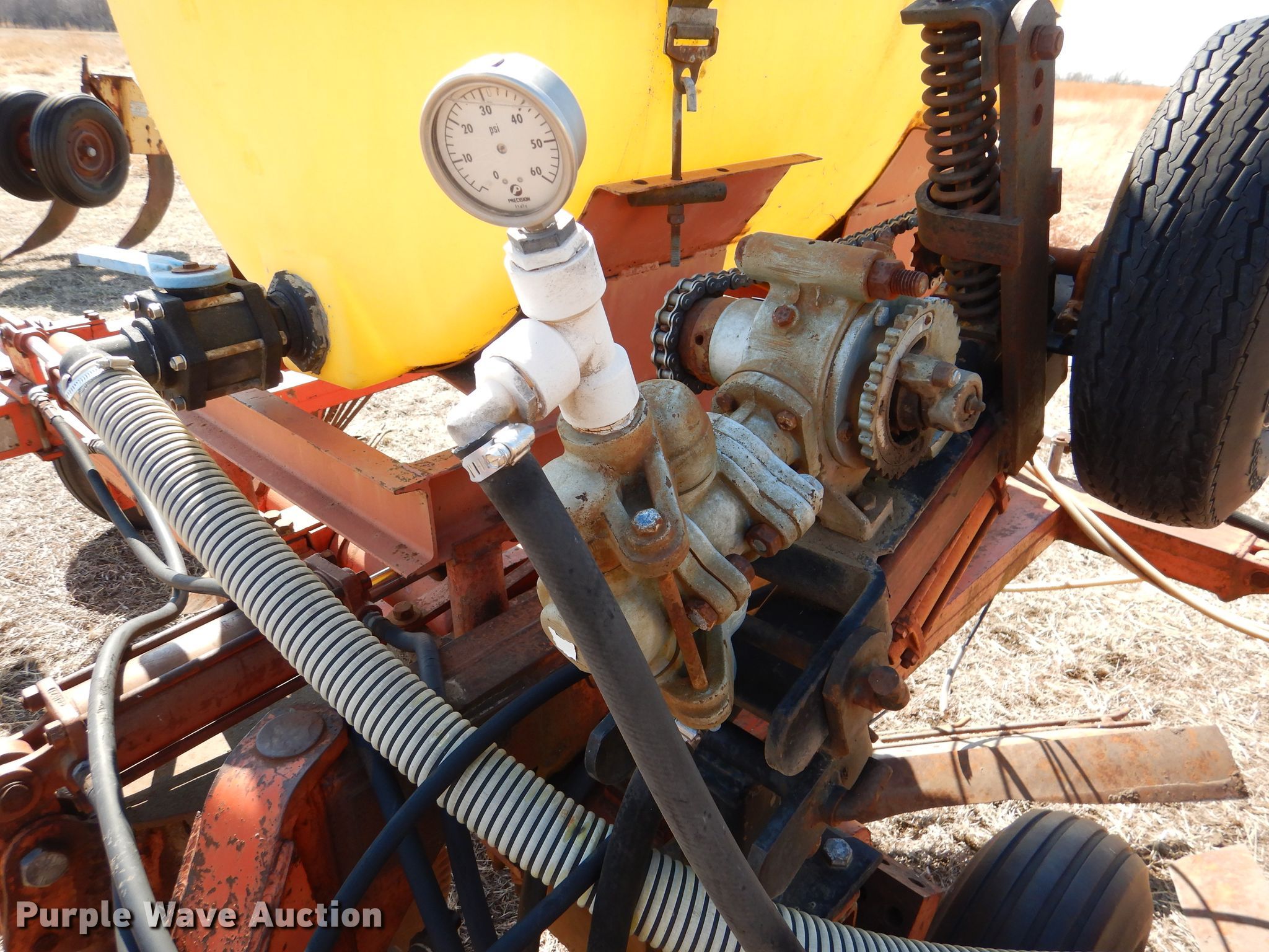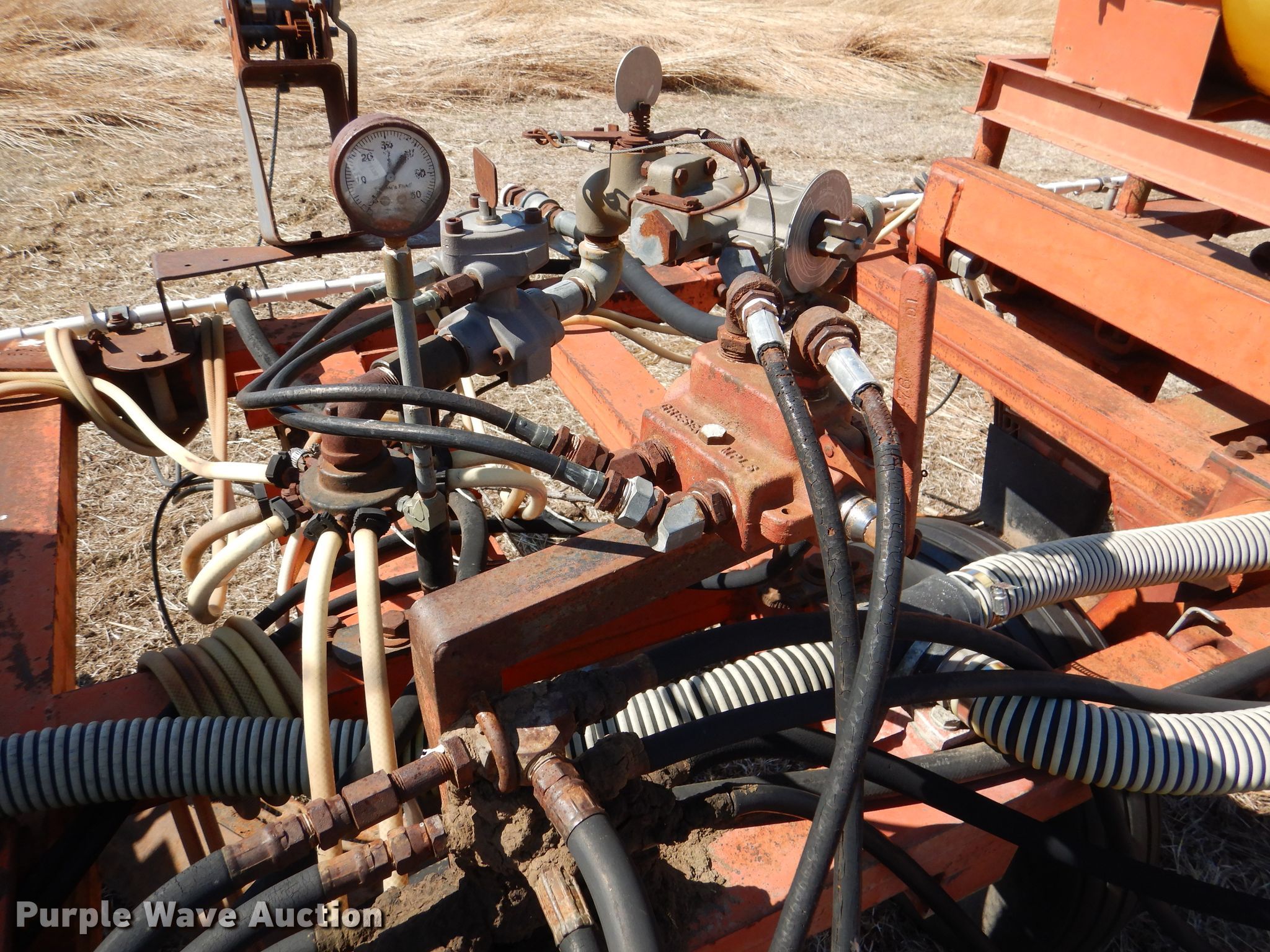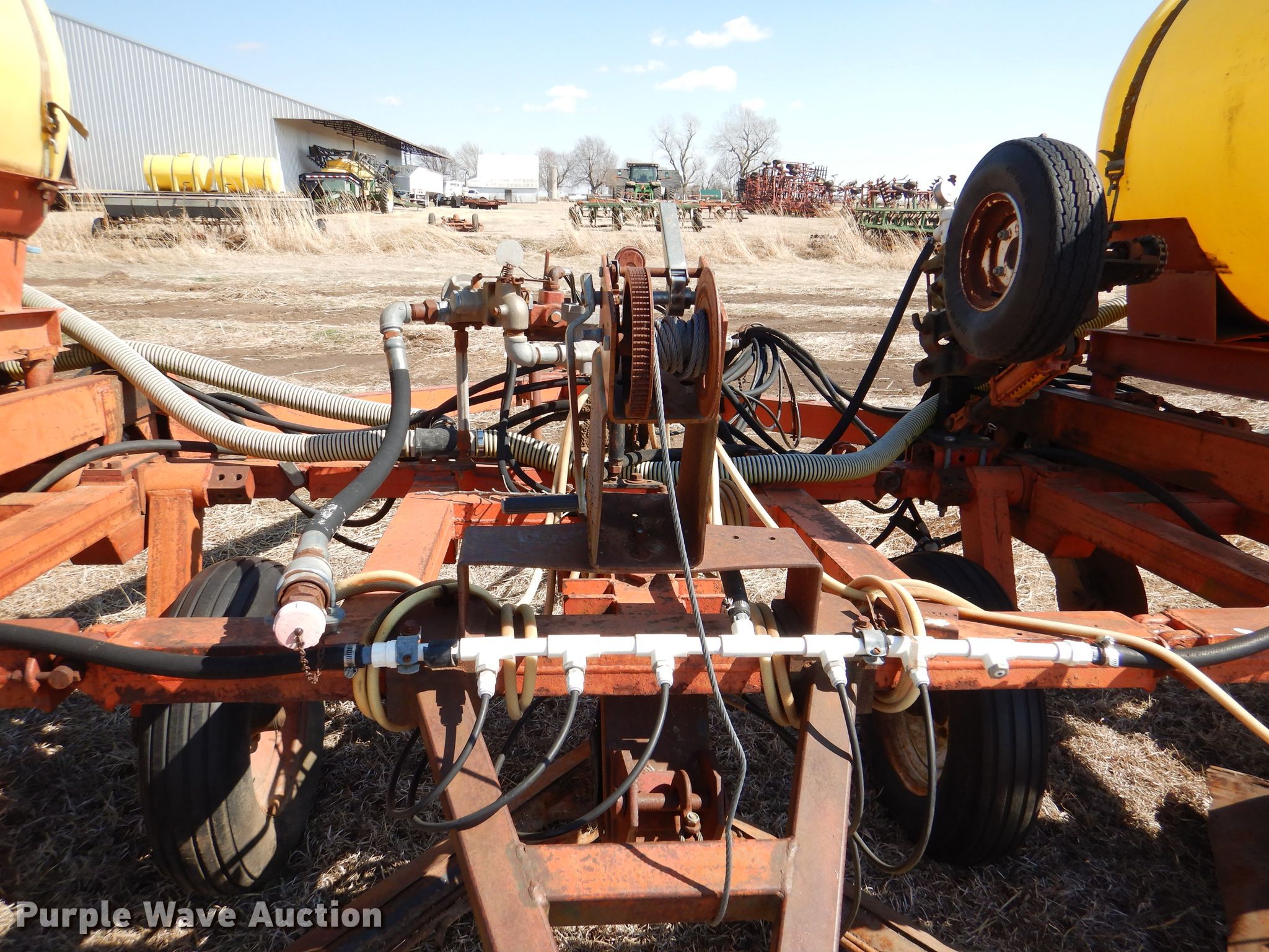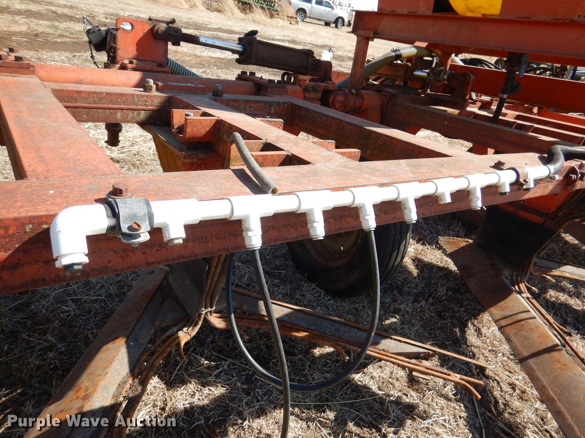 Richardson sweep plow. Overall width: 24' 6". Operational Hydraulic fold, Hydraulic lift, Liquid fertilizer Capacity: 400 gallons, NH3 hookups, Rear hitch, Shanks: 5, Sweep width: 5' 6", Blade diameter Front: 16". Tires Tire size: 7.60-15SL. Notes (3) front blades missing. Becca Farms. Sawyer, KS 67134